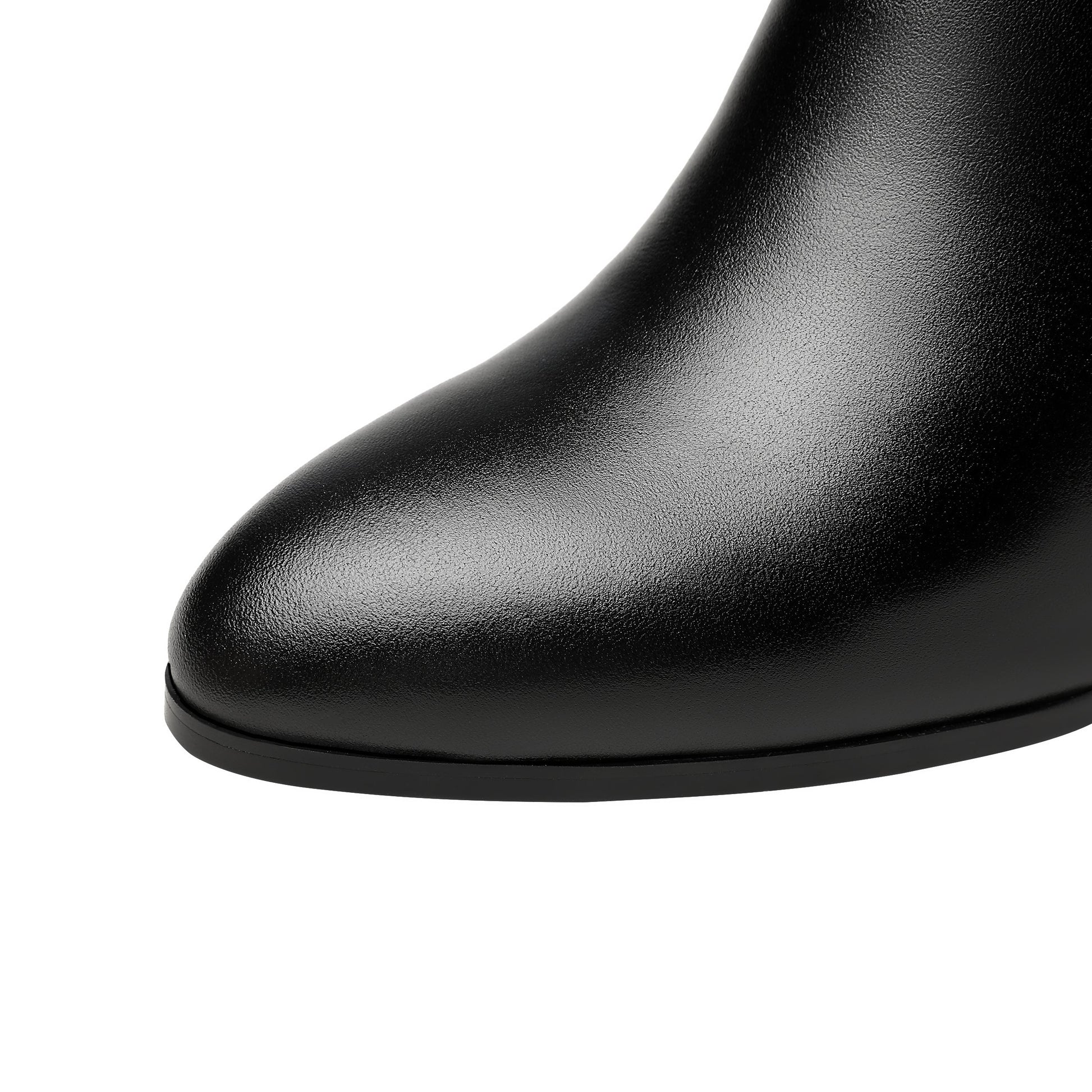 Classic ankle boots designed with genuine leather, round toe, side zip, mid chunky heel and buckle to keep up with fashion trend.