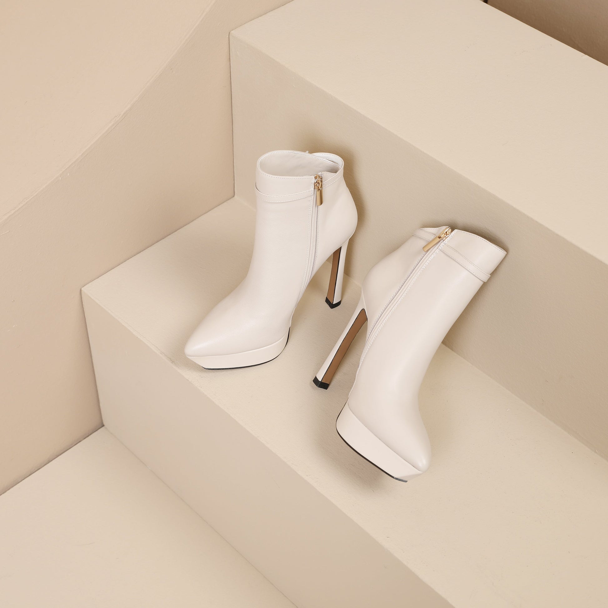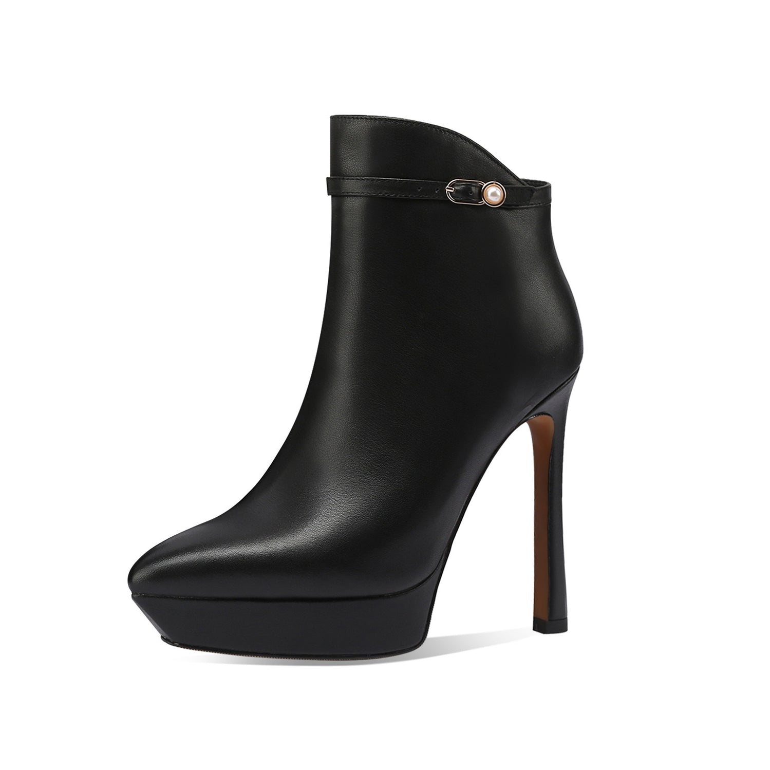 Nine Seven Handmade Women's Genuime Leather Ankle Strap Pearl Platform Side Zipper Pointed Toe High Stiletto Heel Ankle Boots