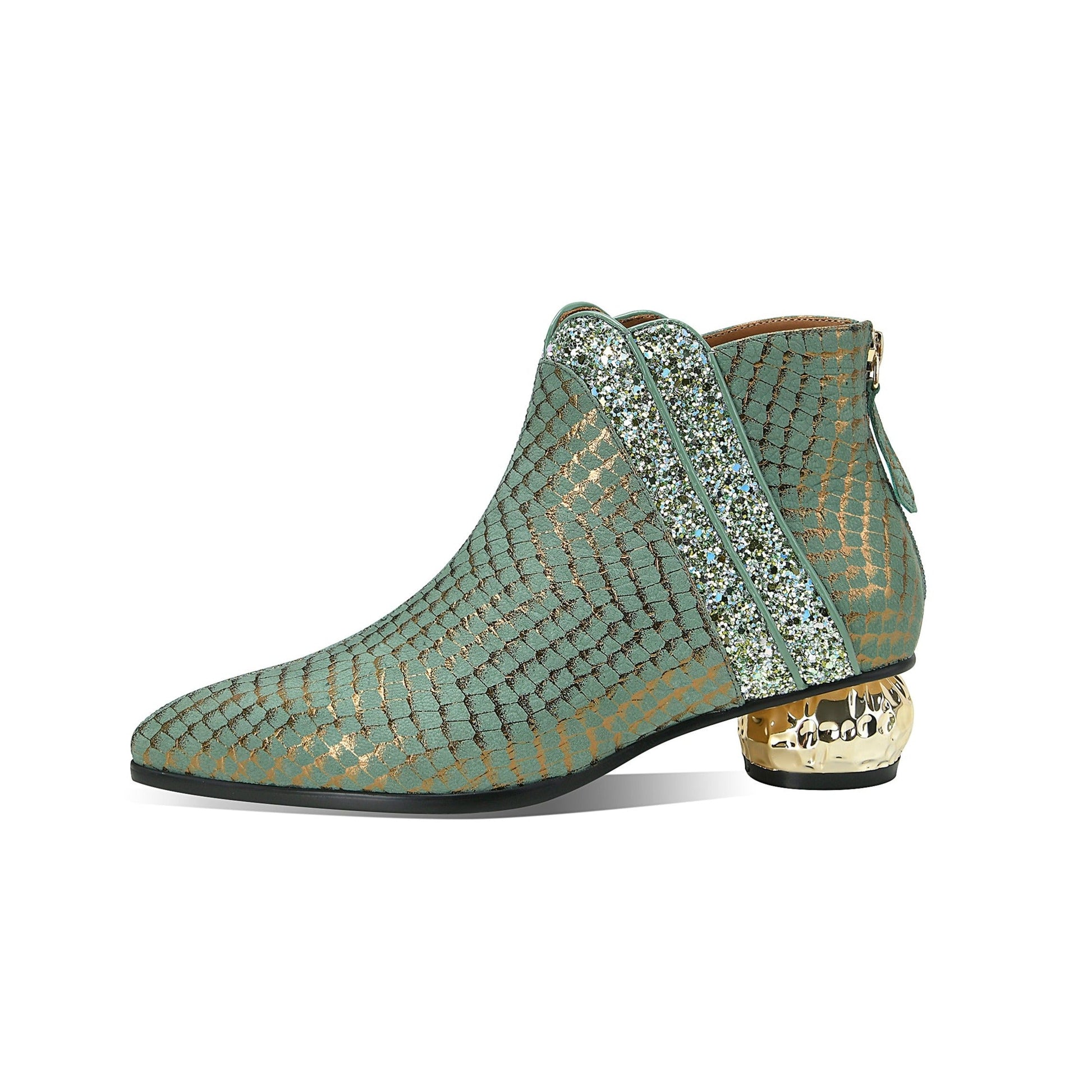 Stylish ankle boots designed with pointed toe, genuine leather, back zipper and low chunky heels can make you feel comfortable with every steps.