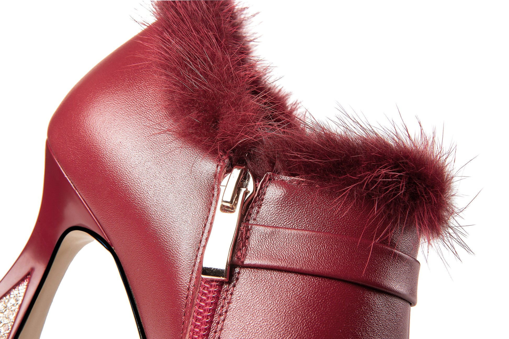 Graceful pumps are designed with genuine leather, pointed toe, fur, rhinestone and spool heel. Side zipper is convenient.It is suitable for party, club and many other occasions.