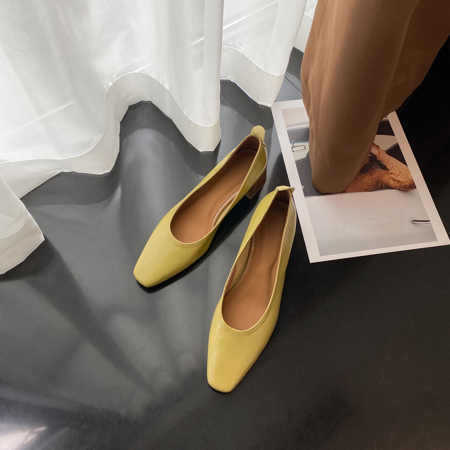 Nine Seven Women's Handmade Genuine Leather Chunky Heel Little Toe Slip On Office Pumps