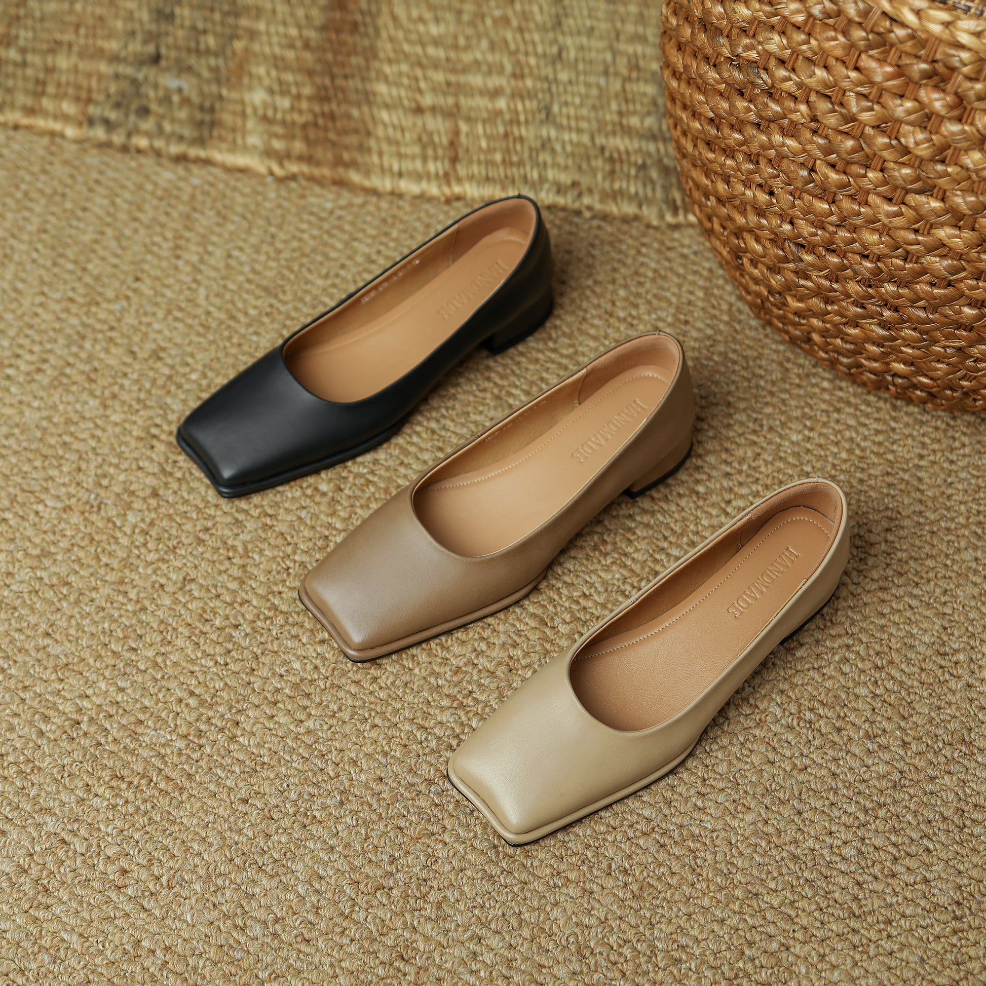 Nine Seven Women's Genuine Leather Handmade Square Toe Casual Slip on Low Chunky Heel Flat Shoes