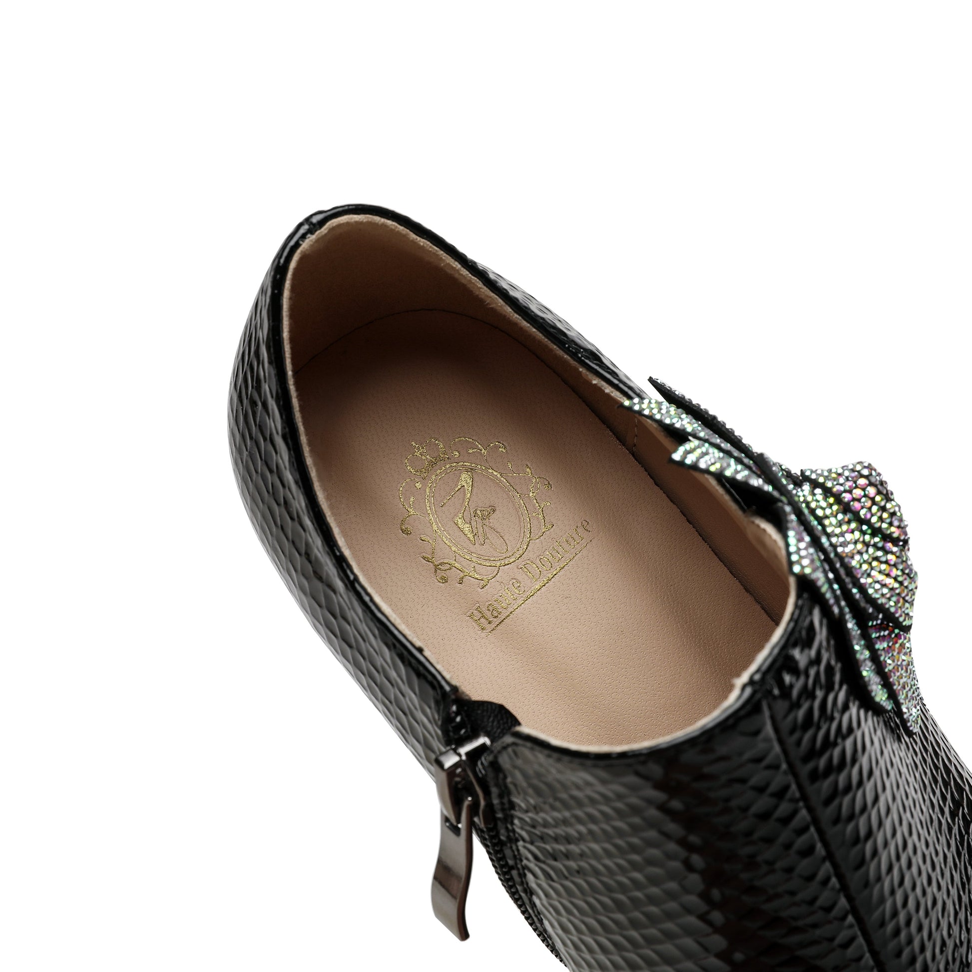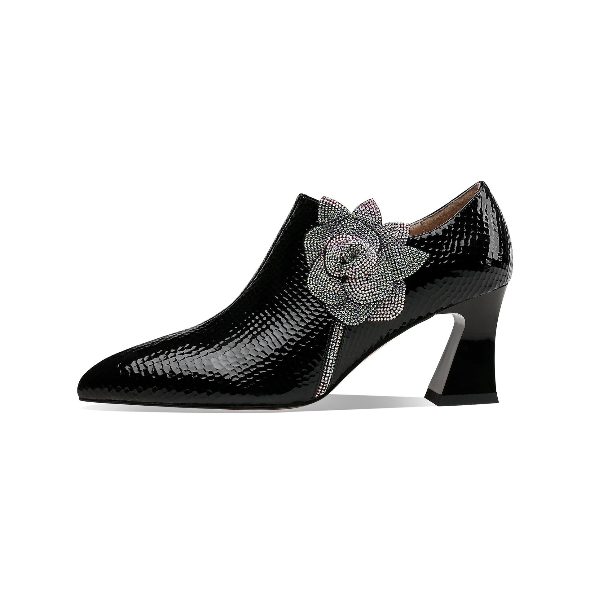 Patent leather pumps shoes designed with pointed toe, side zipper, flower décor and chunky heels to keep up with fashion trend.
