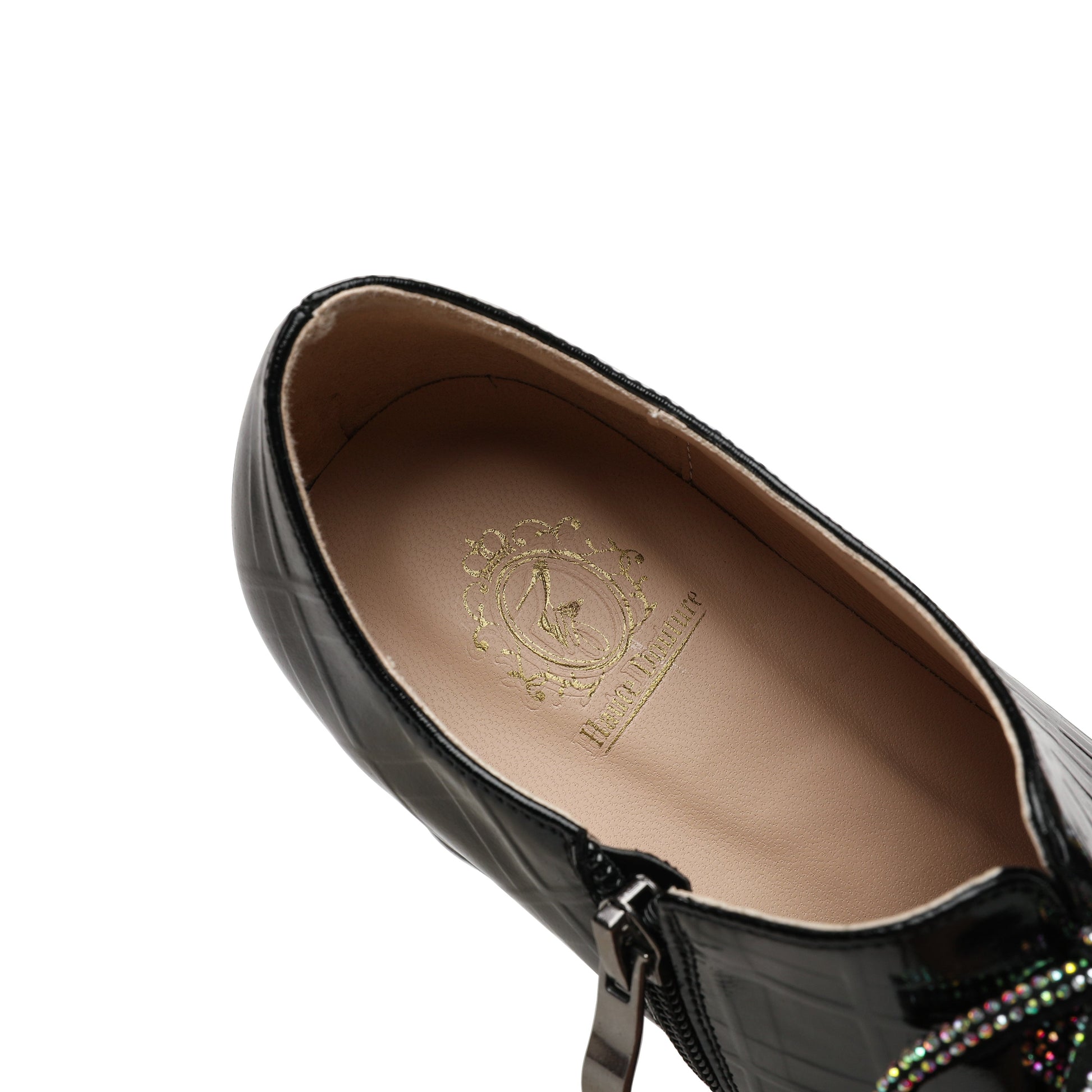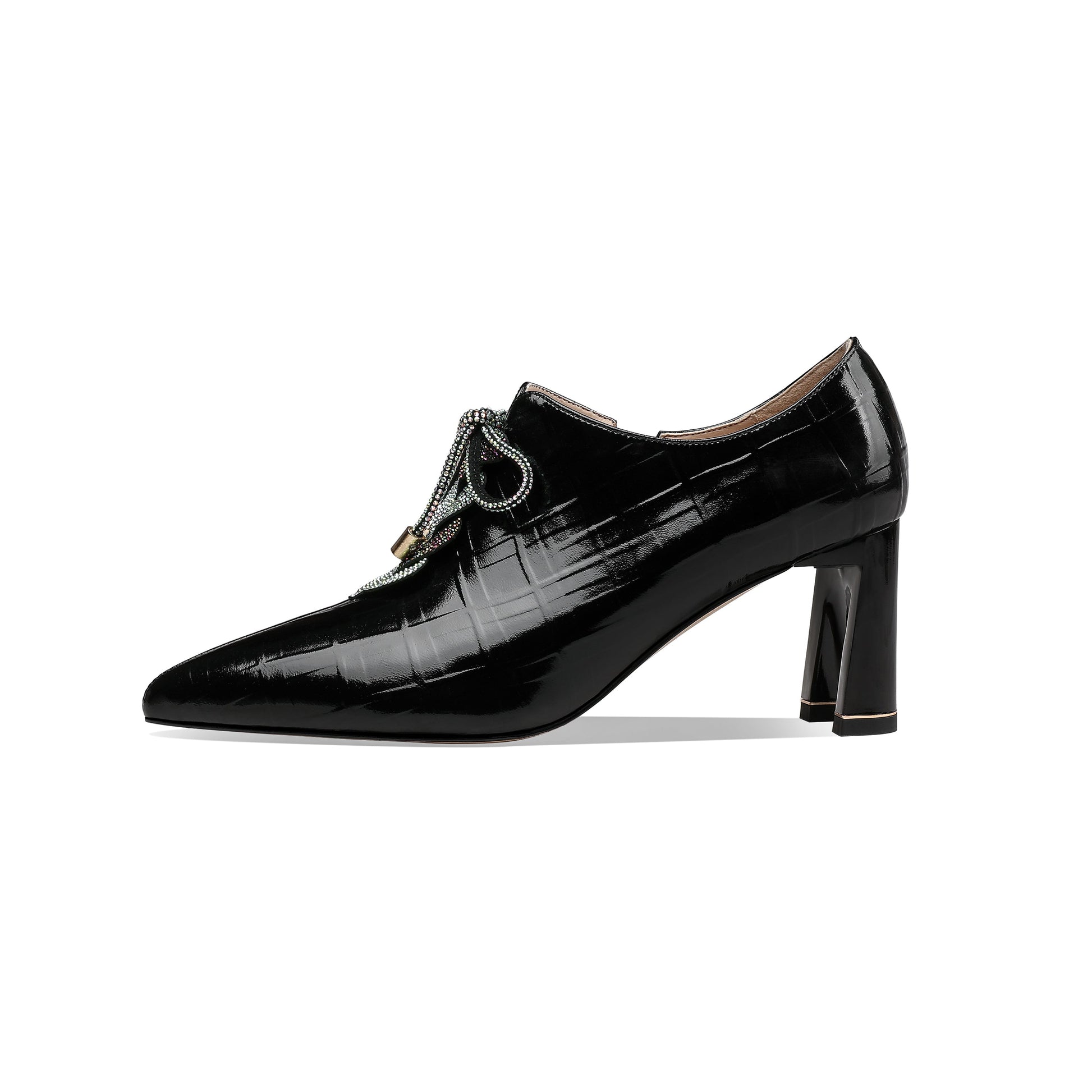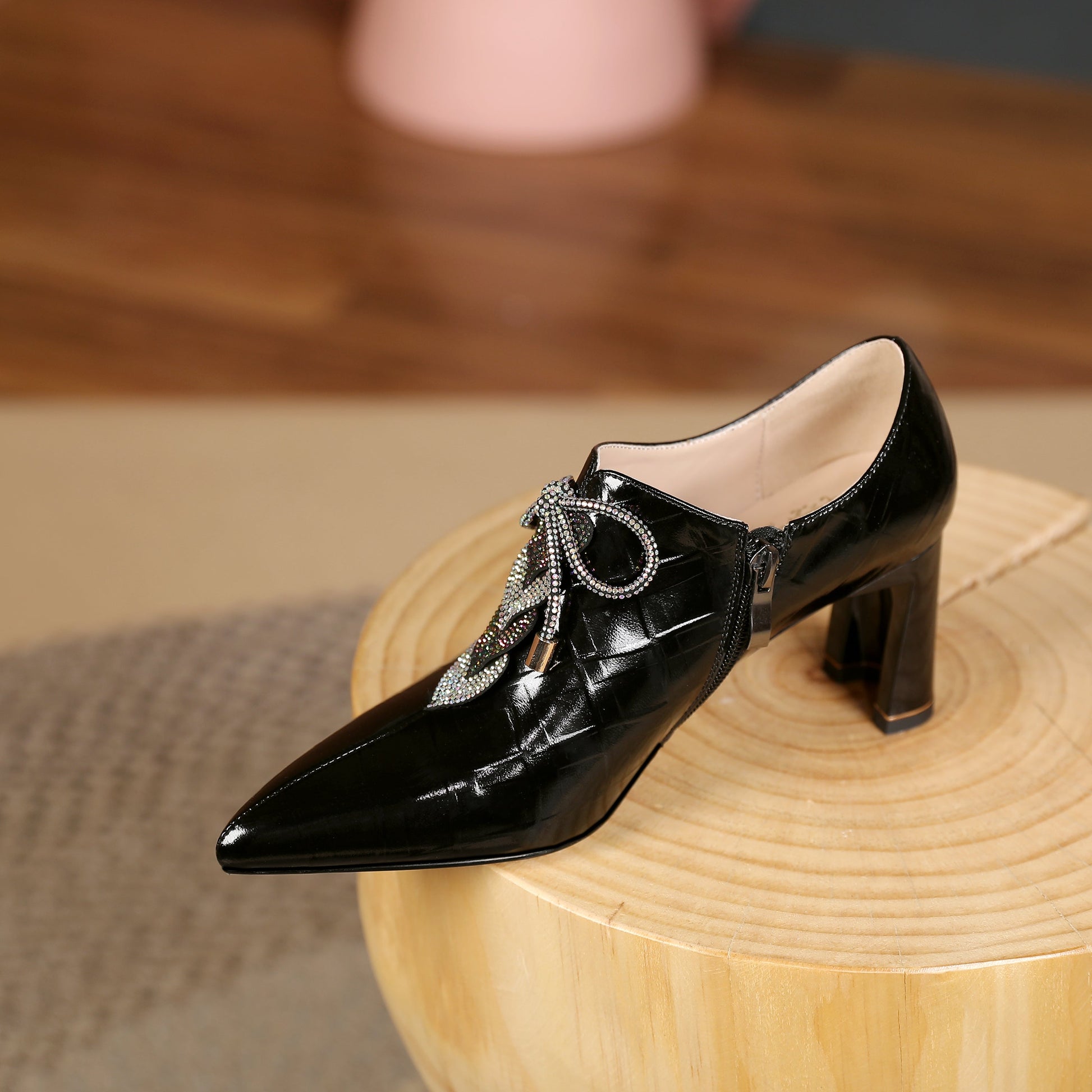Glossy patent leather pumps shoes designed with pointed toe, side zipper and chunky heels to keep up with fashion trend.