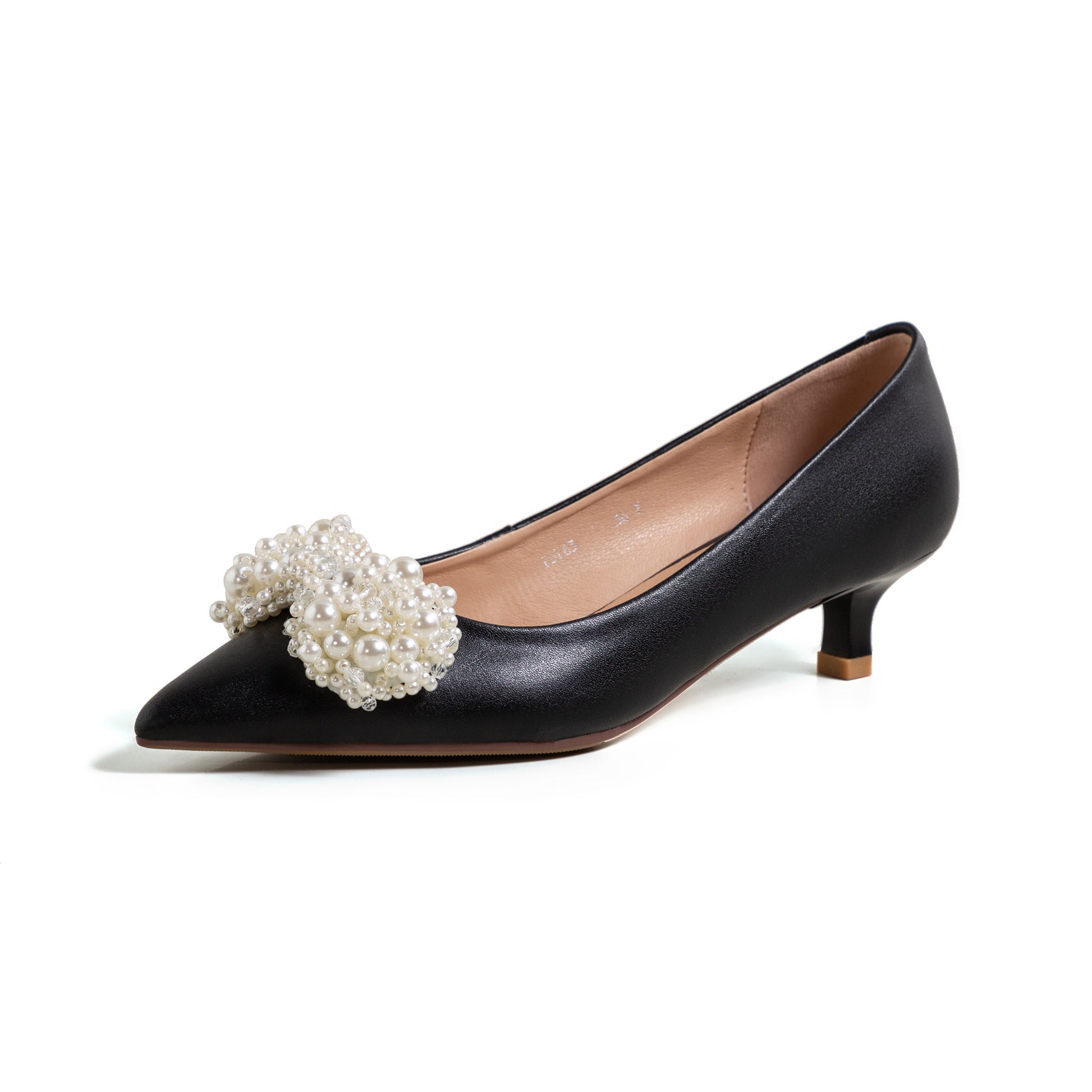 Nine Seven Genuine Leather Handmade Women's Pearl Bowknot Kitten Heel Weeding Pumps Shoes