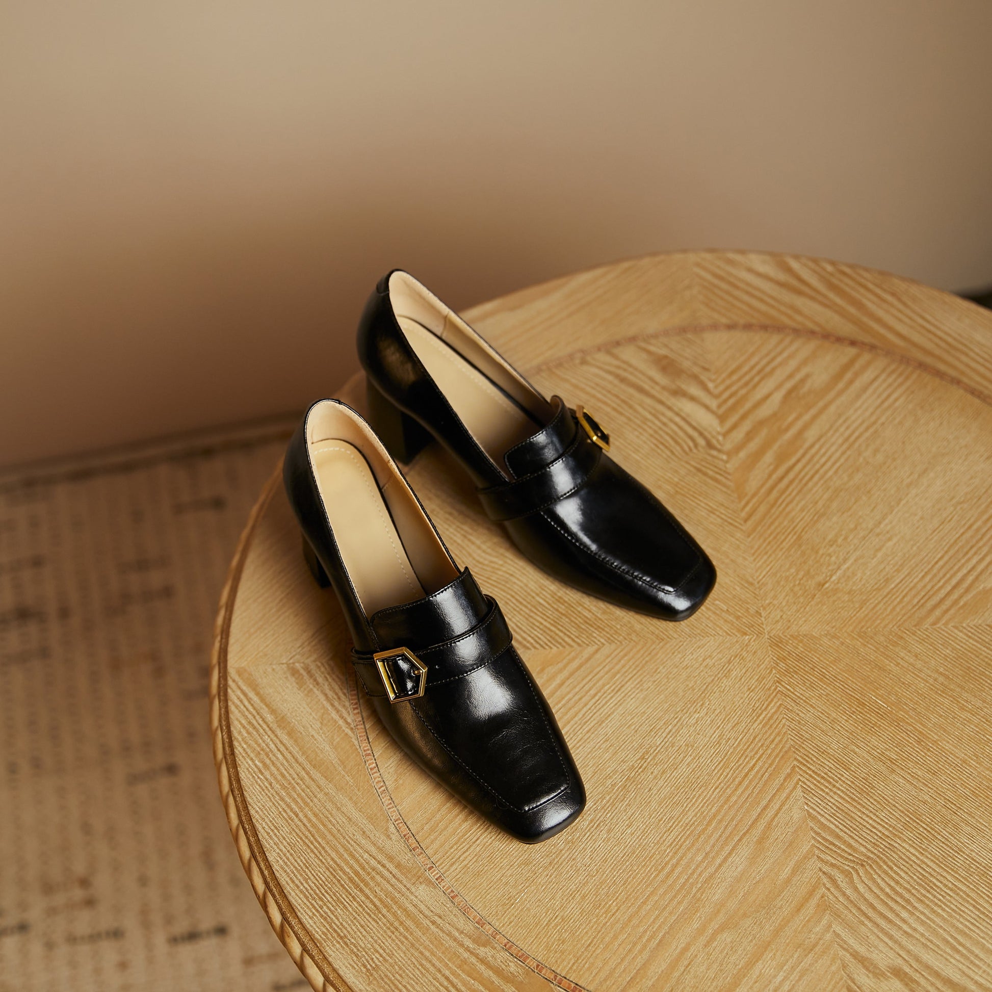 Nine Seven Genuine Leather Women's Handmade Square Toe Mid Block Heel Slip On Graceful Oxford Loafer Pumps with Cool Buckle