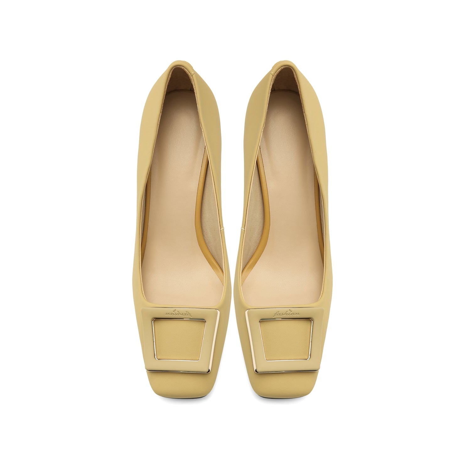 Nine Seven Women's Genuine Leather Handmade Square Toe Mid Chunky Heels Stylish Pumps Shoes with Buckle Décor