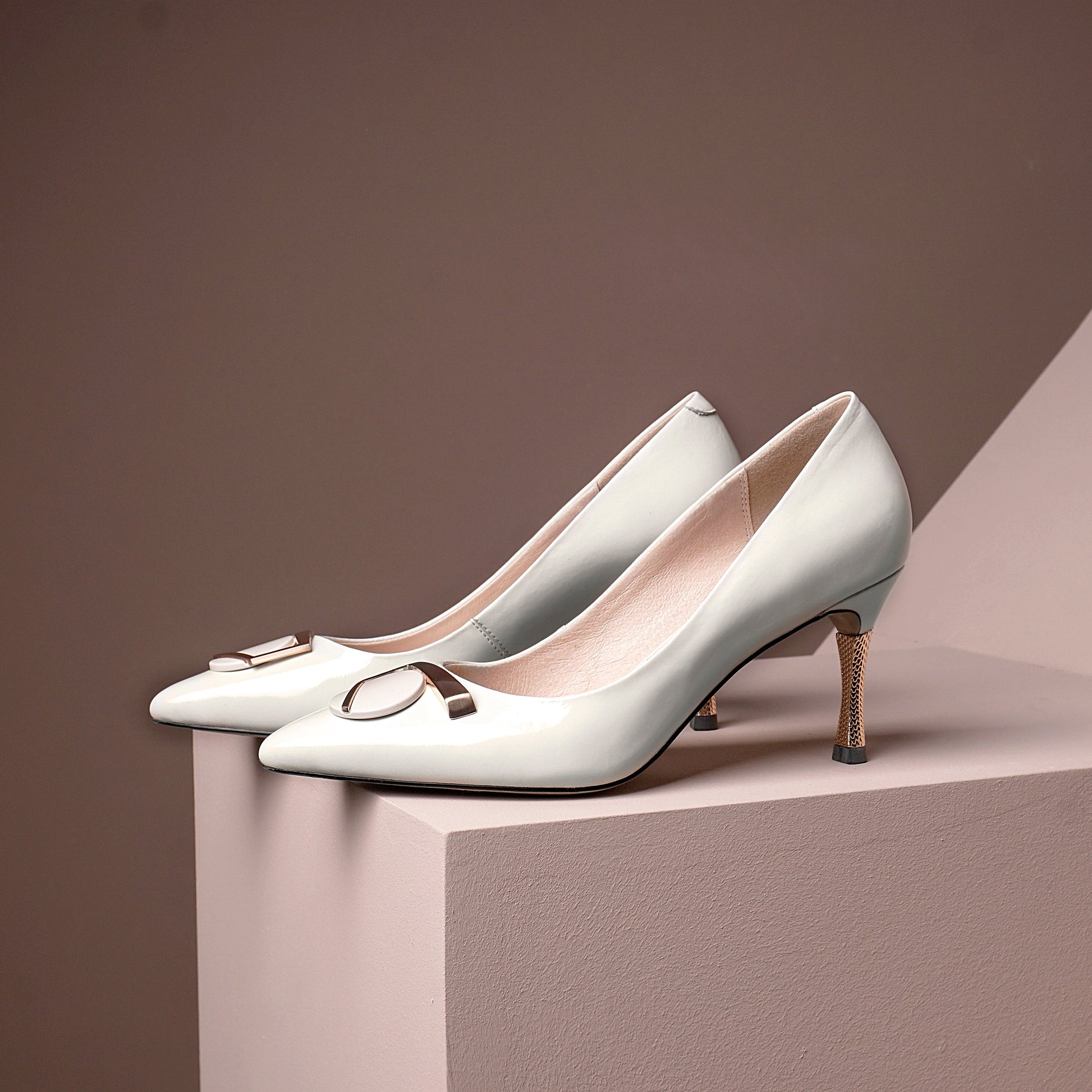 Elegant dress pumps designed with patent leather, pointed toe, delicate décor, stiletto heel to keep up with fashion trend.