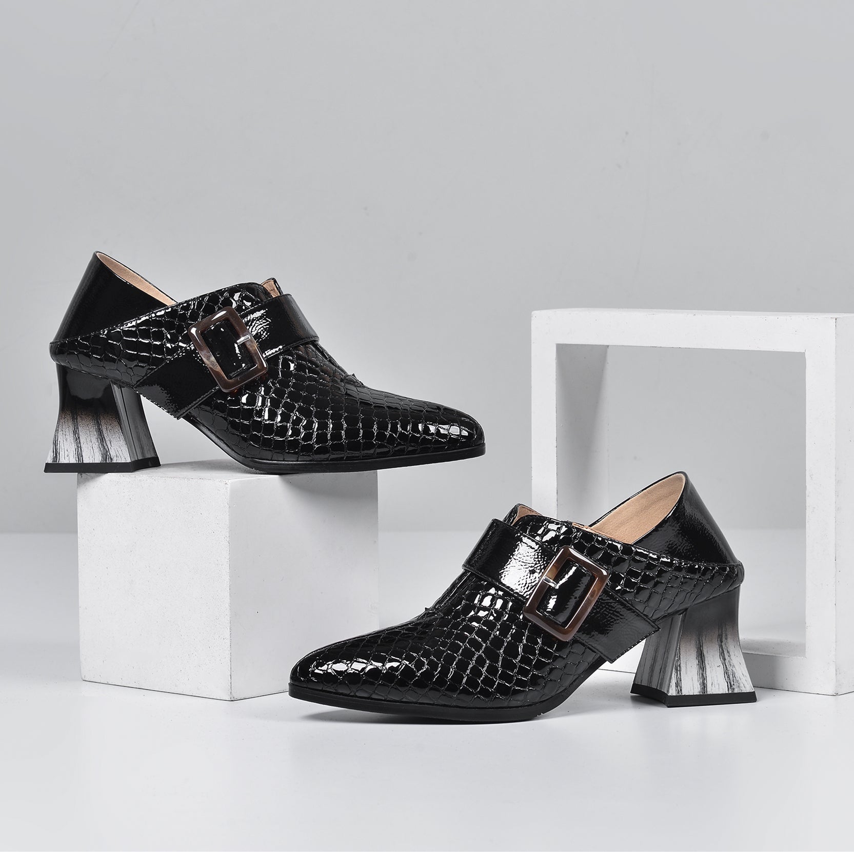 Nine Seven Women's Patent Leather Pointed Toe Handmade Side Zipper Mid Chunky Heels Stylish Pumps with Buckle