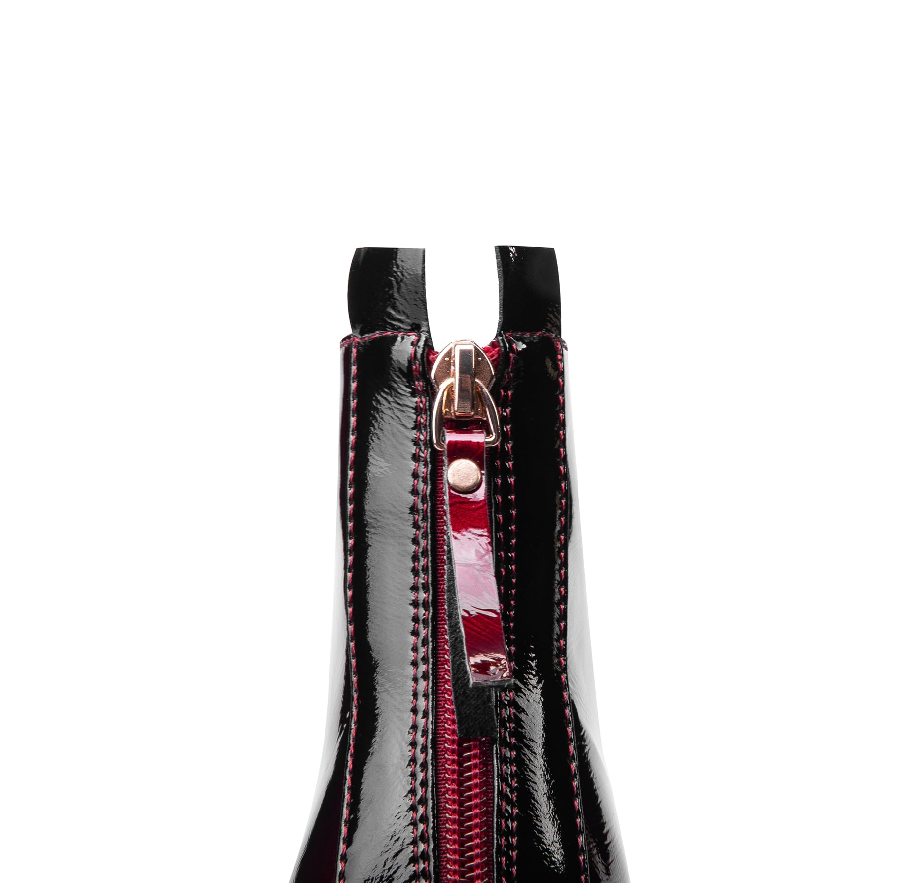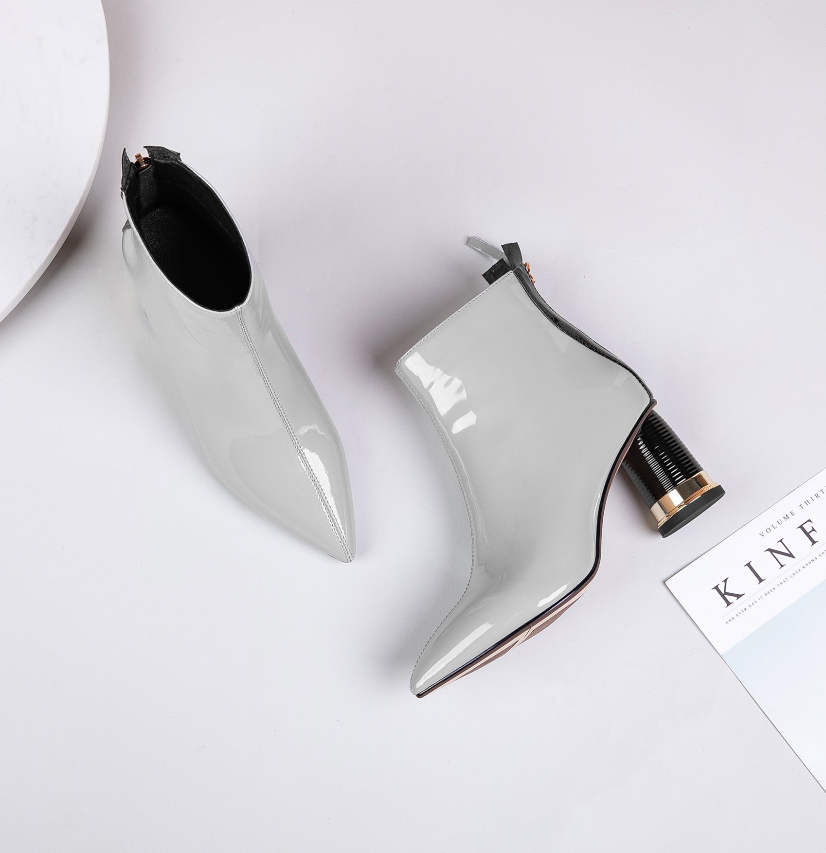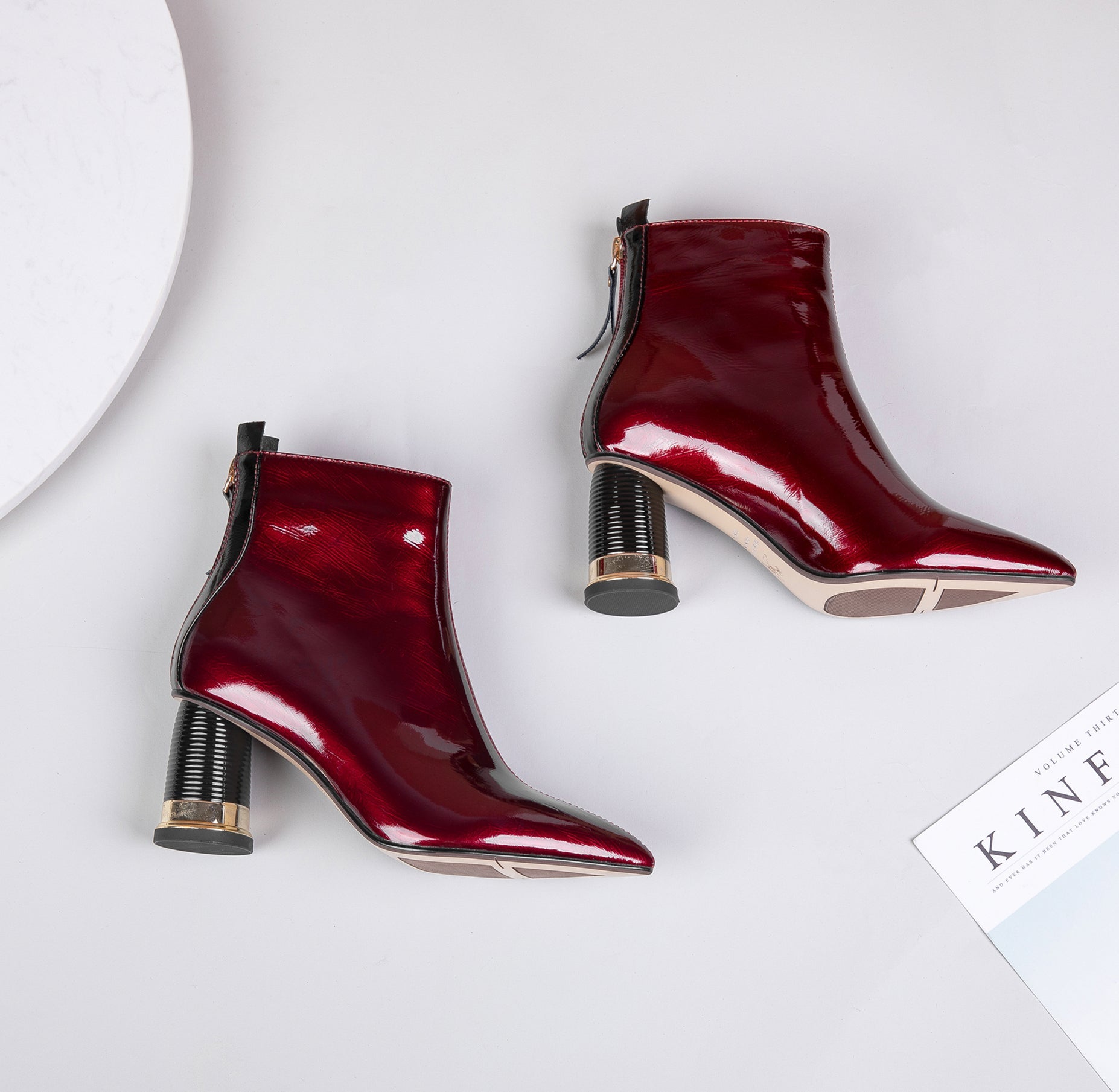 Glossy ankle boots designed with patent leather, pointed toe, back zip and mid cone heel can make you feel comfortable with every steps.