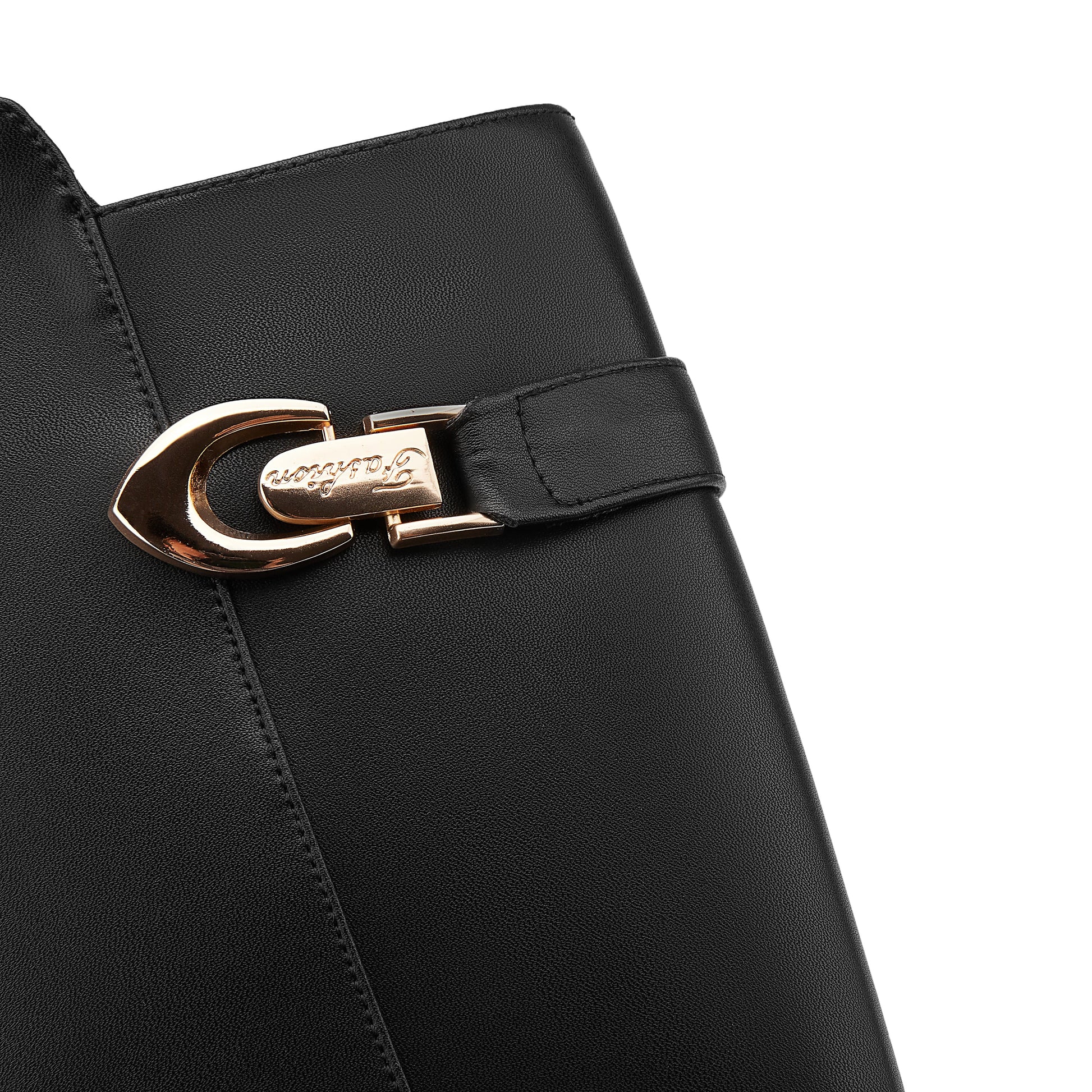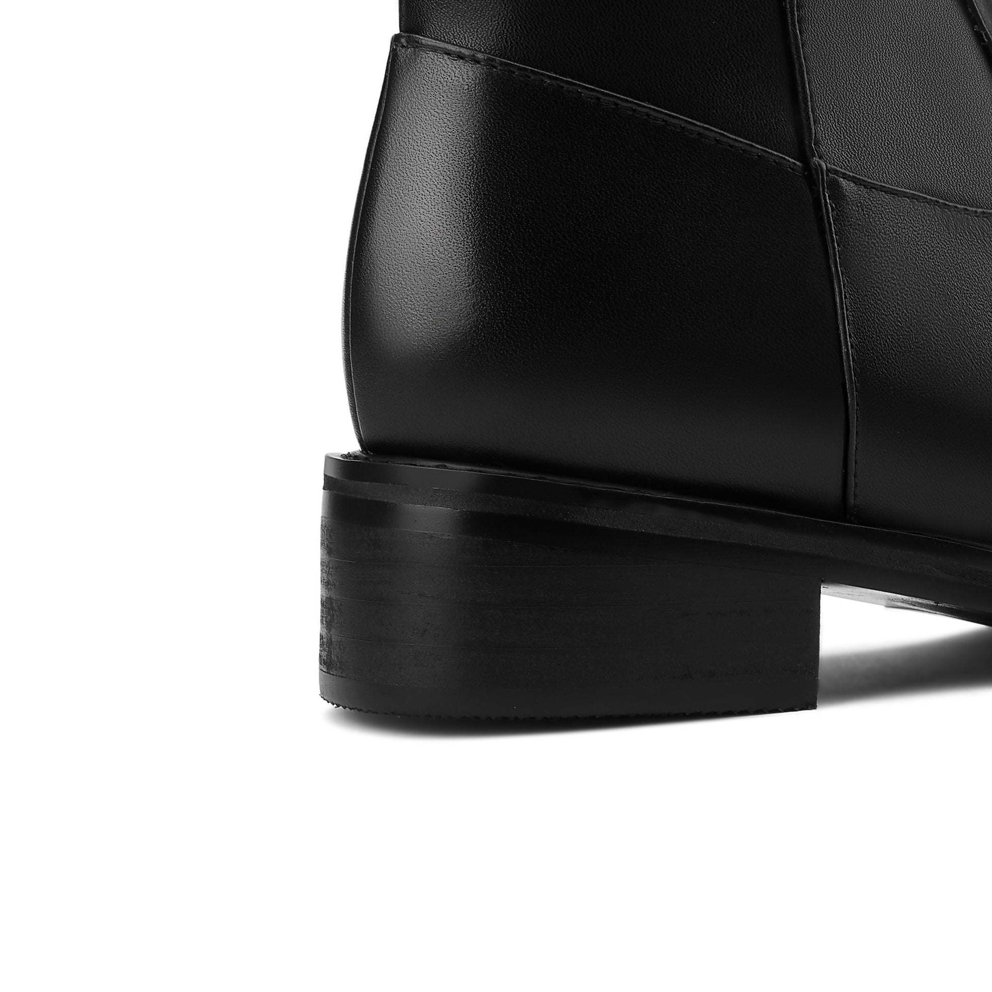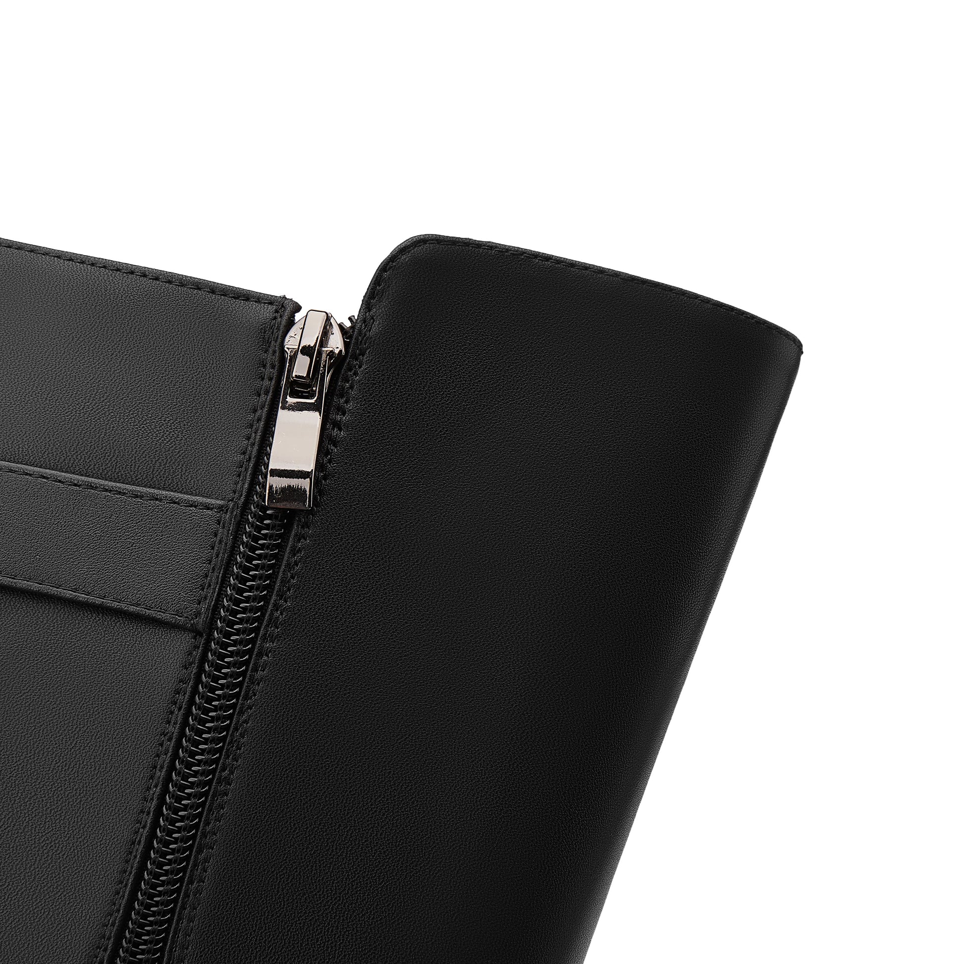 Classic black knee high boots designed with genuine leather, round toe, side zip, low chunky heel and metal décor can make you feel comfortable with every steps.
