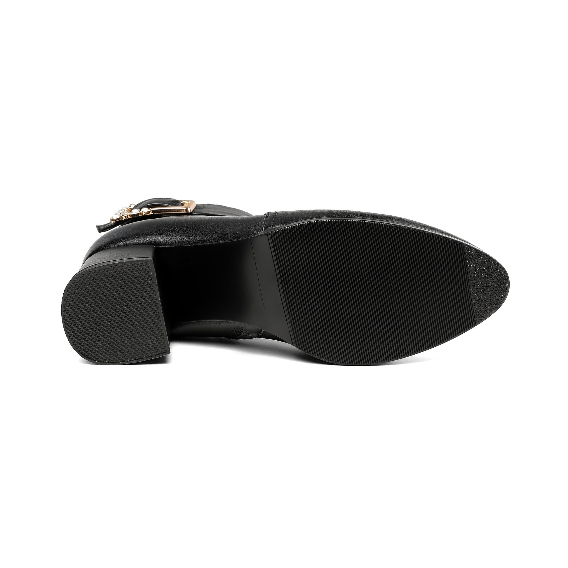 Classic ankle boots designed with genuine leather, round toe, side zip, mid chunky heel and buckle to keep up with fashion trend.