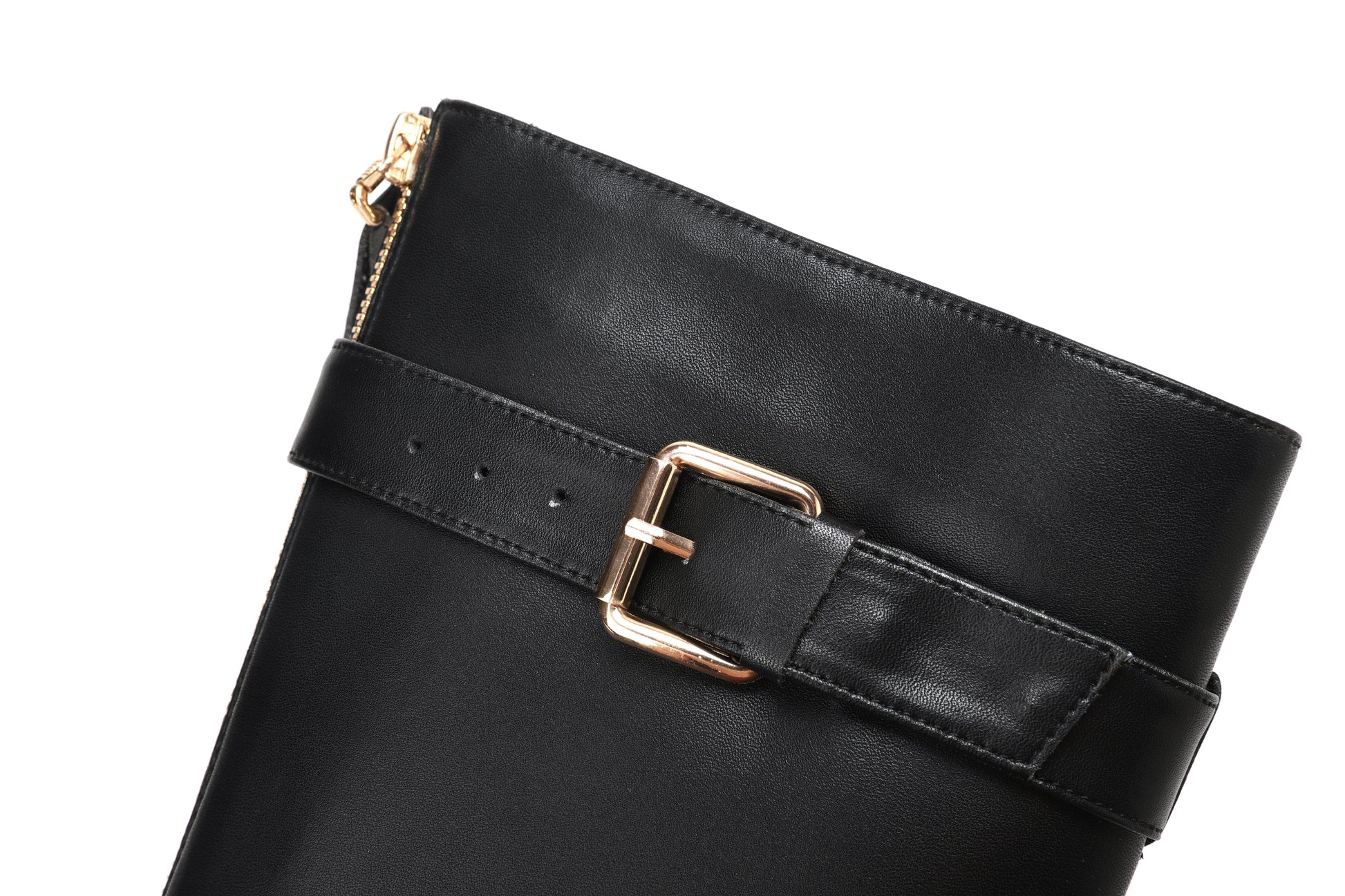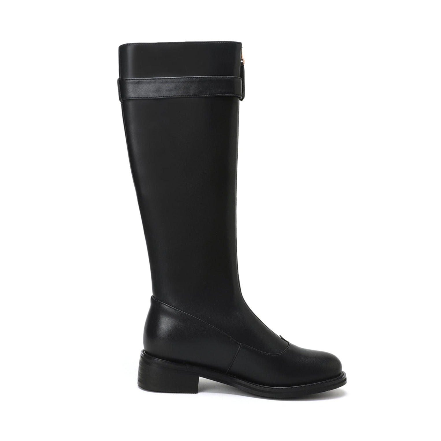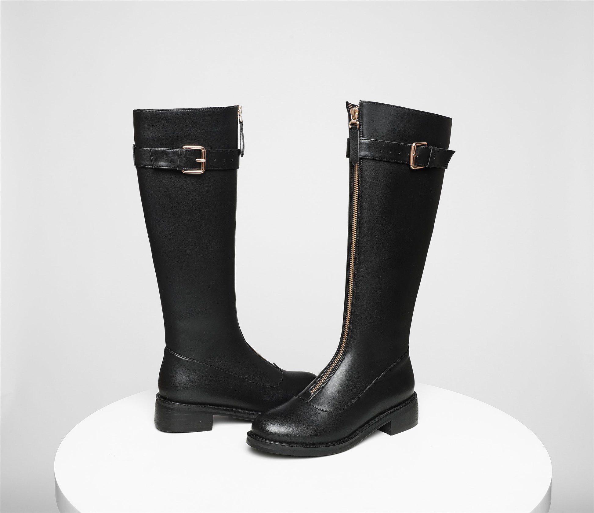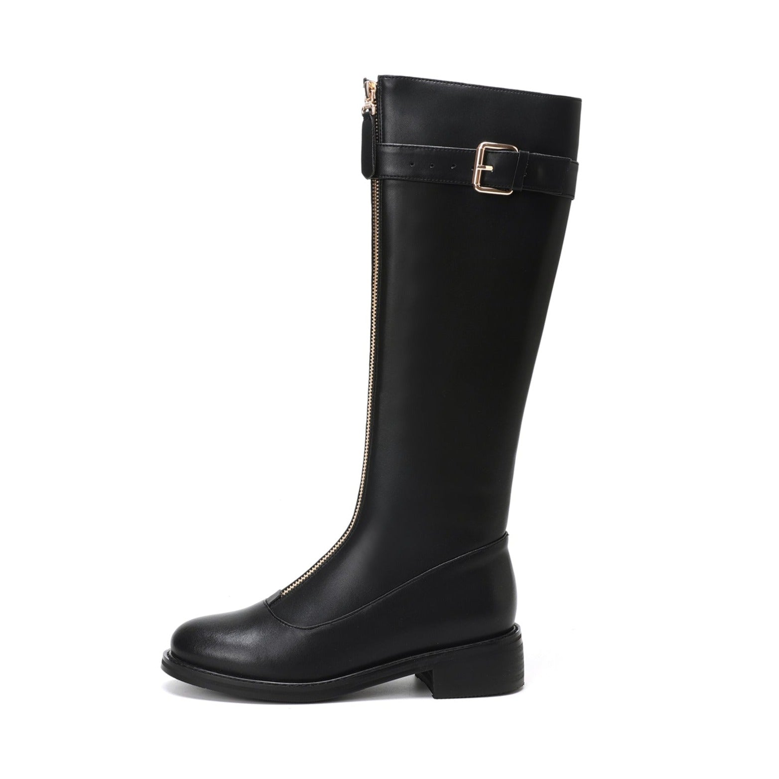 Classic knee high boots designed with genuine leather, round toe, front zip, buckle and low heel can make you feel comfortable with every steps.