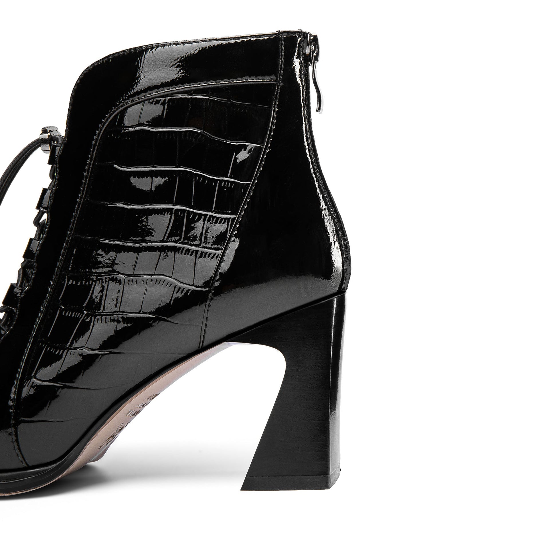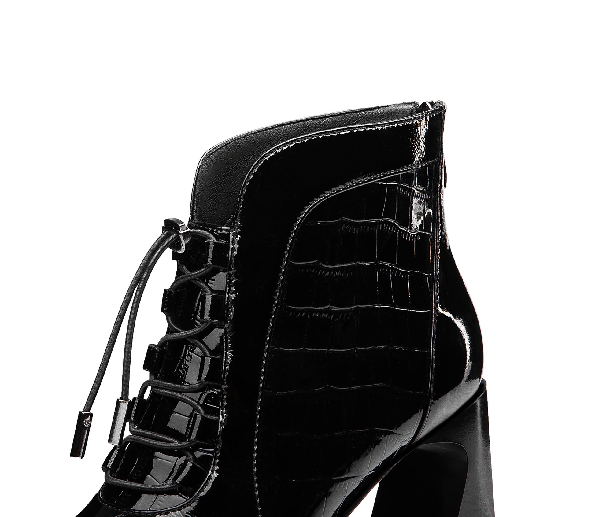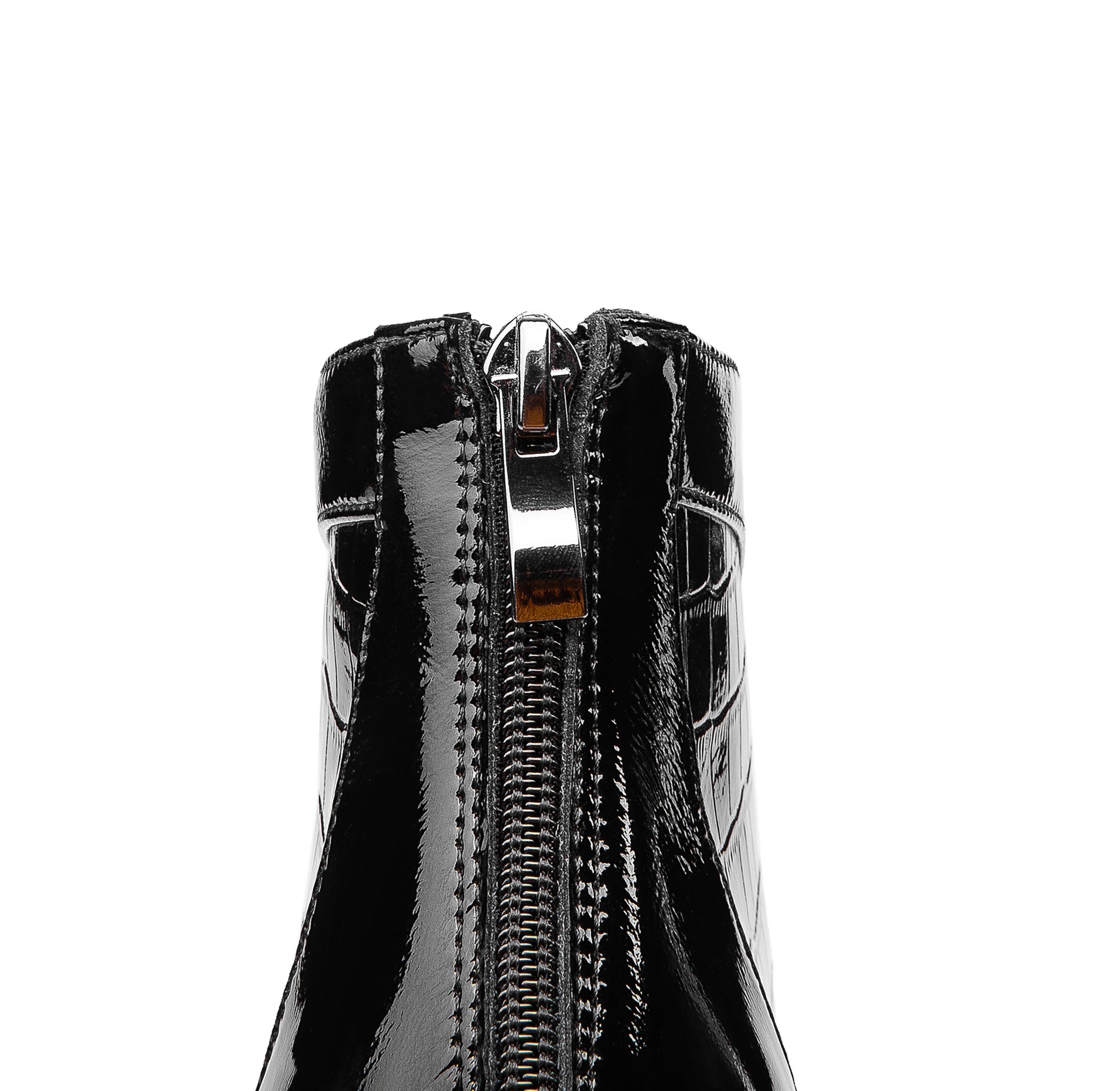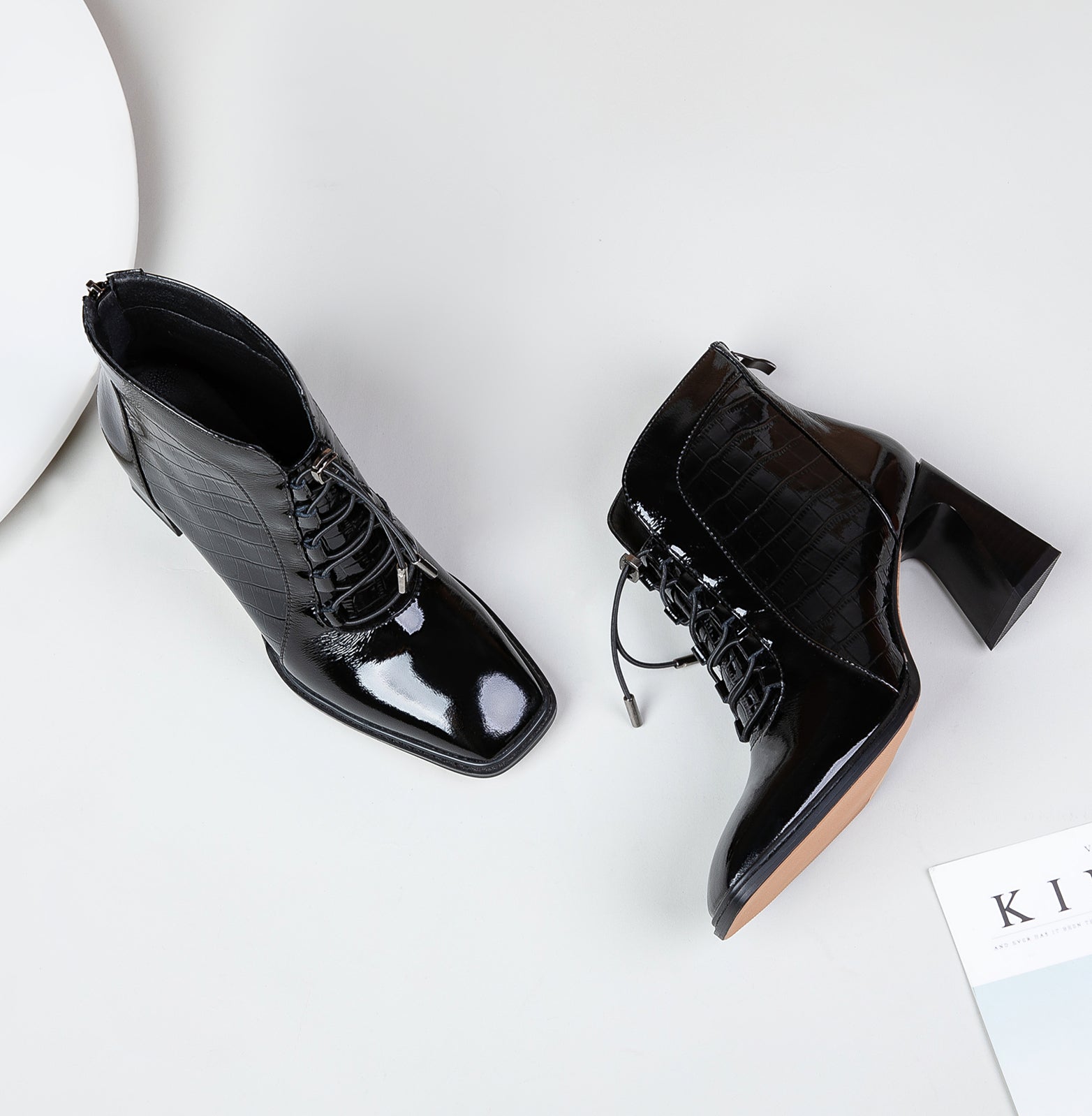 Sexy dressing boots are designed with patent leather, classic square toe, high heel, zipper closure and band to keep up with fashion trend. These fashion booties could go with different outfit.