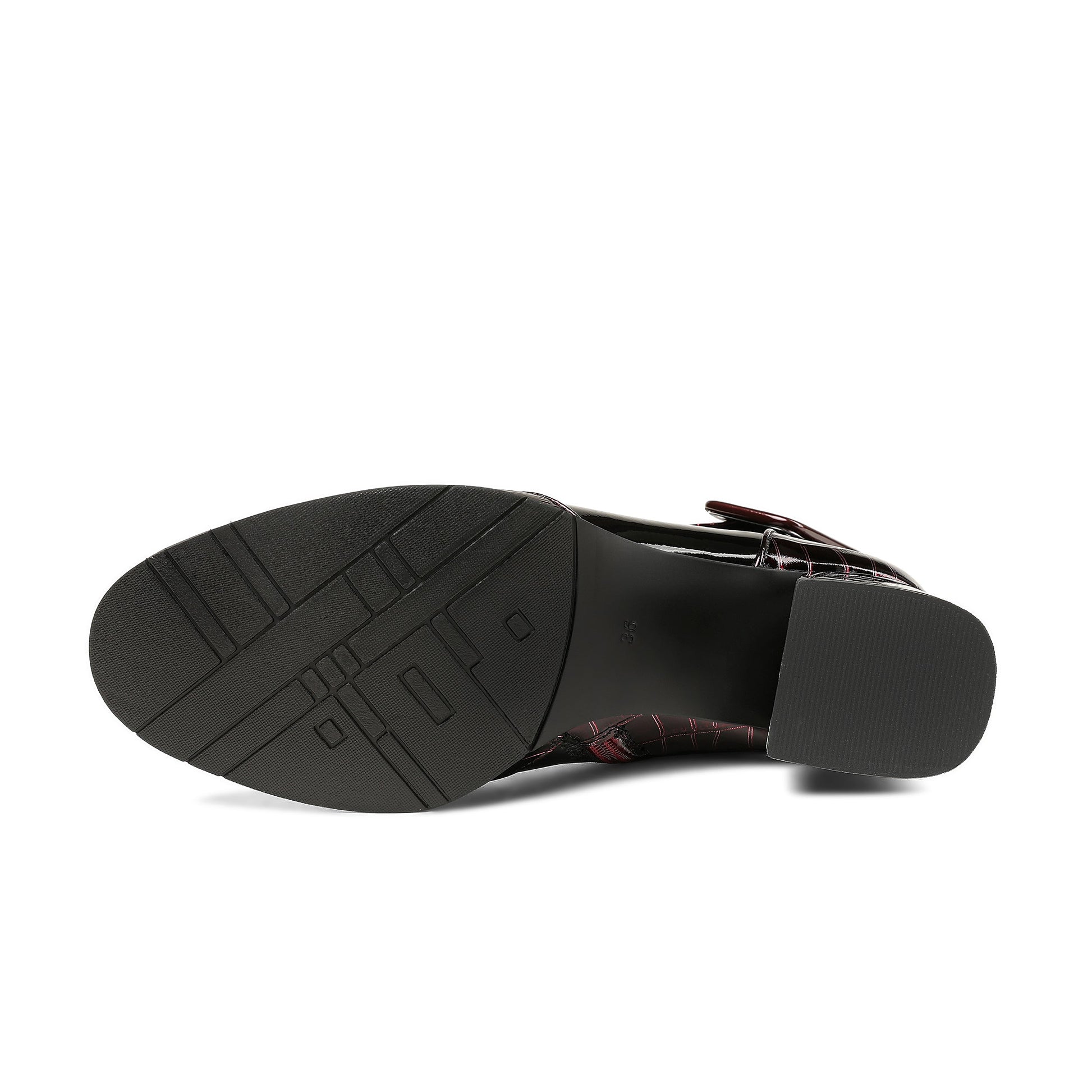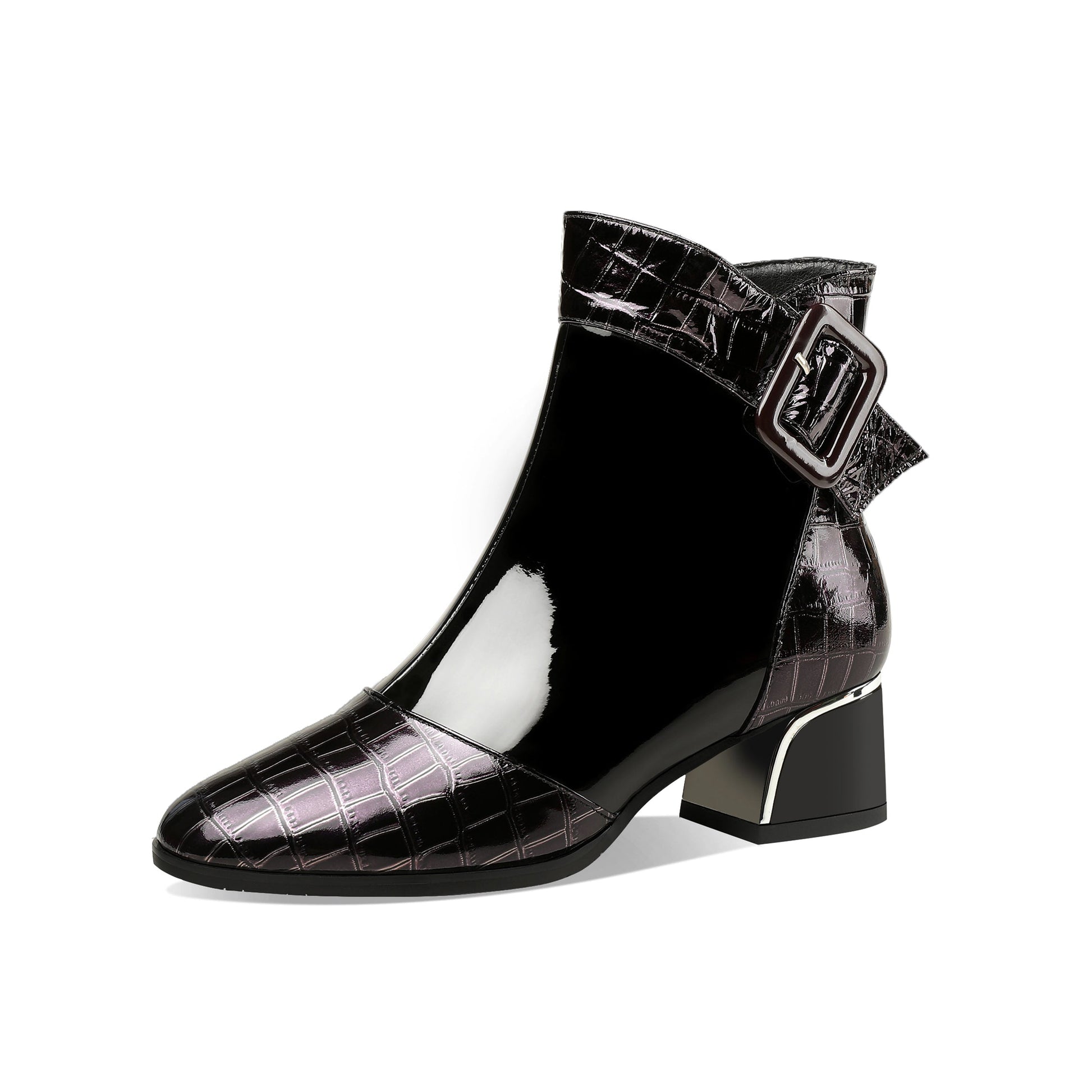 Stylish ankle boots designed with patent leather, round toe, side zipper, buckle and low chunky heel can go with almost all your outfits.