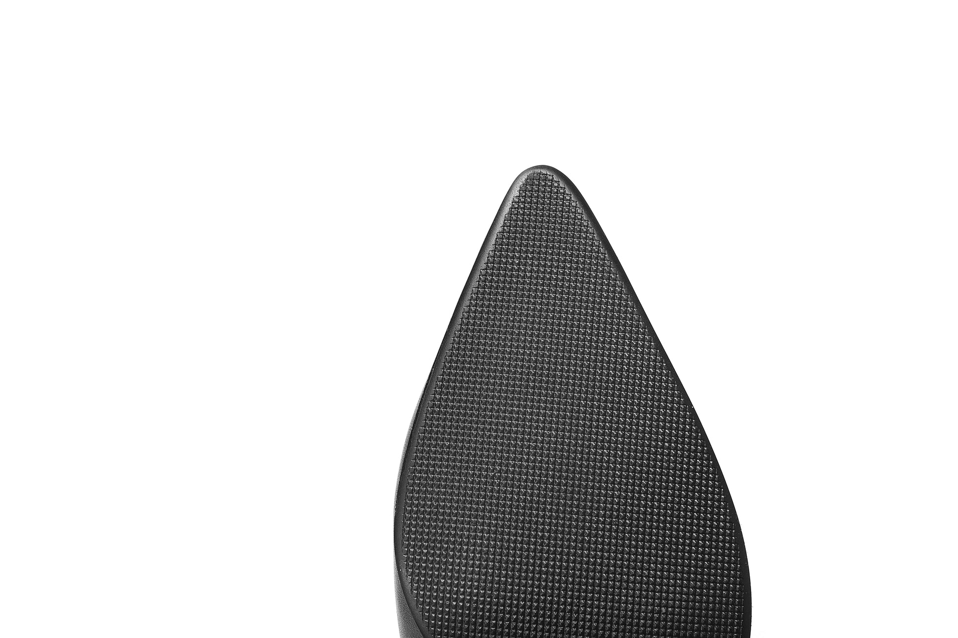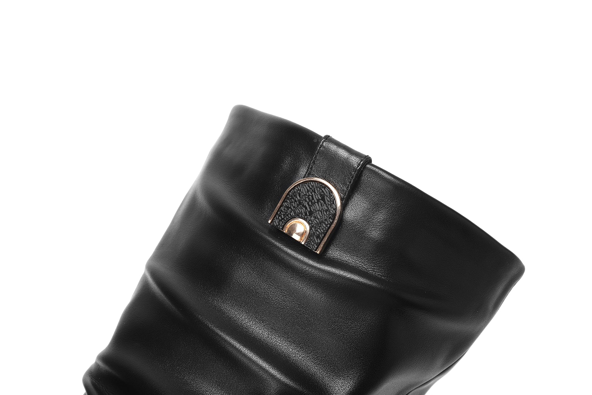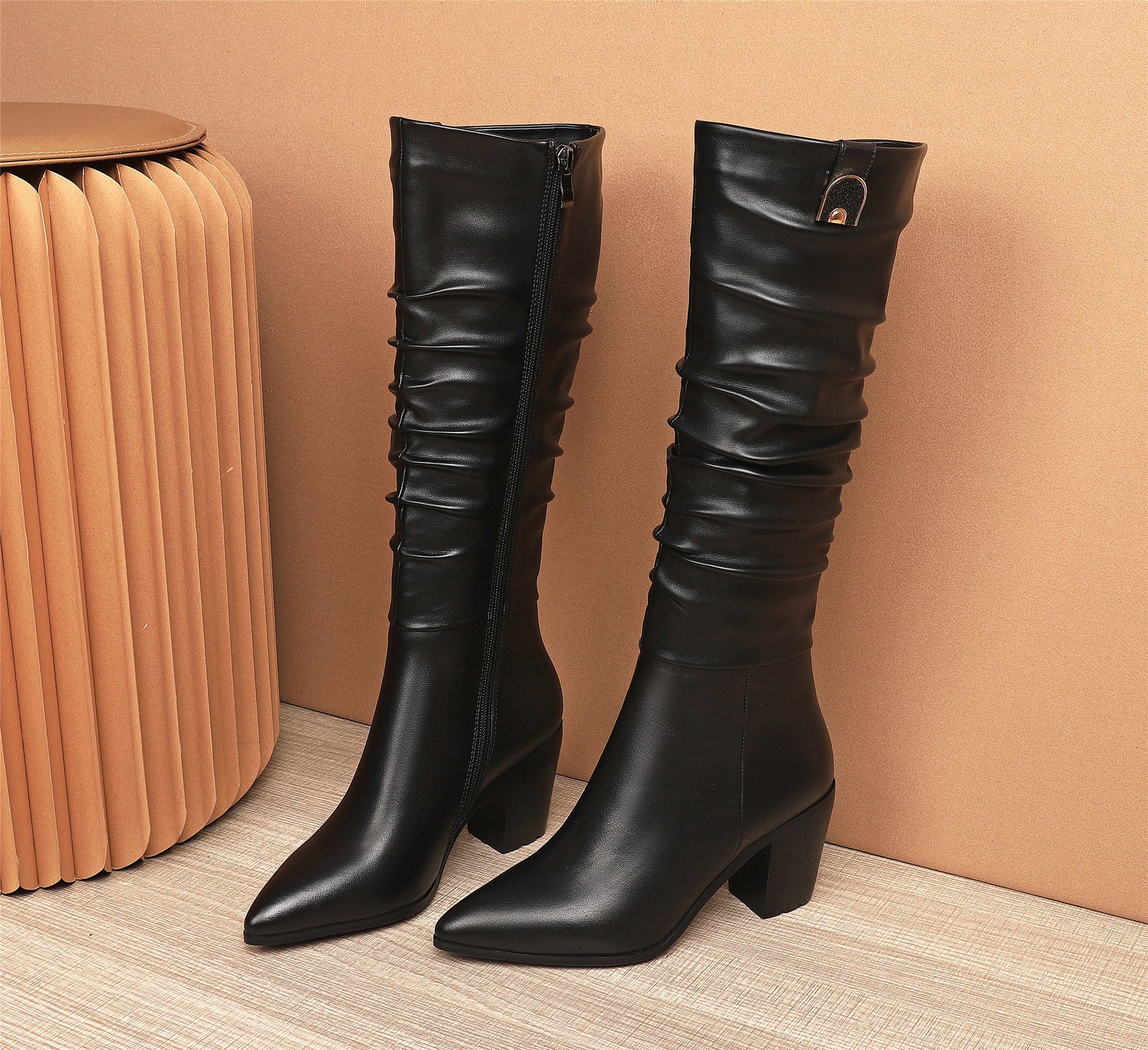 Classic black knee high boots featured with genuine leather, pointed toe, zipper, chunky heel and corrugated design to keep up with fashion trend.
