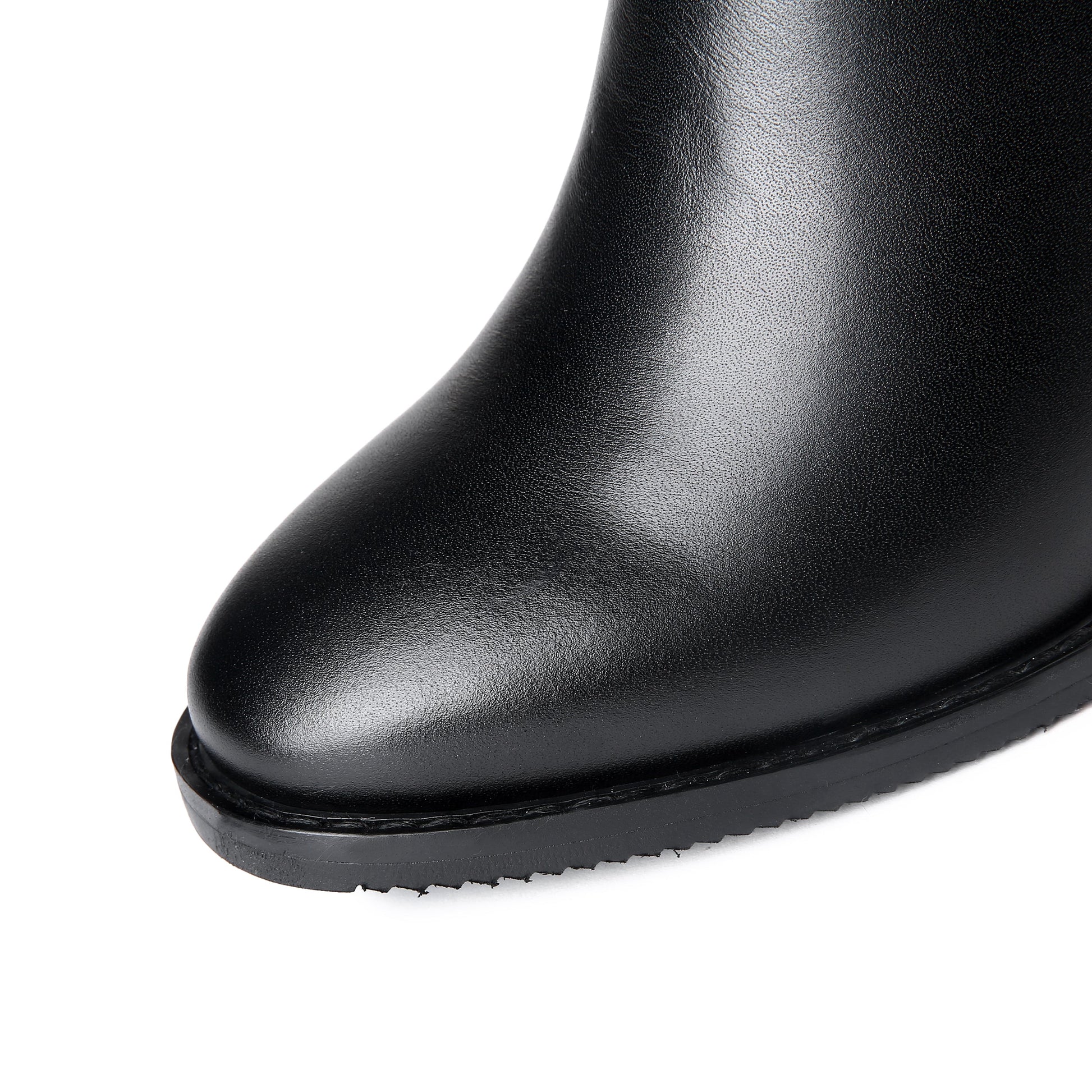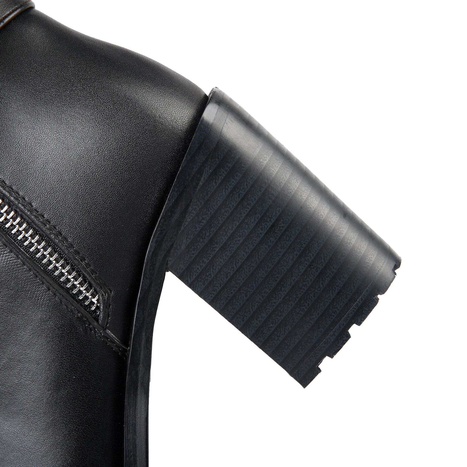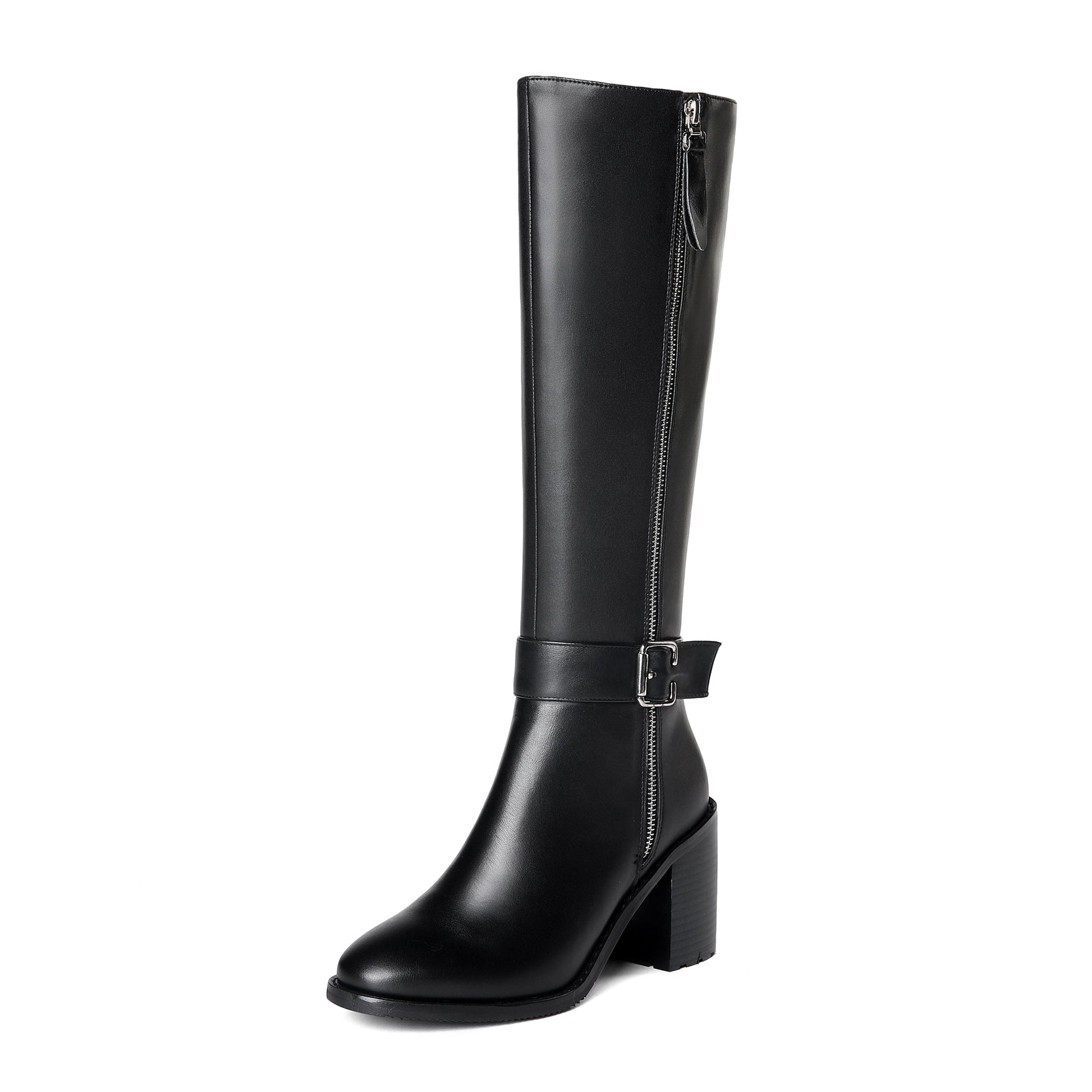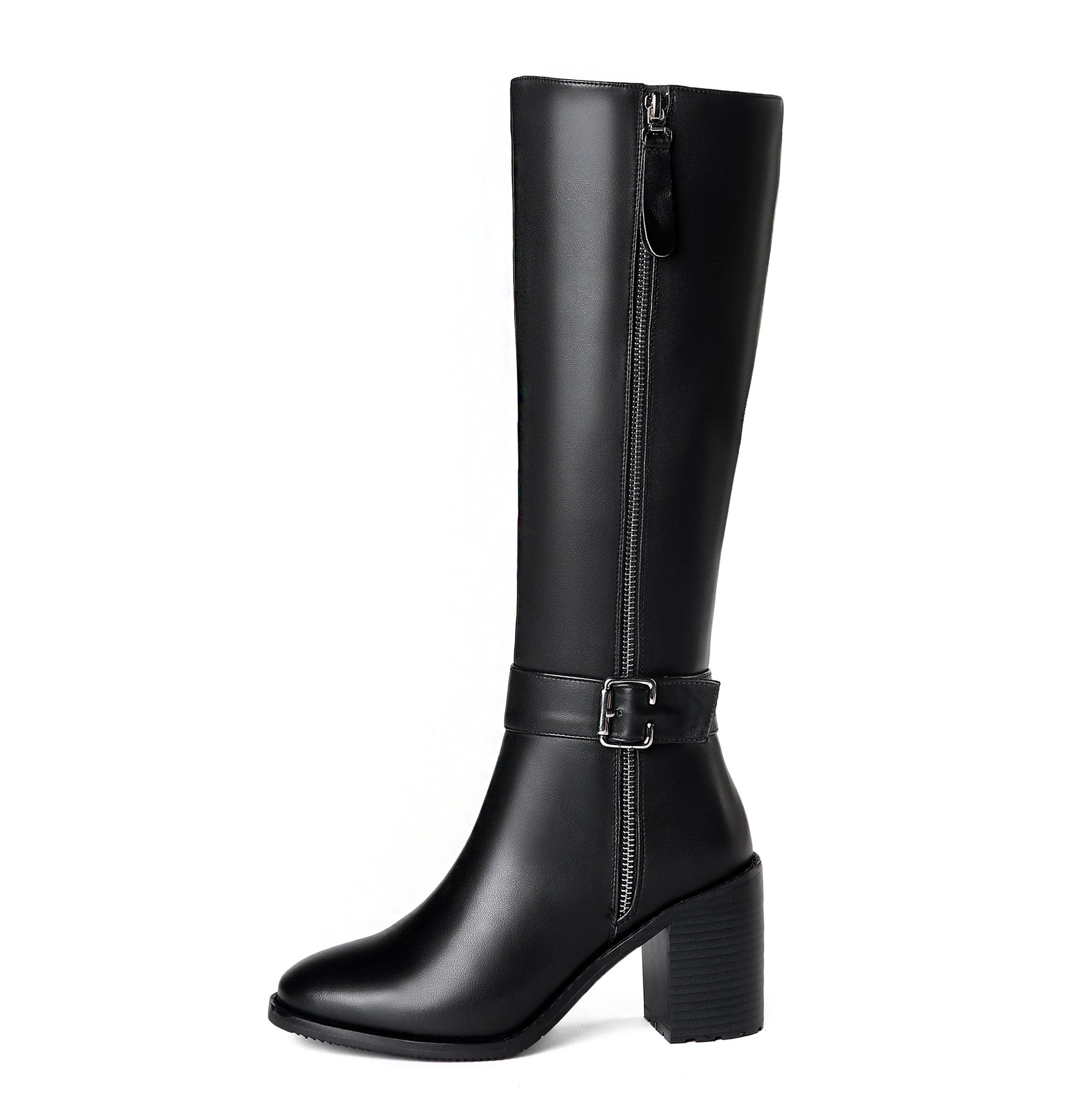 Chic knee high boots designed with genuine leather, round toe, buckled, dual zippers and high chunky heels to keep up with fashion trend.