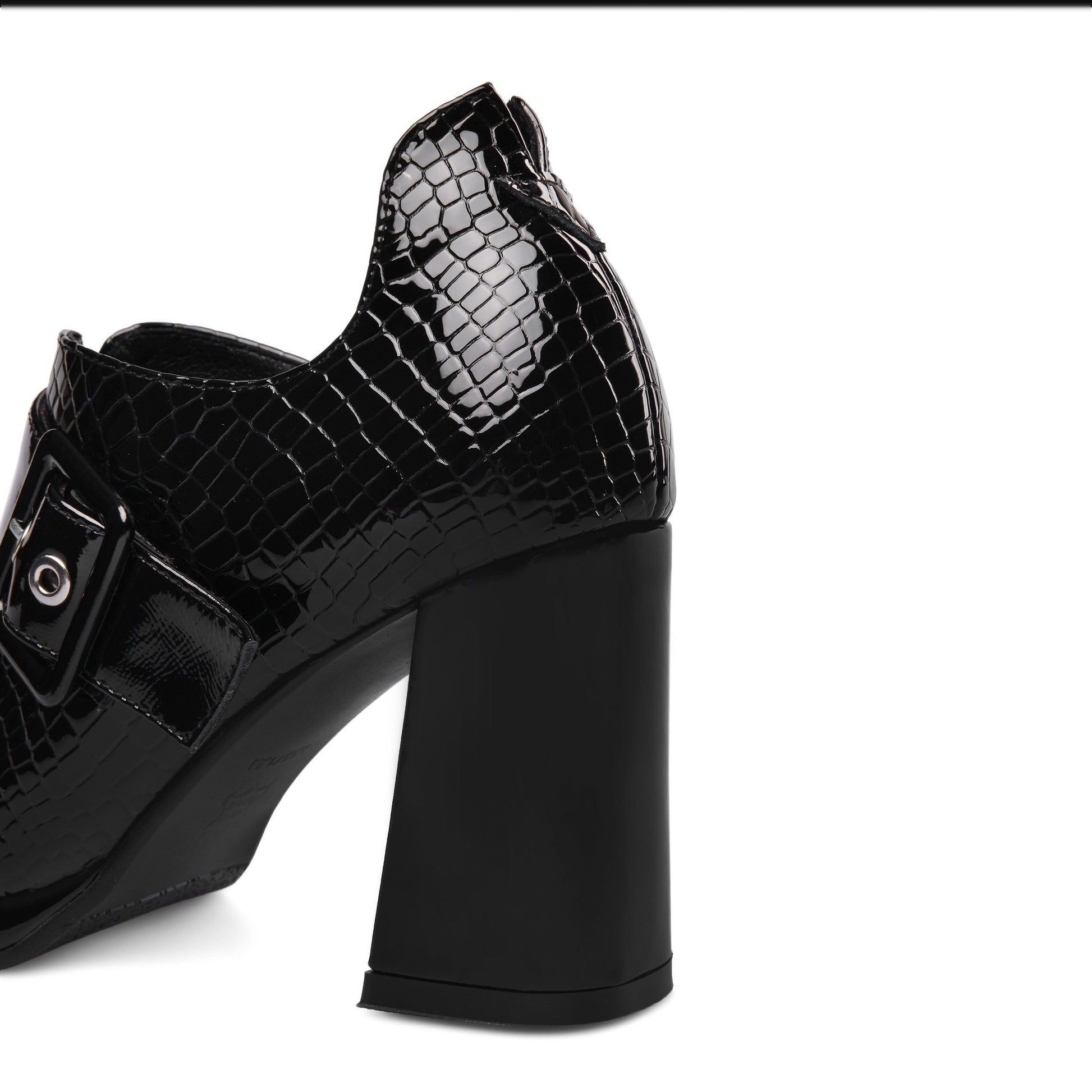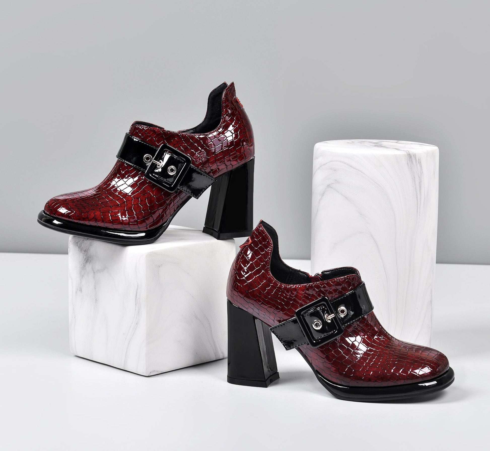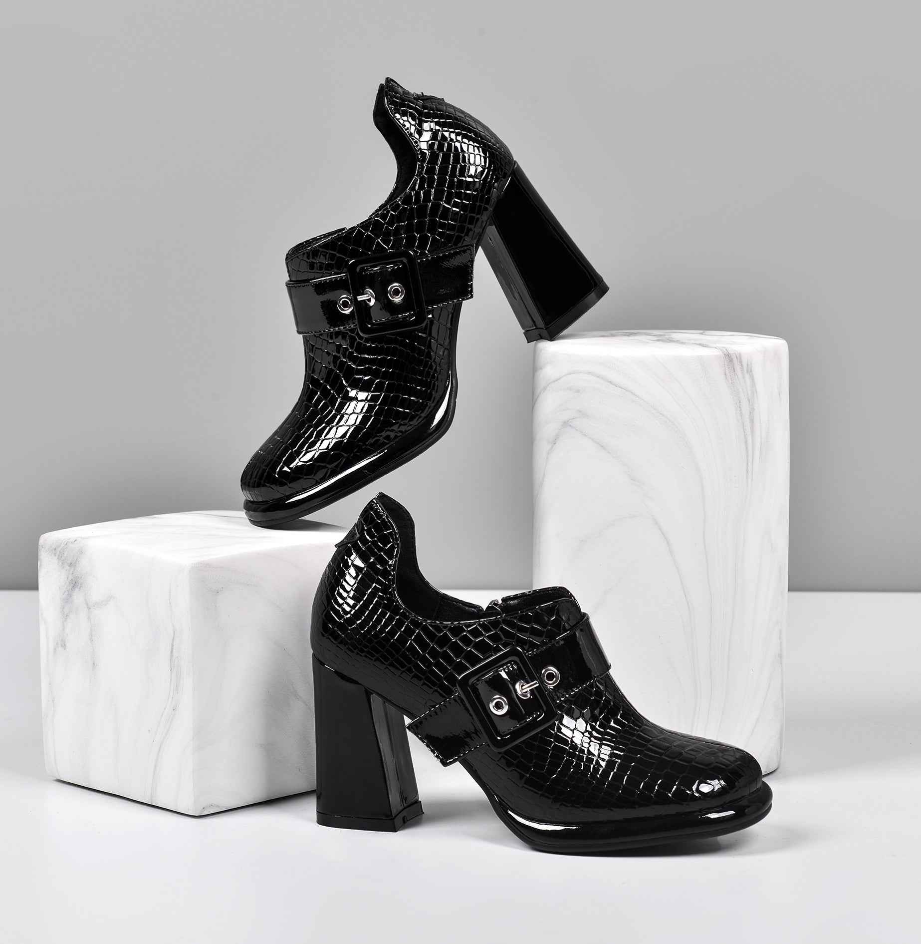 Chic pumps shoes designed with patent leather, round toe, side zipper, high chunky heel and buckle to keep up with with fashion trend.