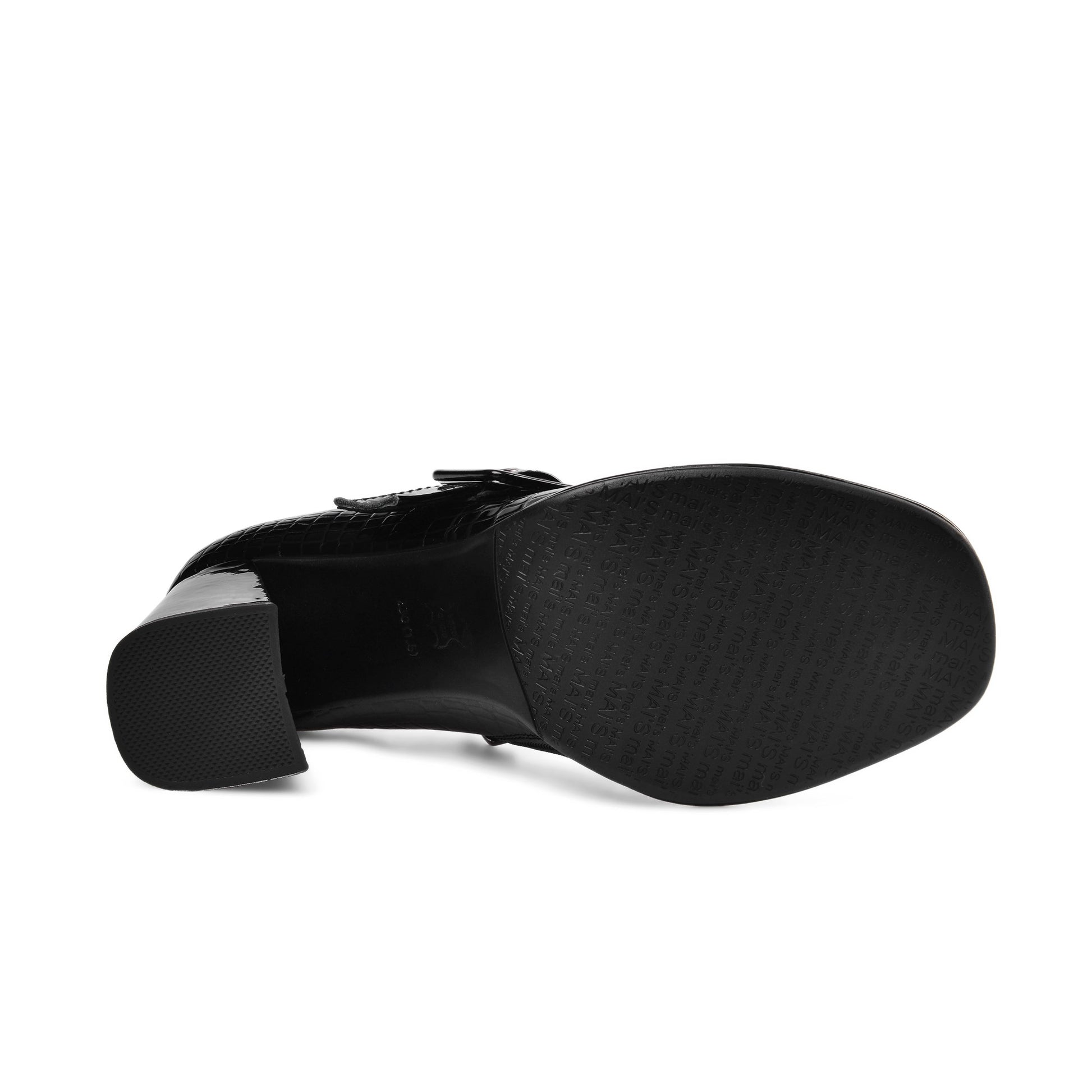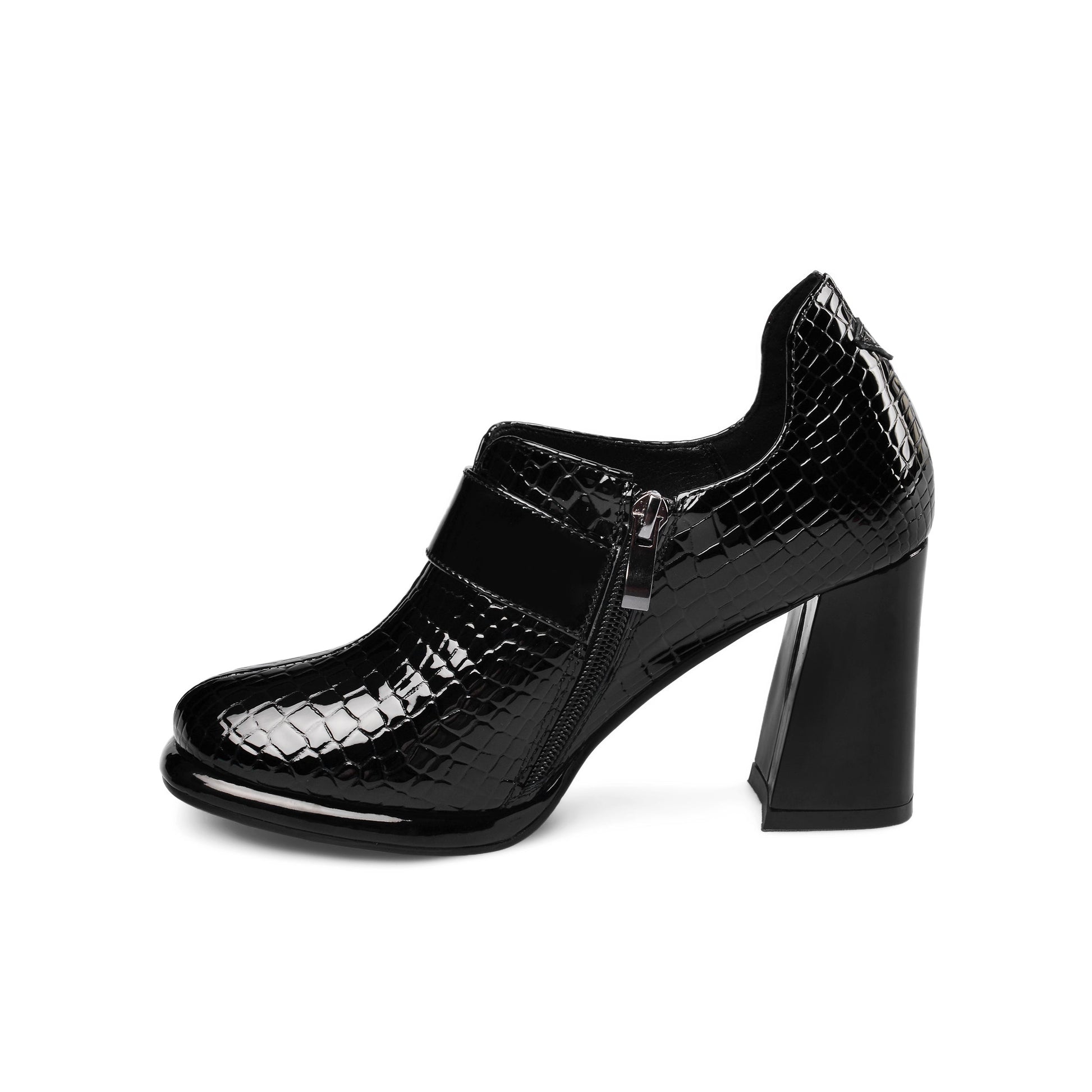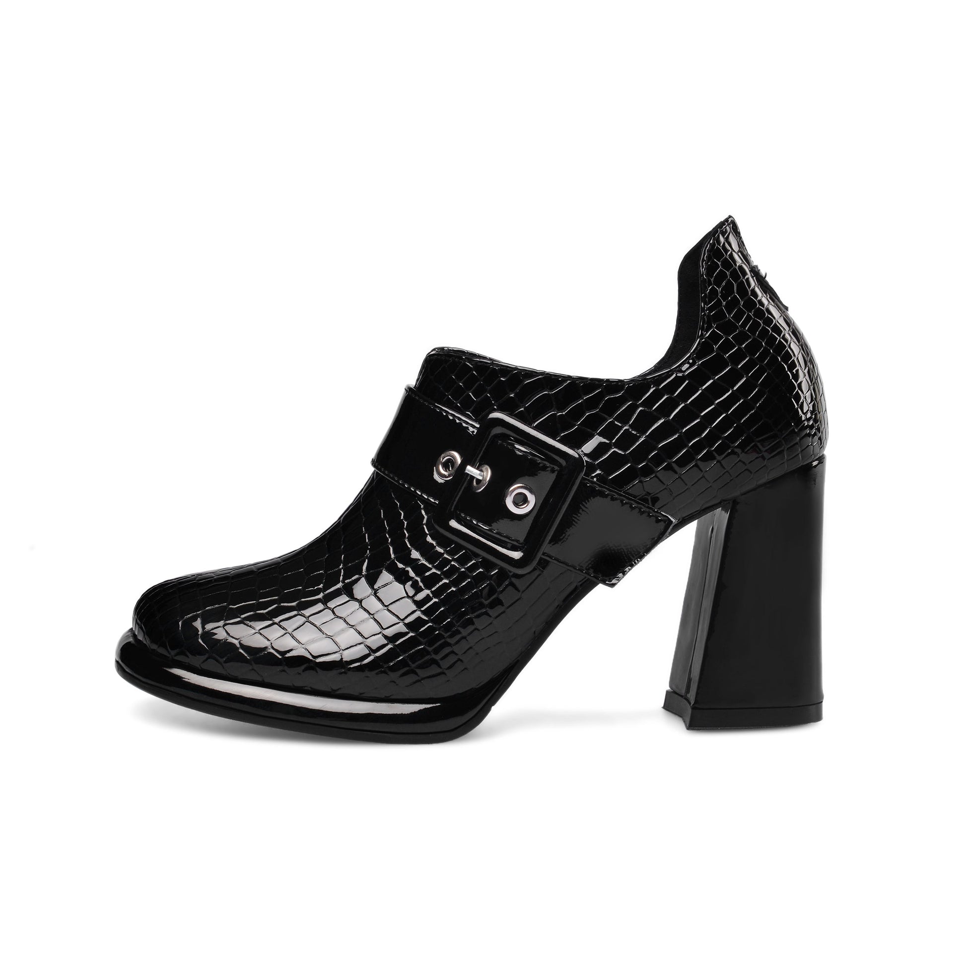 Chic pumps shoes designed with patent leather, round toe, side zipper, high chunky heel and buckle to keep up with with fashion trend.