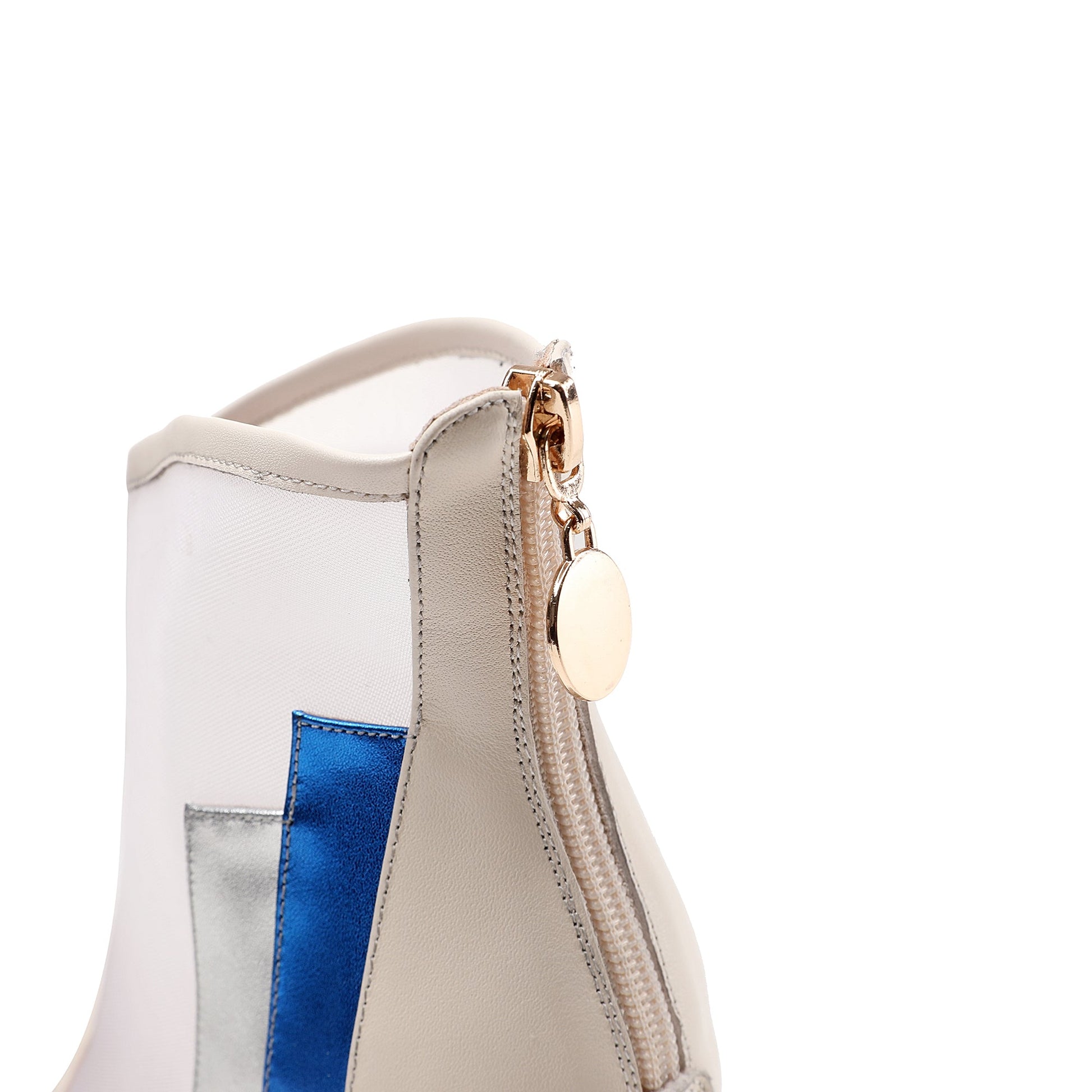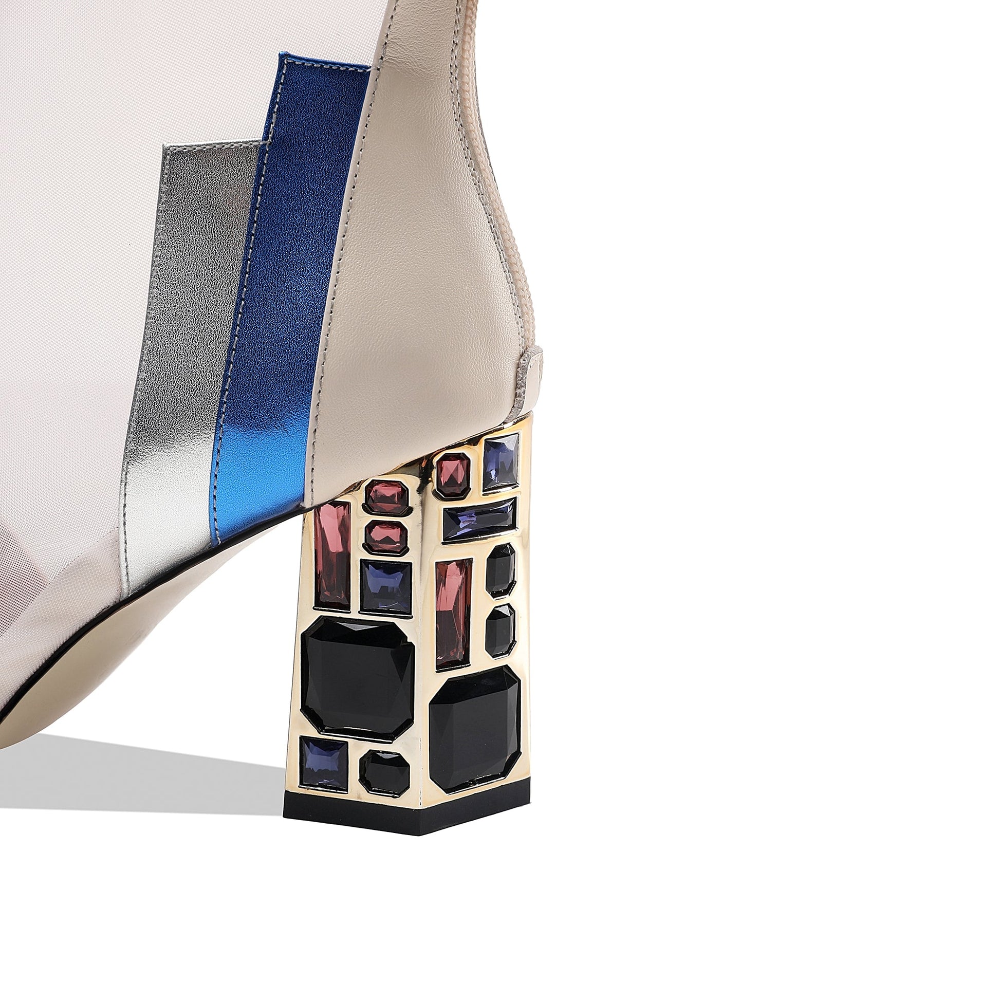 Sexy summer boots designed with genuine/suede leather, mesh, pointed toe, high chunky heels with jewelry and back zippers to keep up with fashion trend.