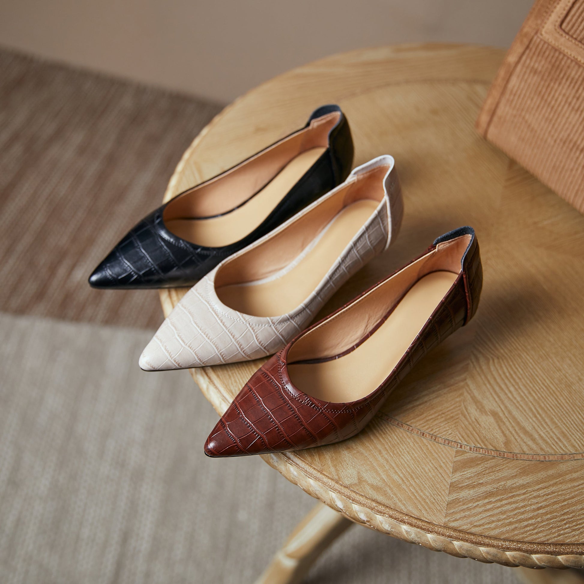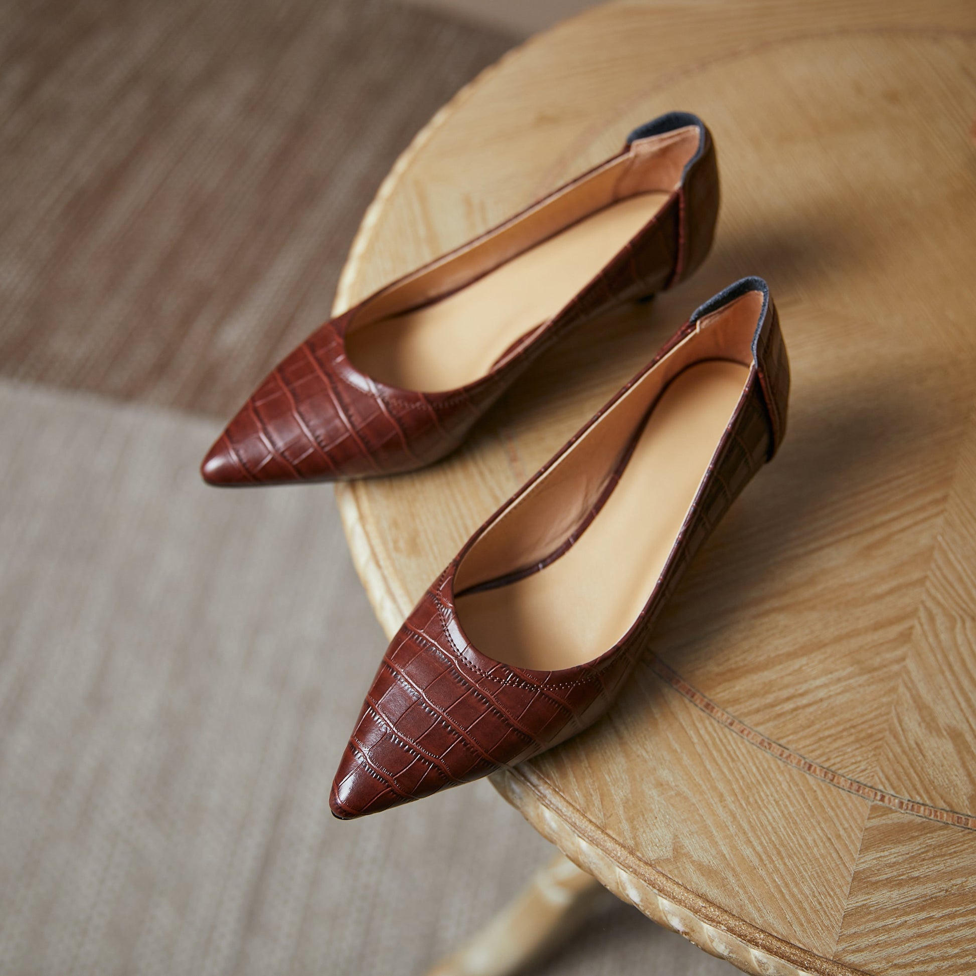 Nine Seven Women's Handmade Genuine Leather Pointed Toe Low Kitten Heel Slip On V-Shaped Retro Pump Shoes