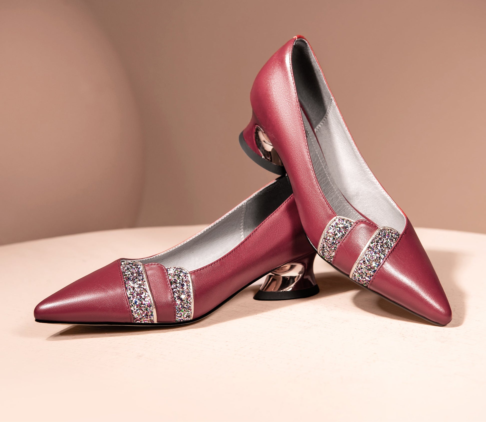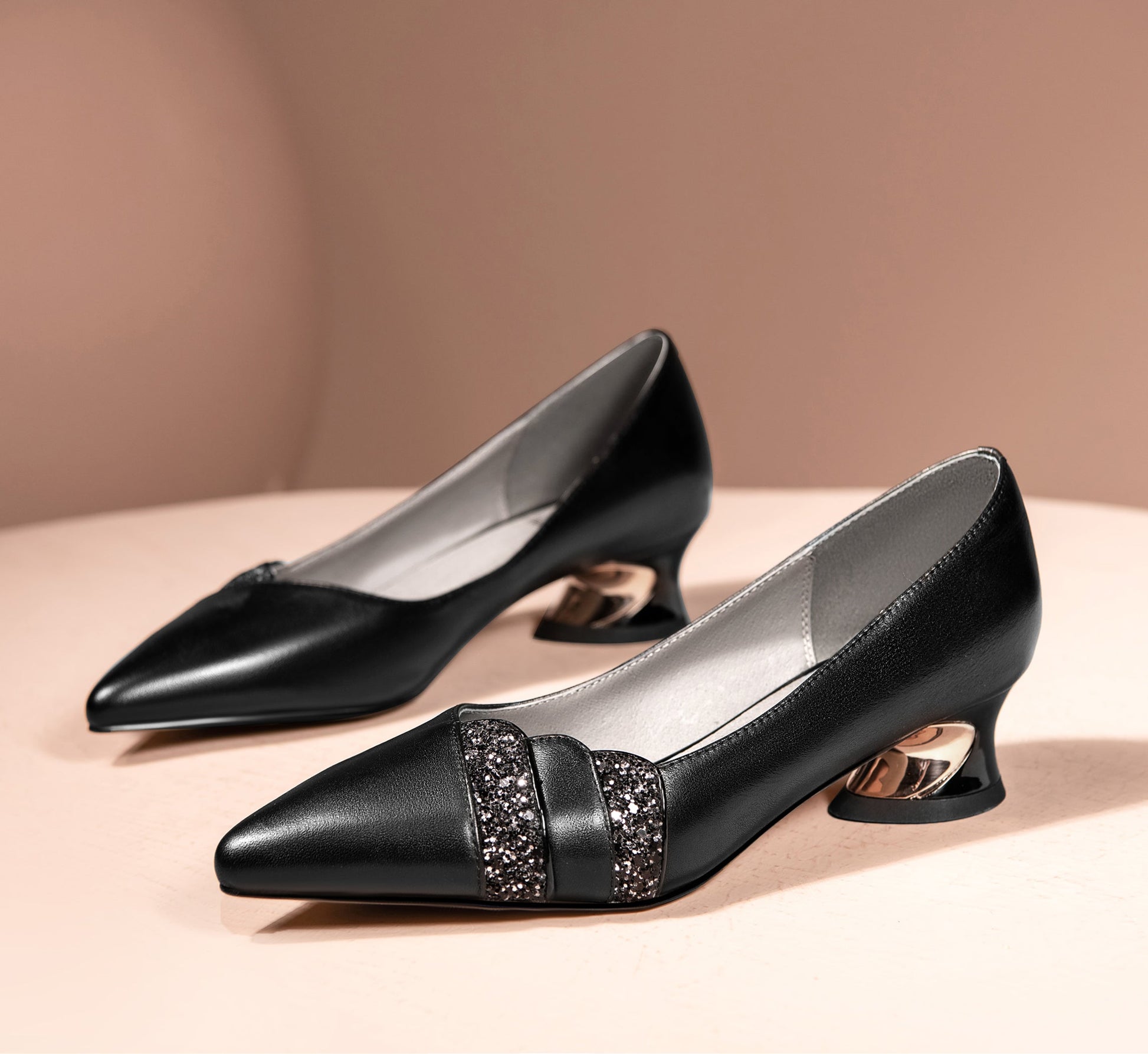 Nine Seven Women's Handmade Genuine Leather Spool Heel Pointed Toe Glitter Loafer Pumps