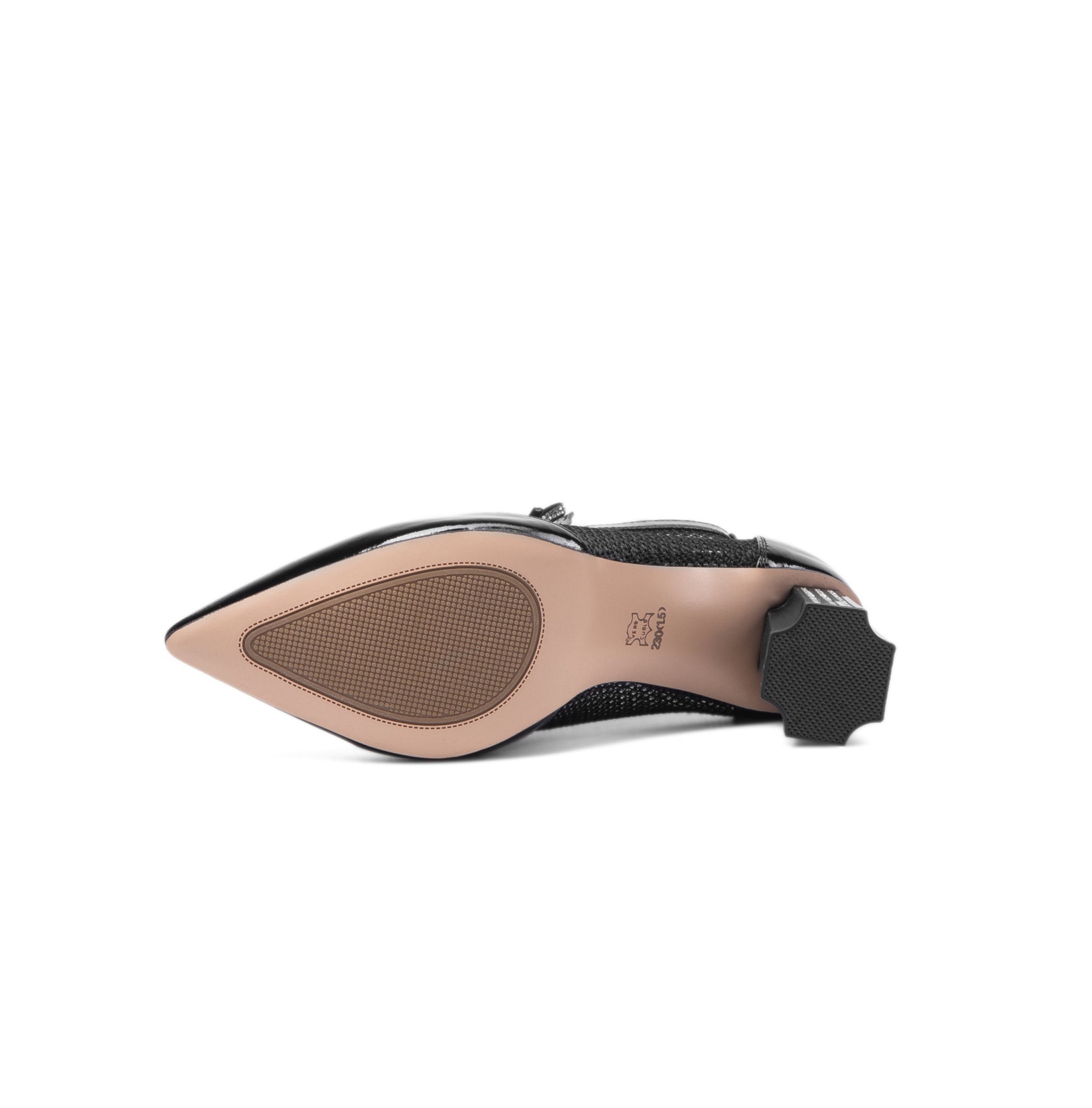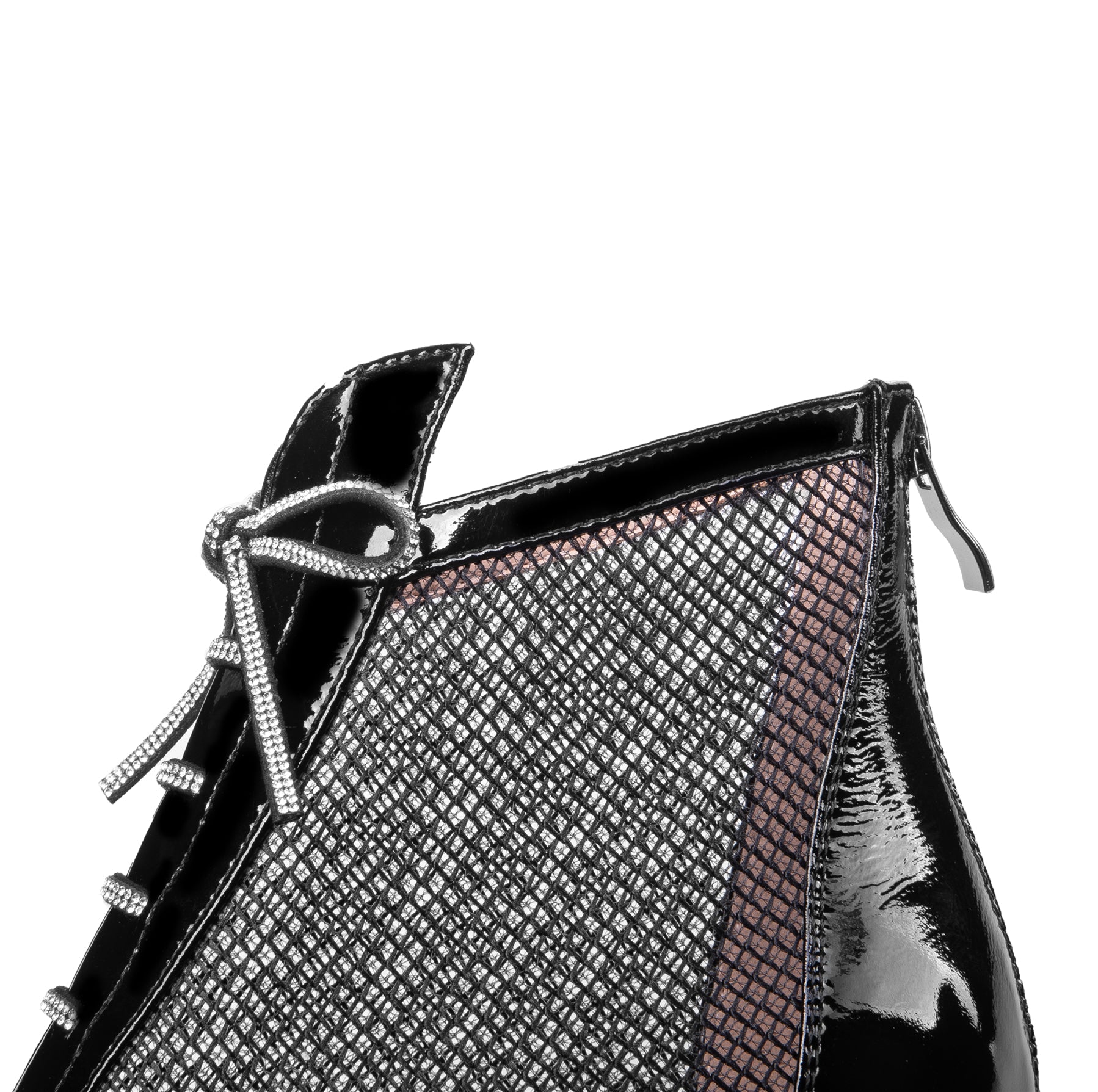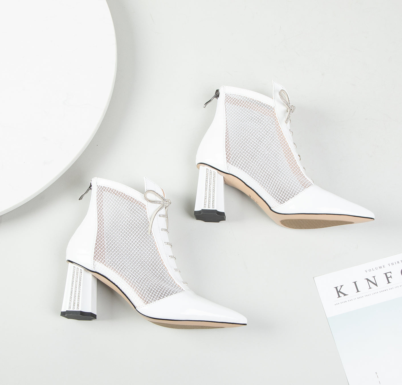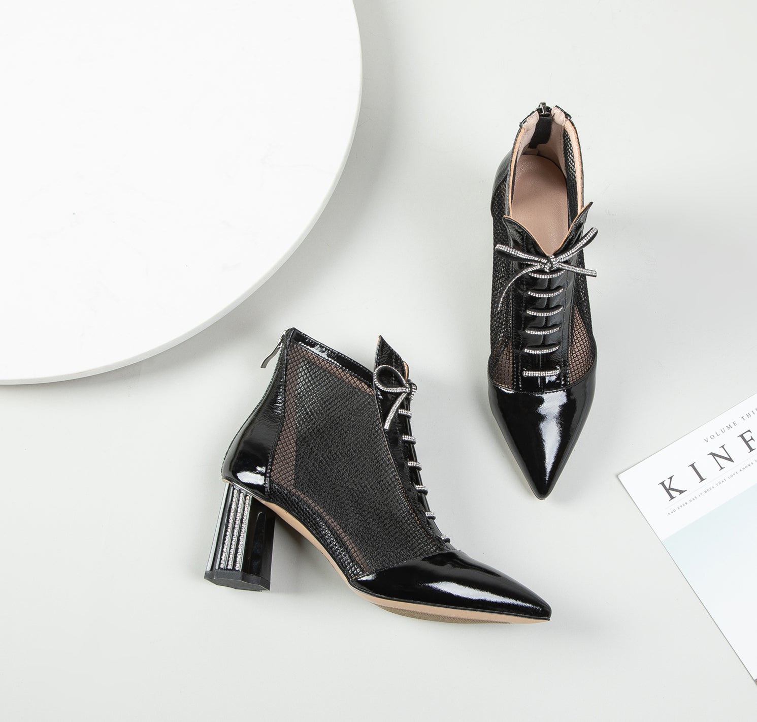 Nine Seven Women's Handmade Glossy Patent Leather Mesh Hollow Pointed Toe Back Zip Mid Chunky Heel Summer Boots