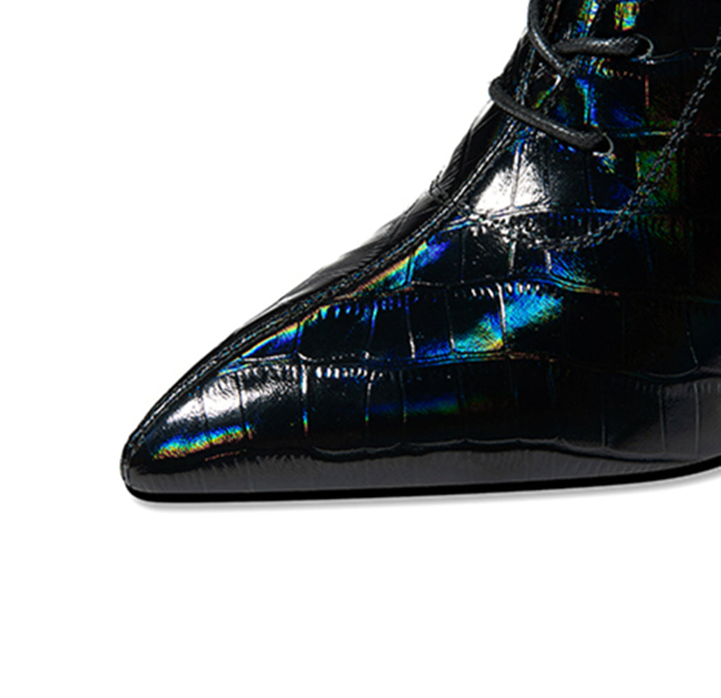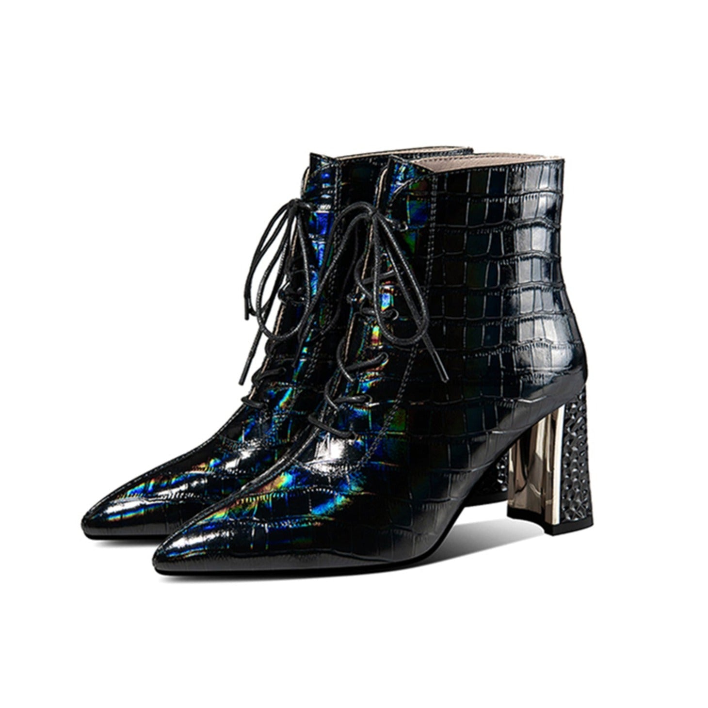 Stylish ankle boots are designed with genuine leather, pointed toe, high heel, front lace up to keep up with fashion trend. These fashion booties go with different outfits.