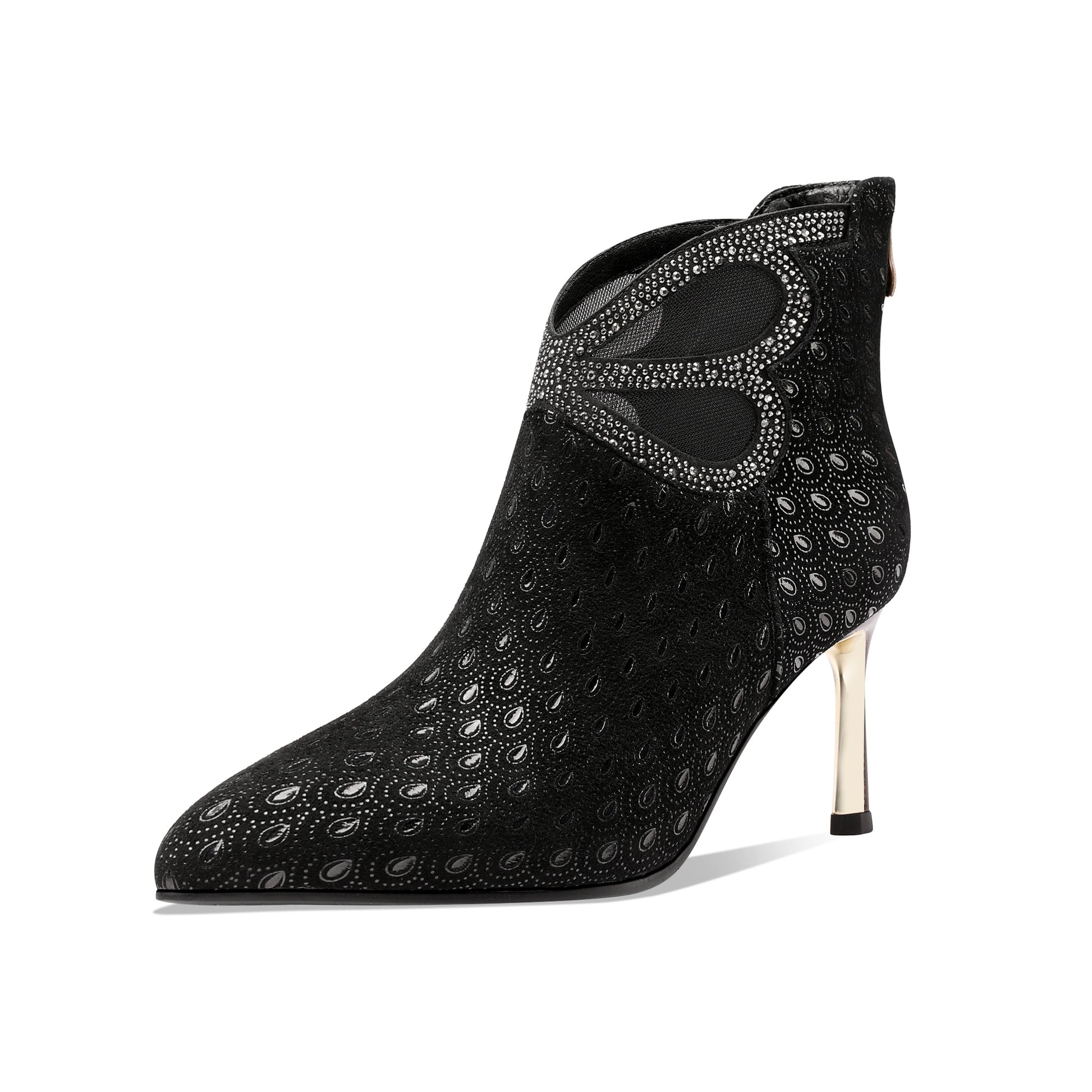 Graceful ankle boots are designed with leather, pointed toe, metal heel, glitter rhinestone and zip to keep up with fashion trend. These fashion booties can go with many different styles of outfits.