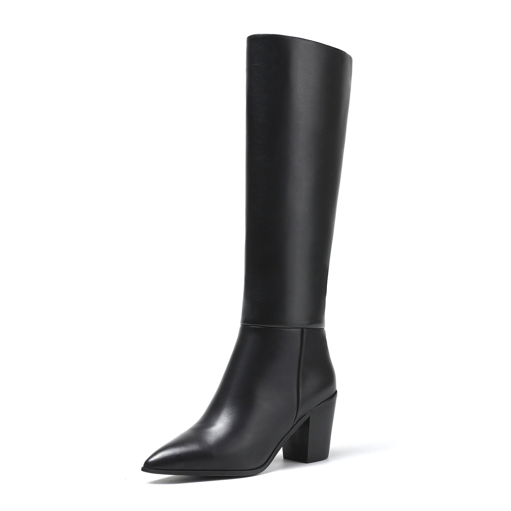 Classic black knee high boots designed with genuine leather and chunky heels can go with almost all your outfits.