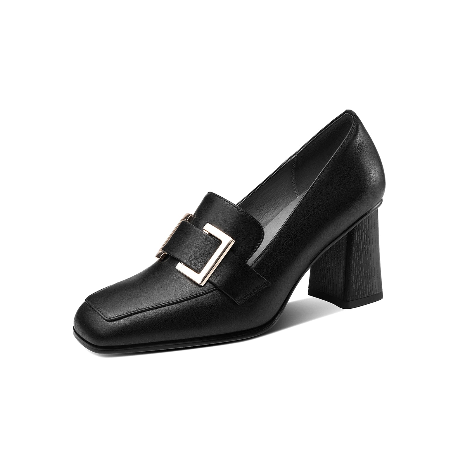Stylish pump shoes are designed with genuine leather, square toe, chunky heel, square metal pattern to keep up with fashion trend and give you visual enjoyment.