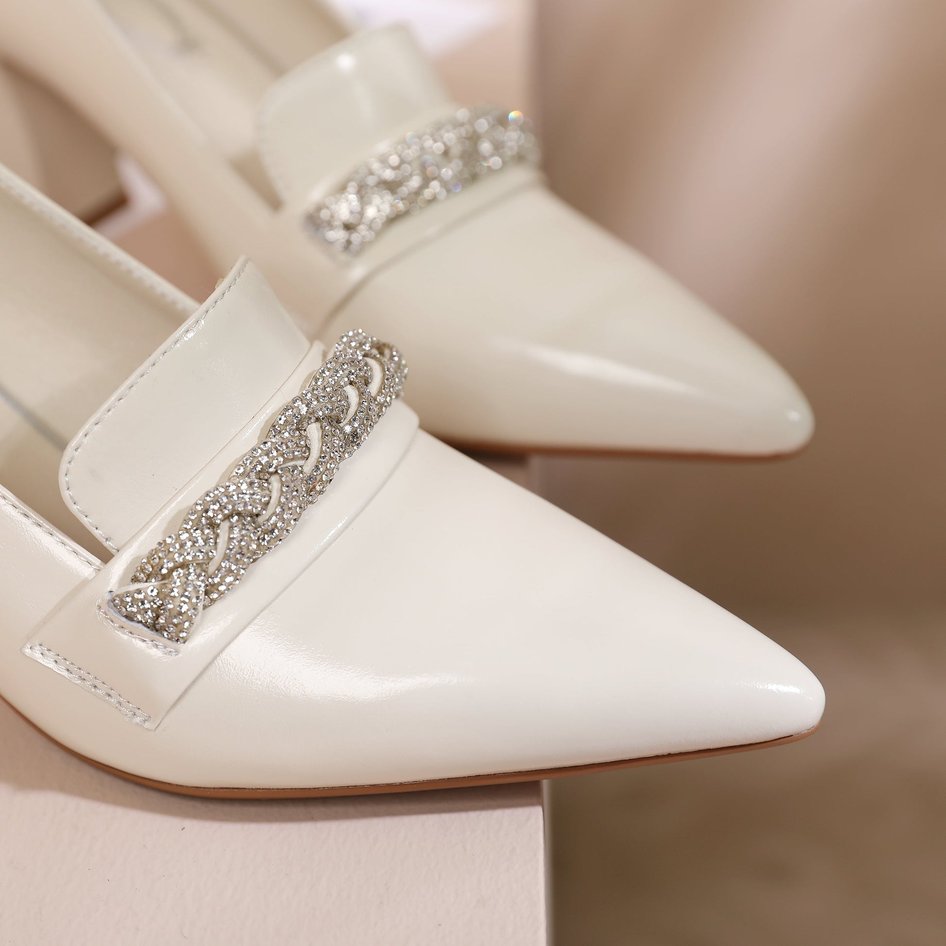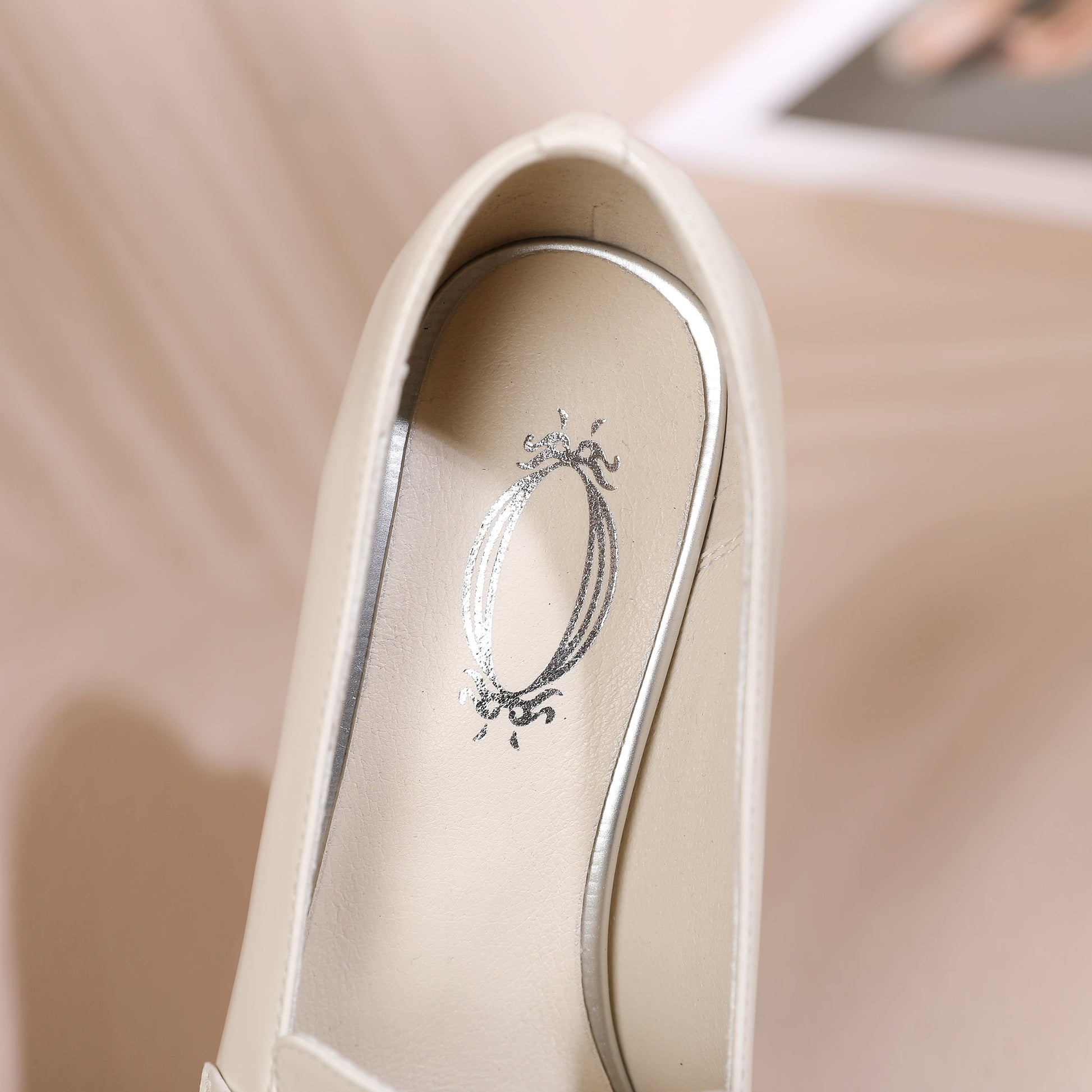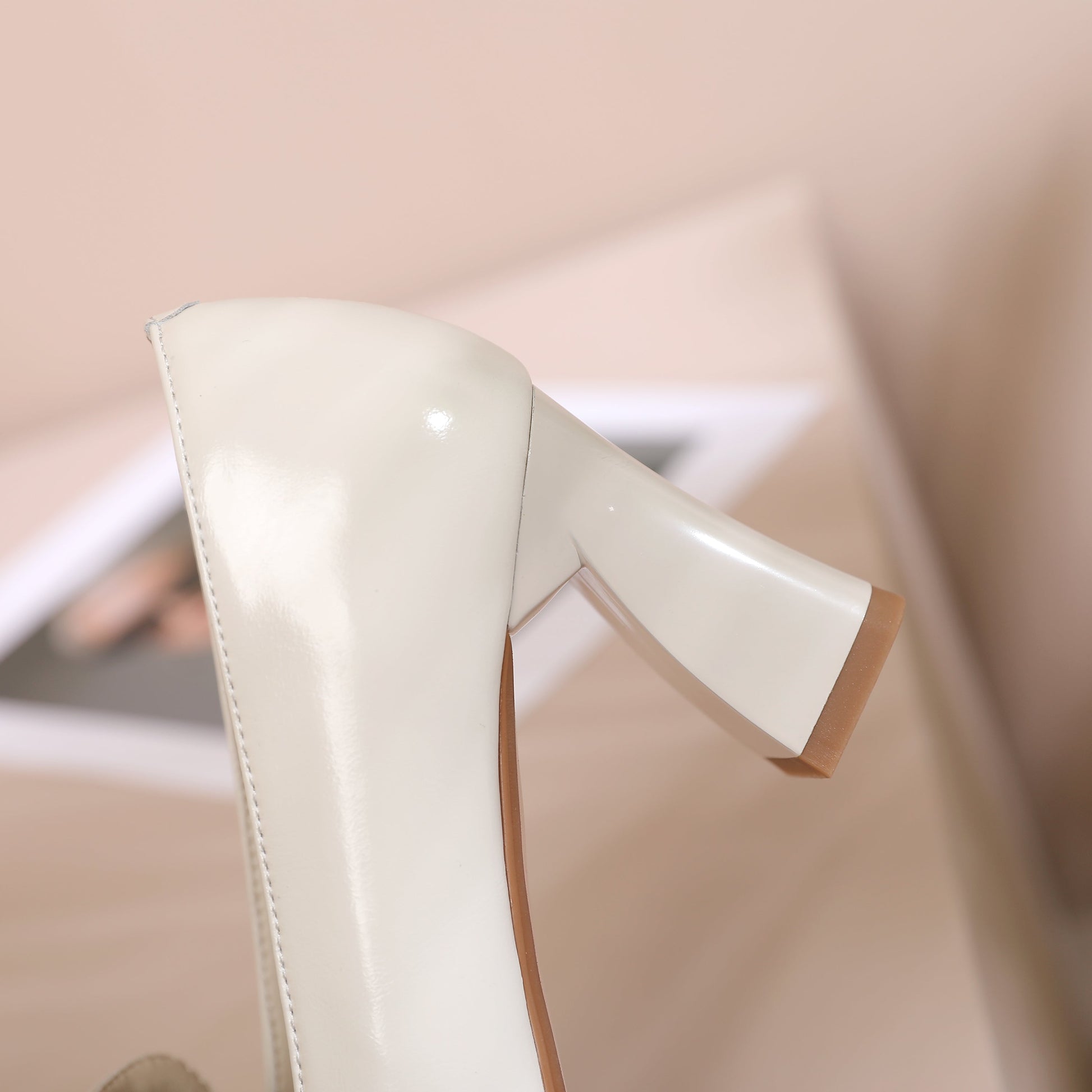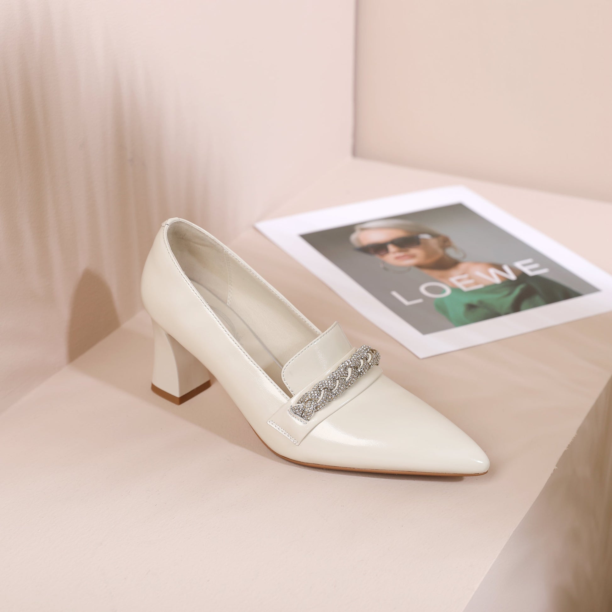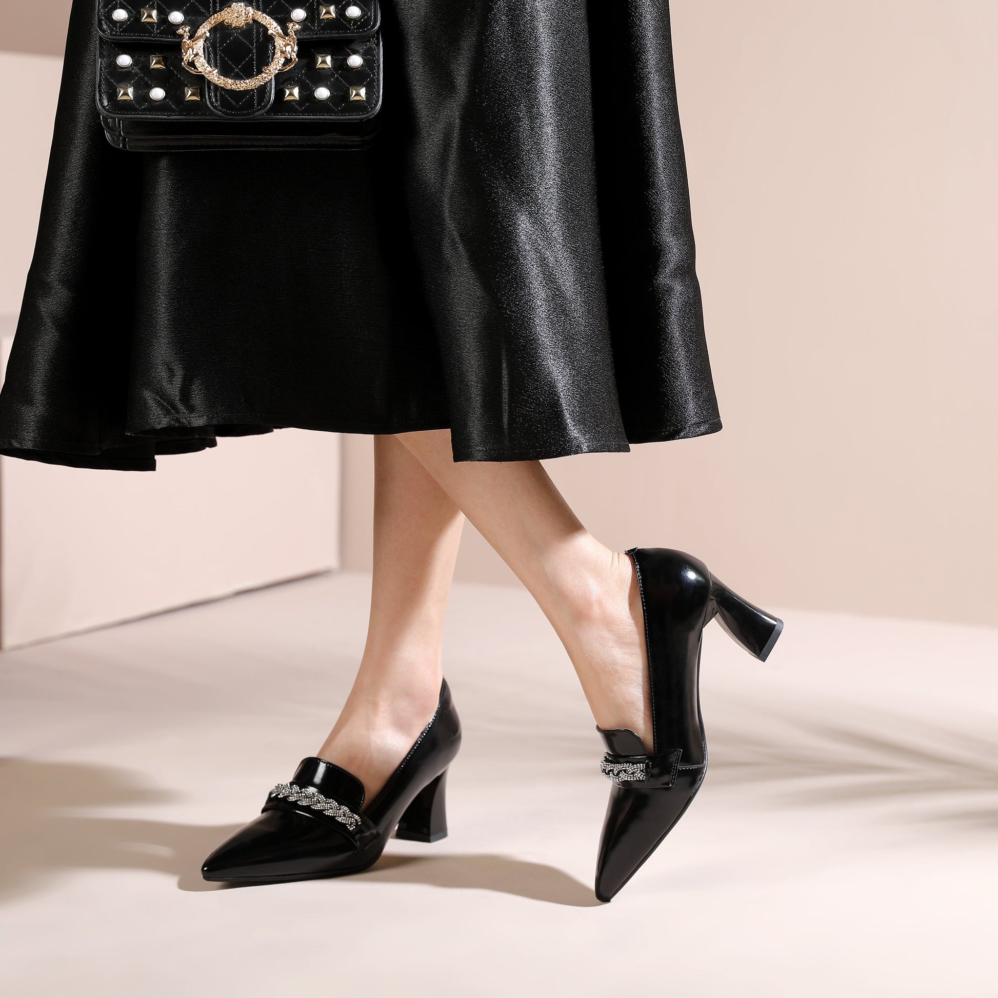 Genuine leather pumps shoes designed with pointed toe and mid chunky heels can go with almost all your outfits.