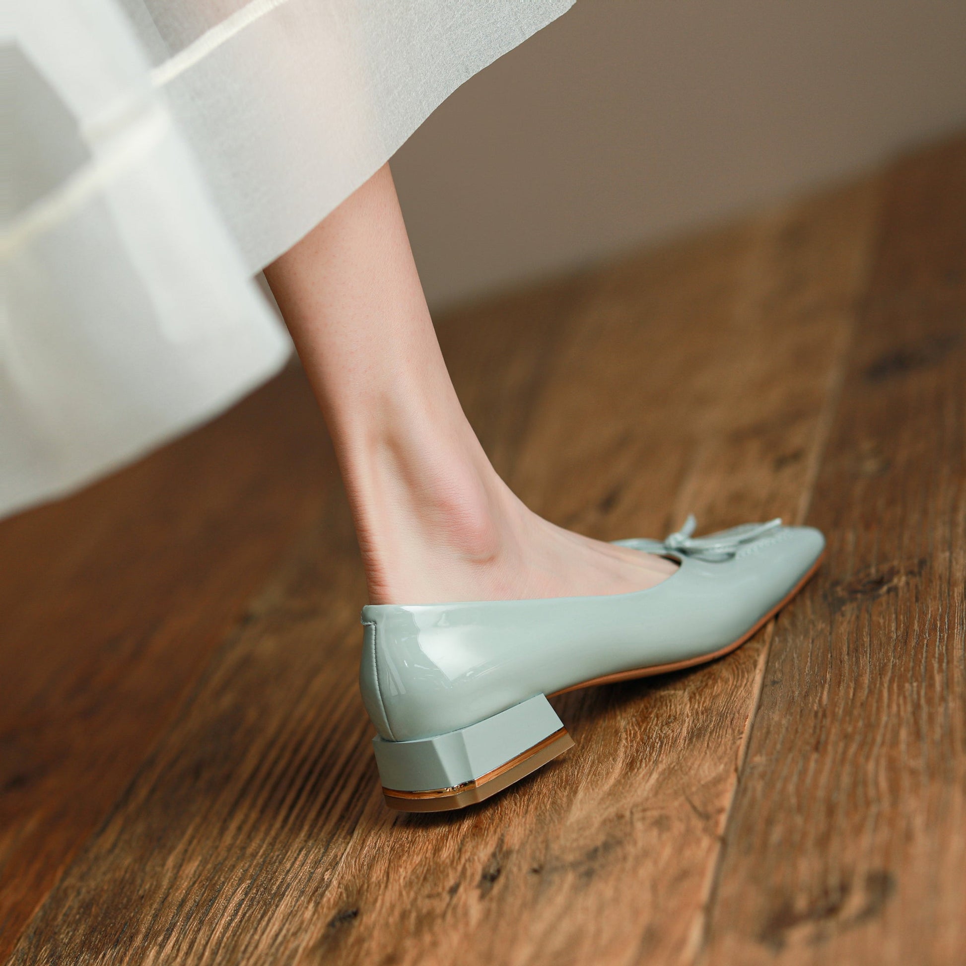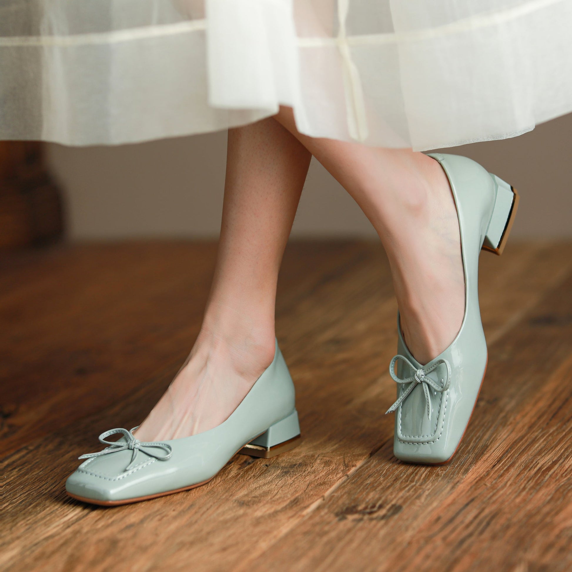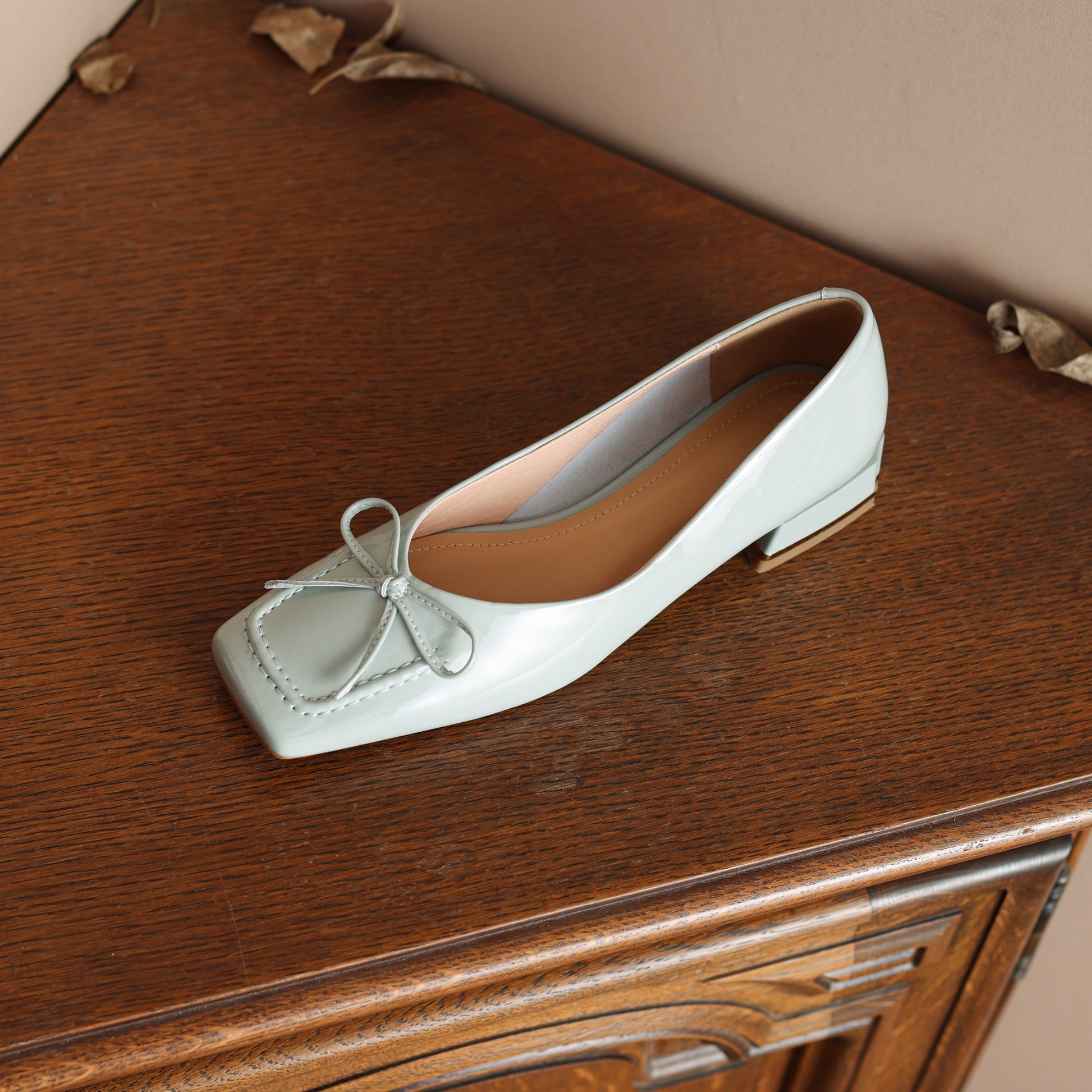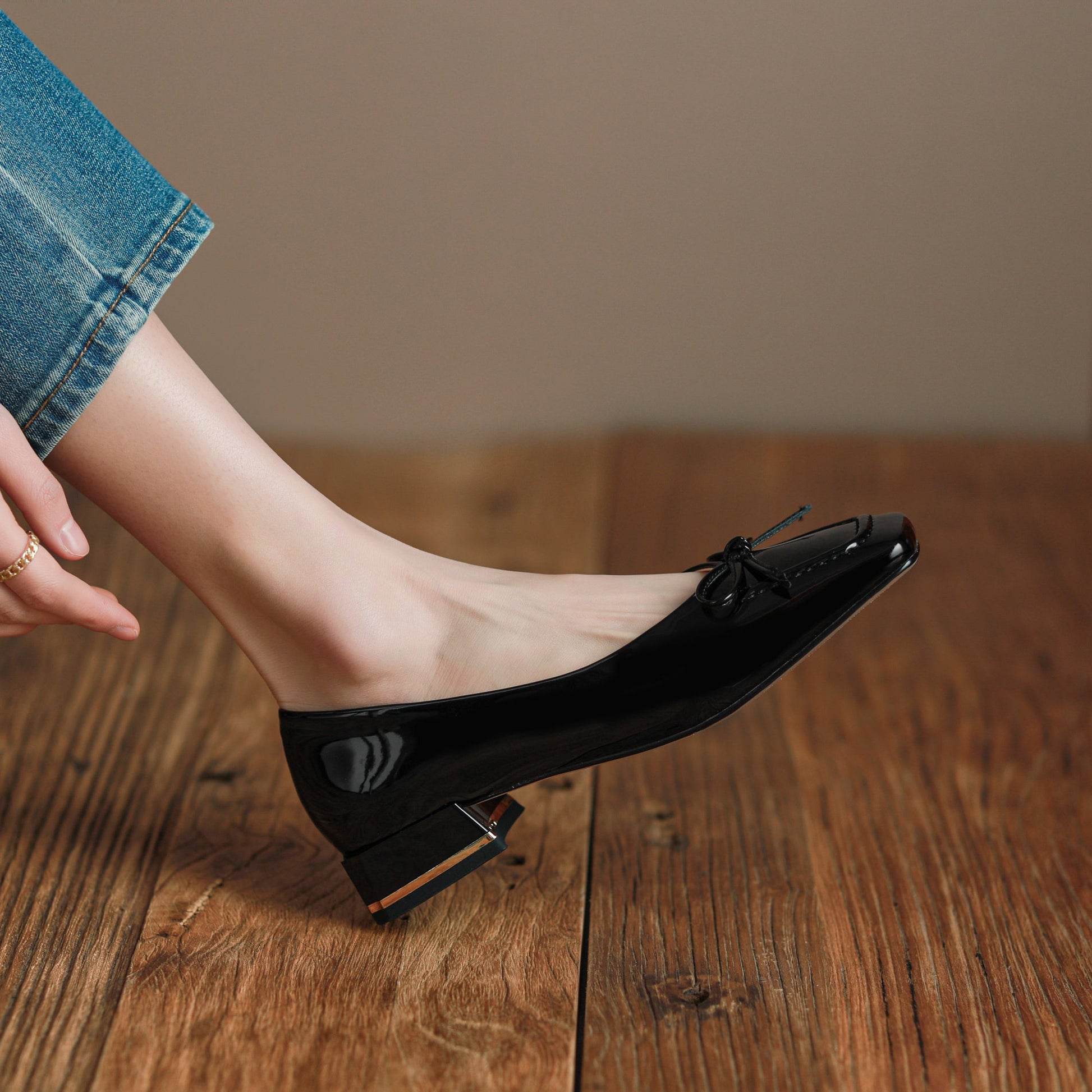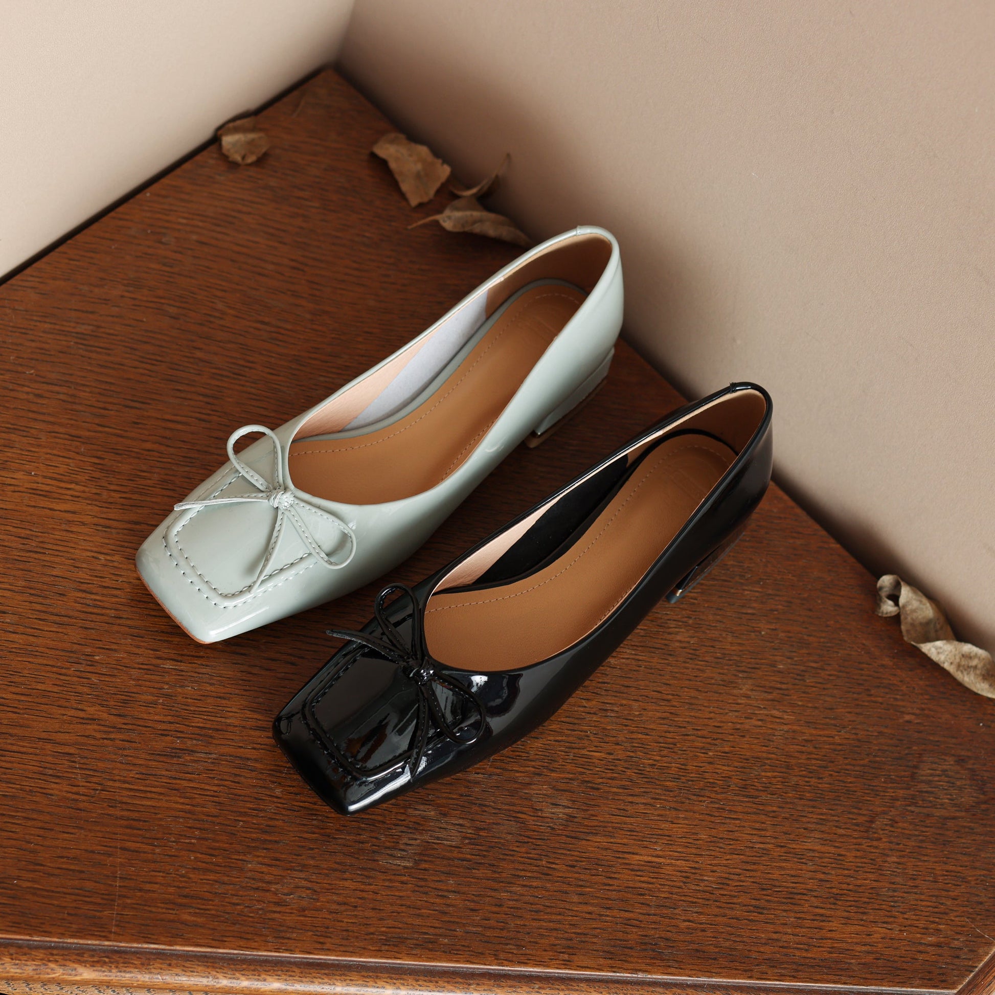 Nine Seven Glossy Patent Leather Women's Handmade Classic Square Toe Block Heel Slip On Loafer Pumps with Bowknot