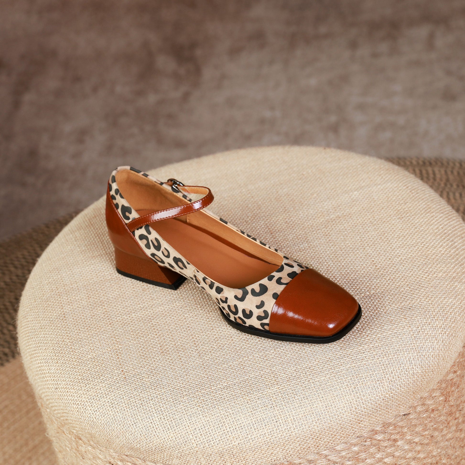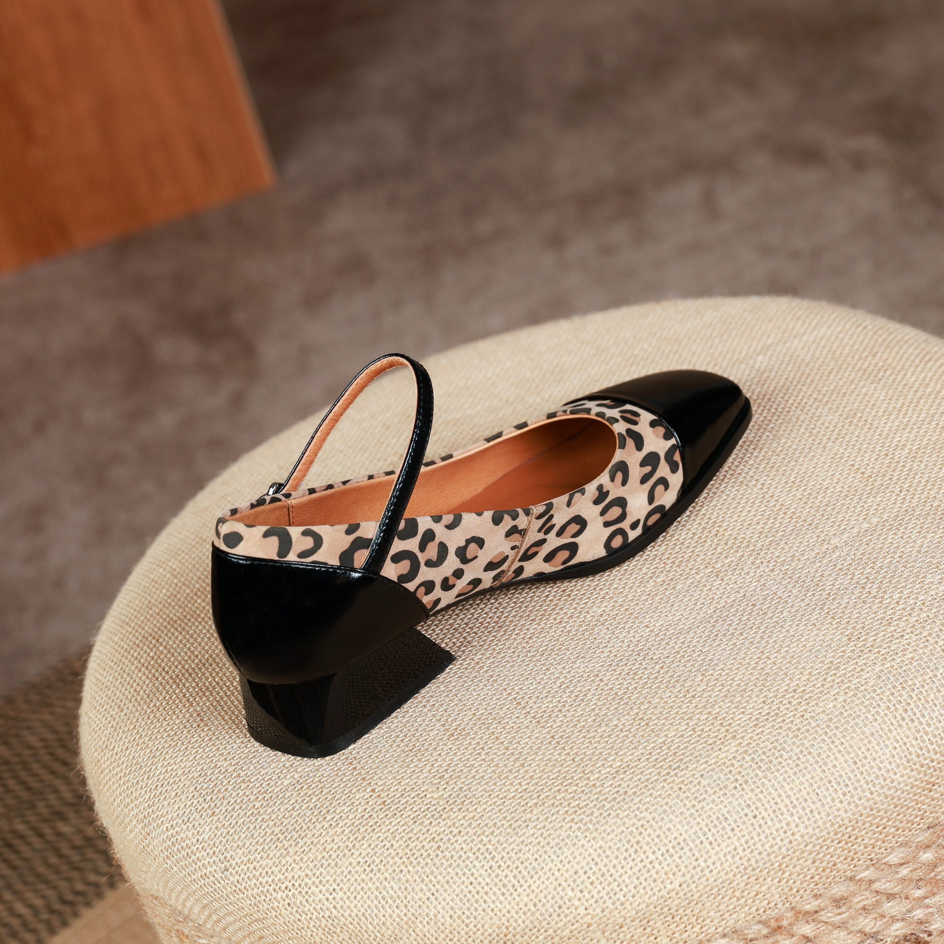 Nine Seven Women's Square Toe Leopard Print Genuine Leather Handmade Low Heel Chic Mary Jane Shoes