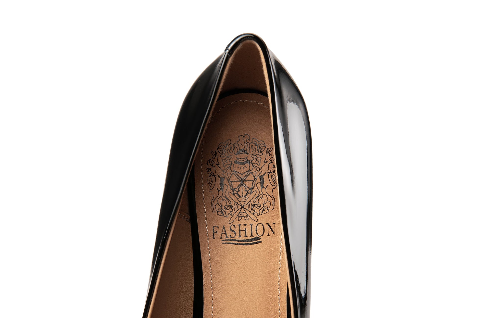 Elegant pumps shoes designed with patent leather, pointed toe and chunky heels to keep up with fashion trend.
