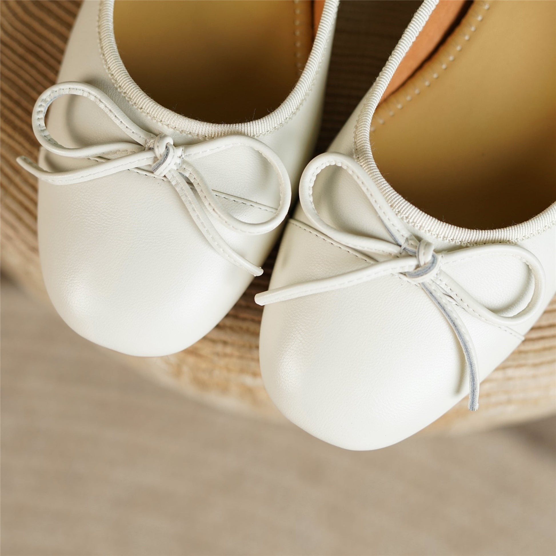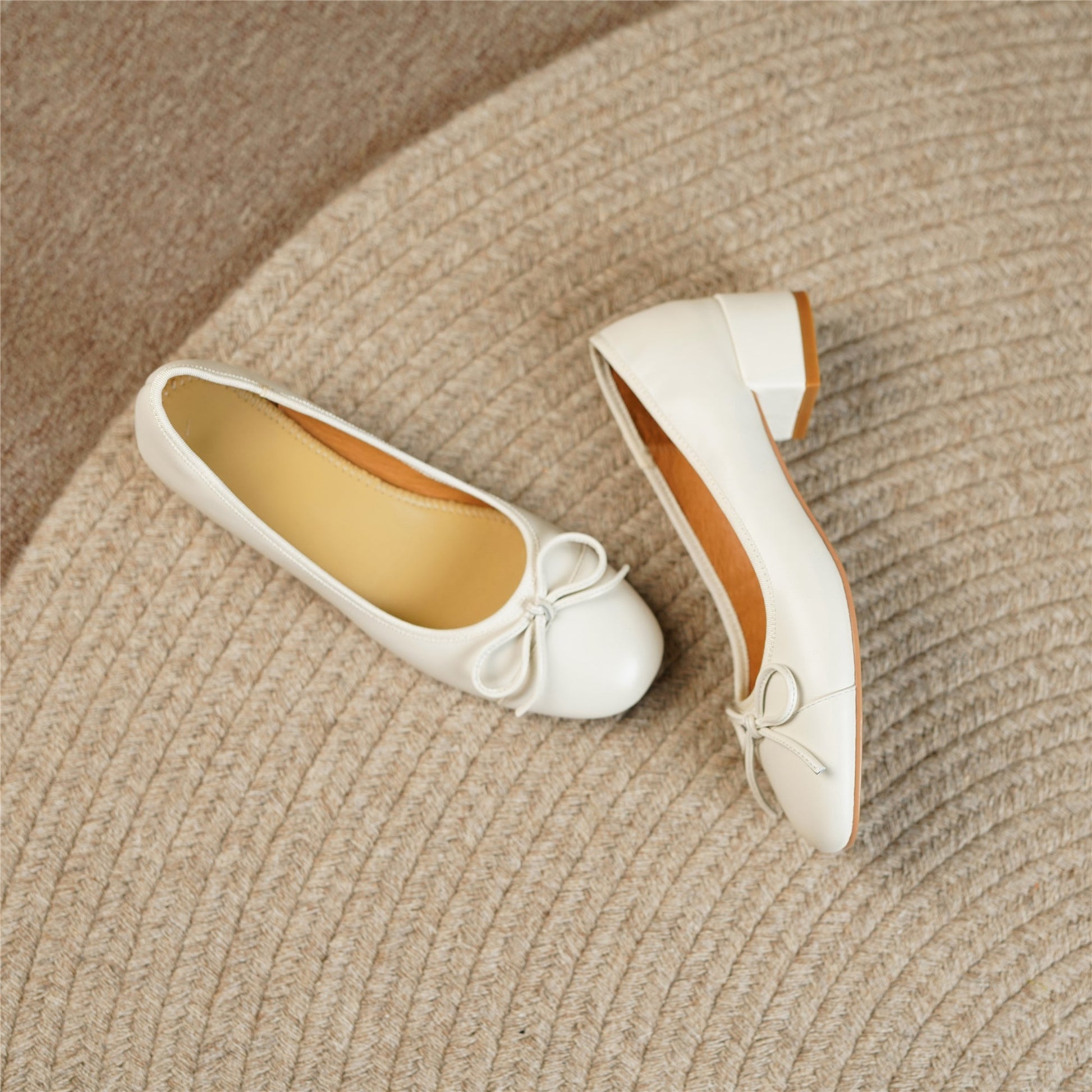 Cute bow knot ballet pumps designed with round toe low block heel are fit to the ball of the foot for comfort.