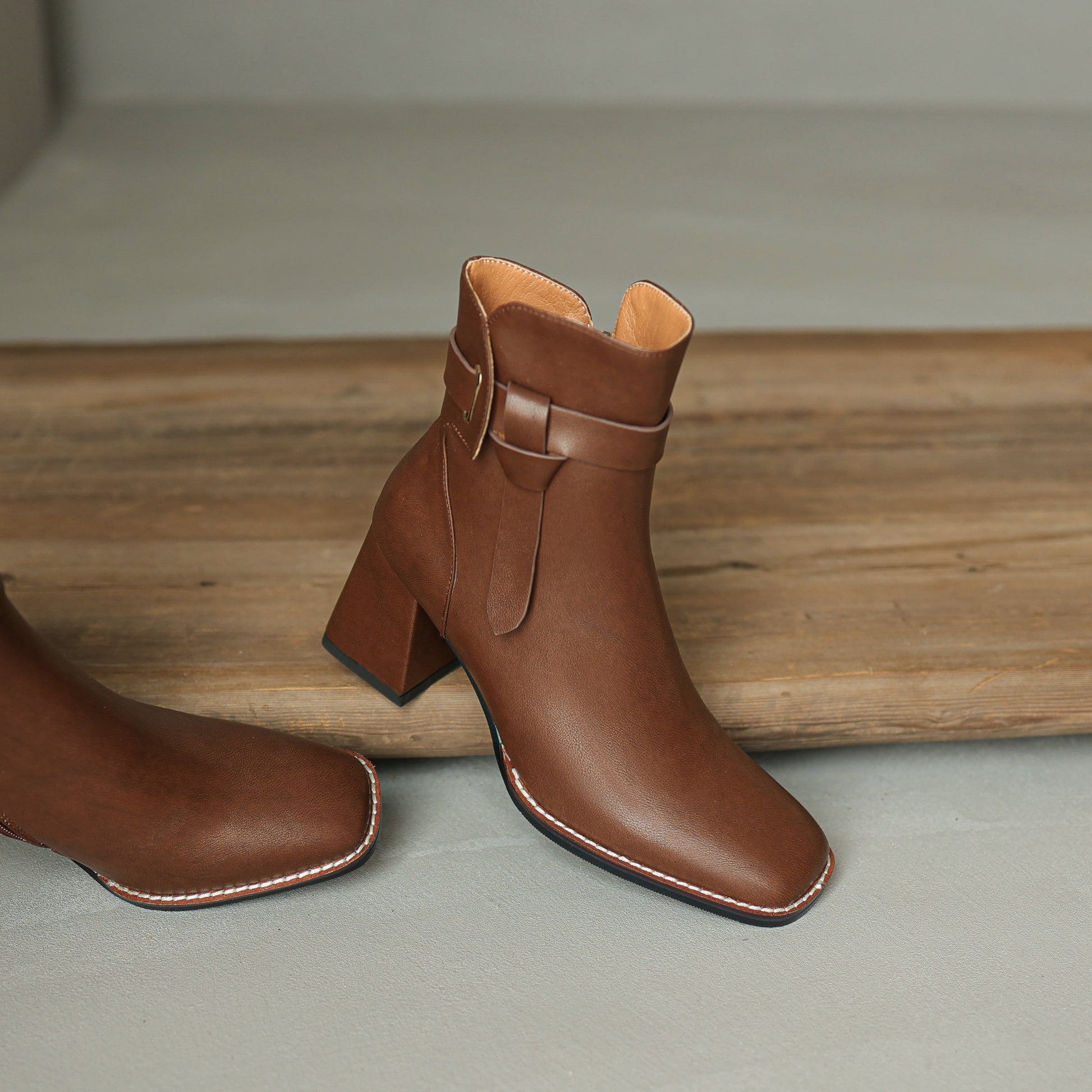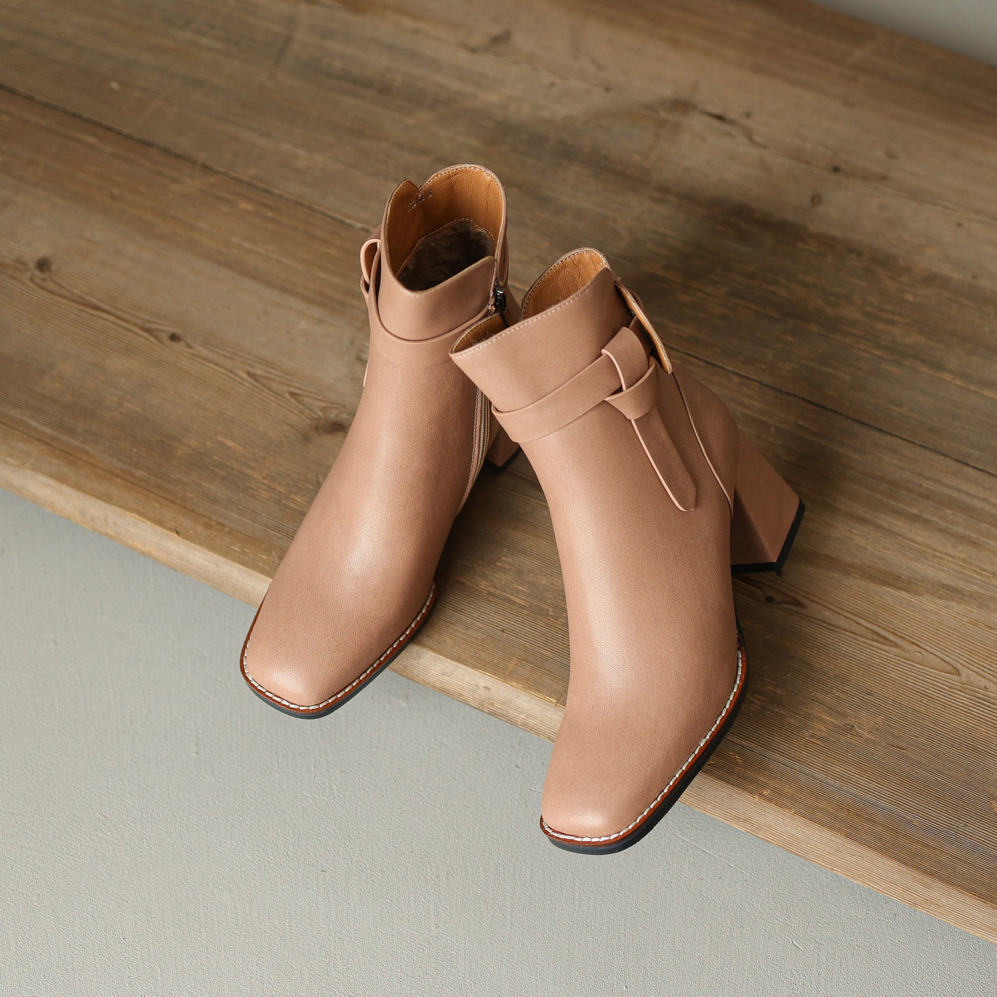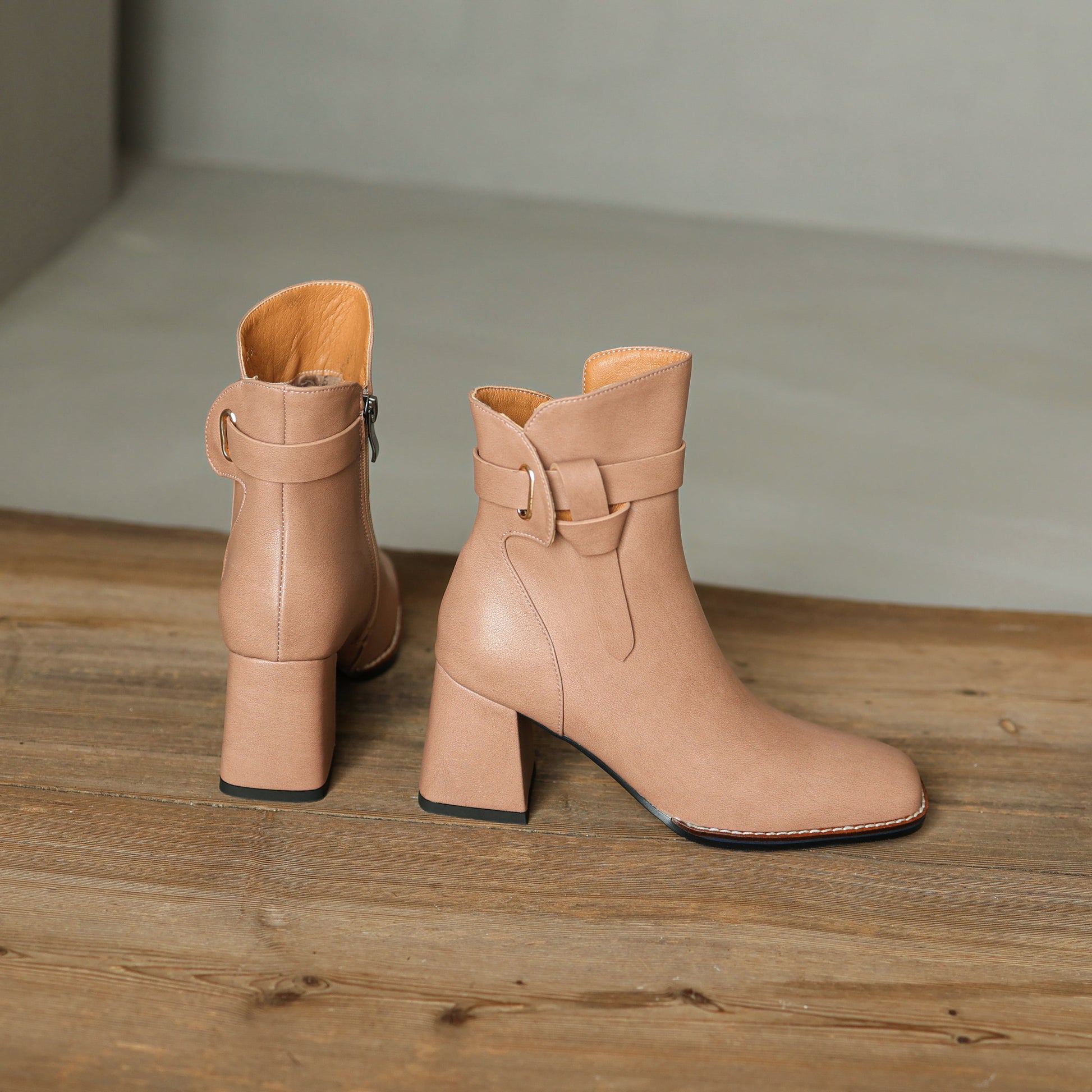 Genuine leather ankle booties designed with square toe and mid block heel are comfortable and stylish for any season.