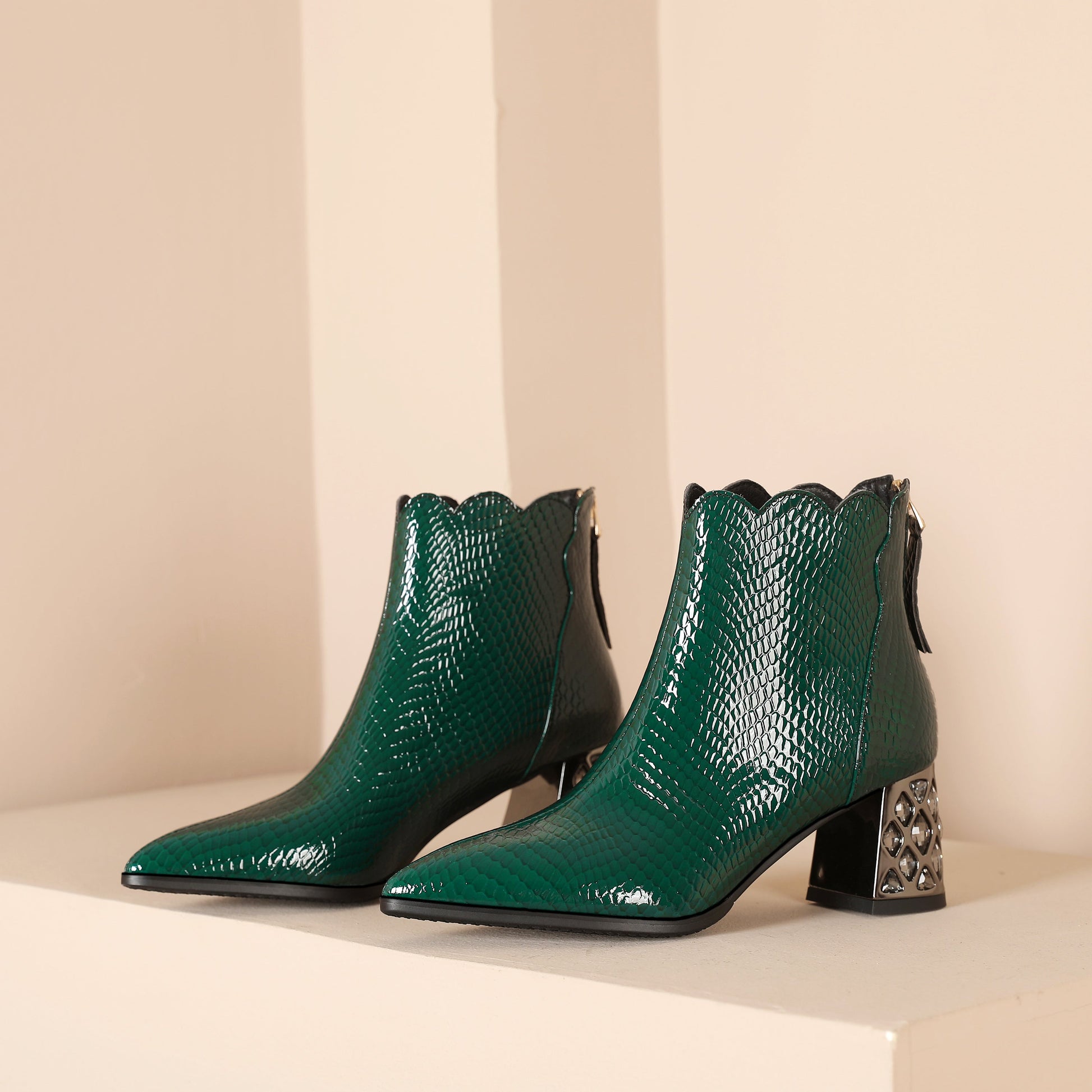 Nine Seven Handmade Women's Patent Leather Front Zipper Pointed Toe Mid Rhinestones Chunky Heel Ankle Boots
