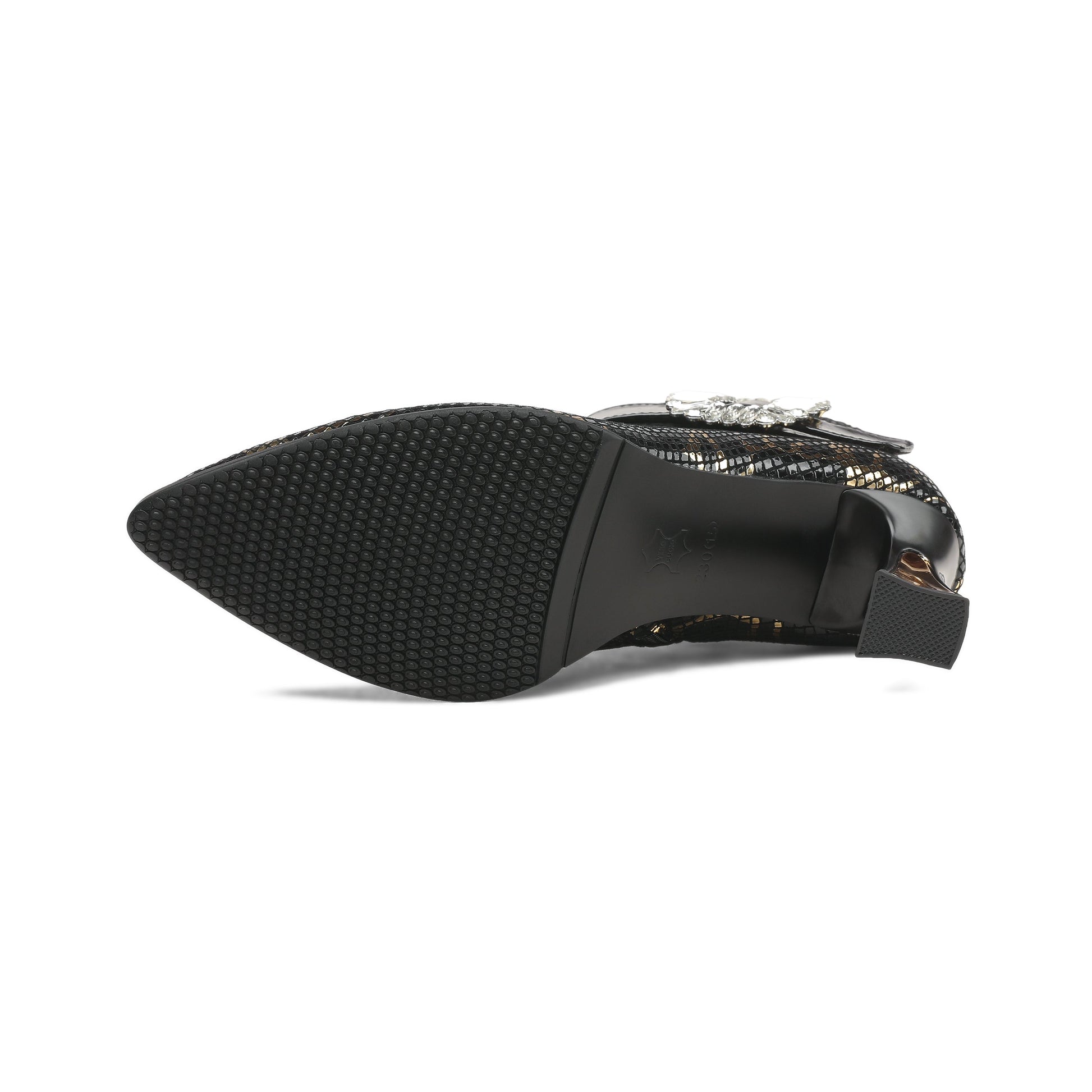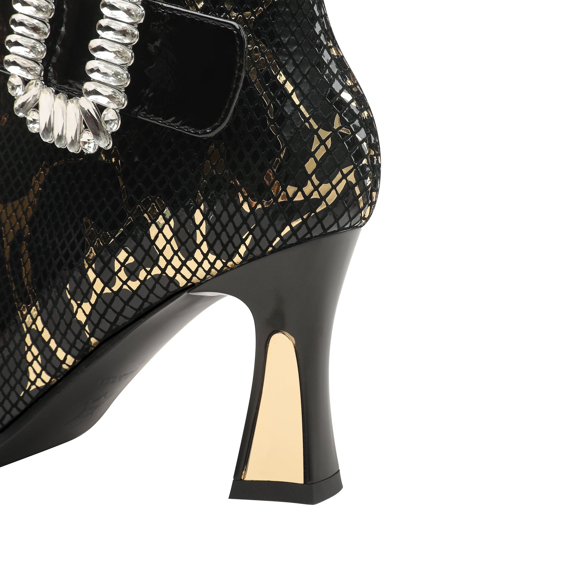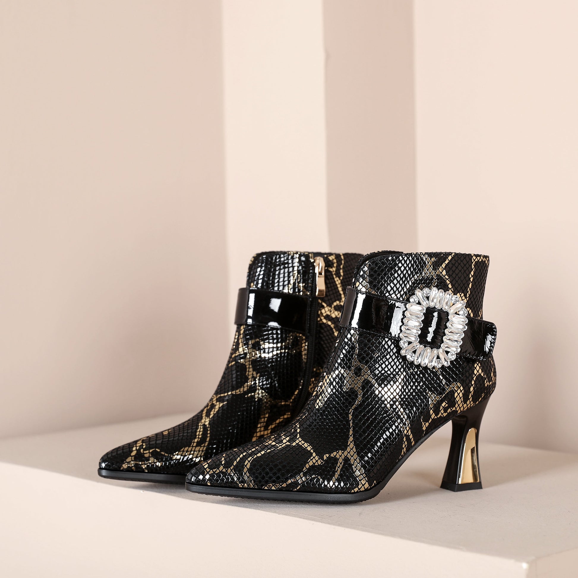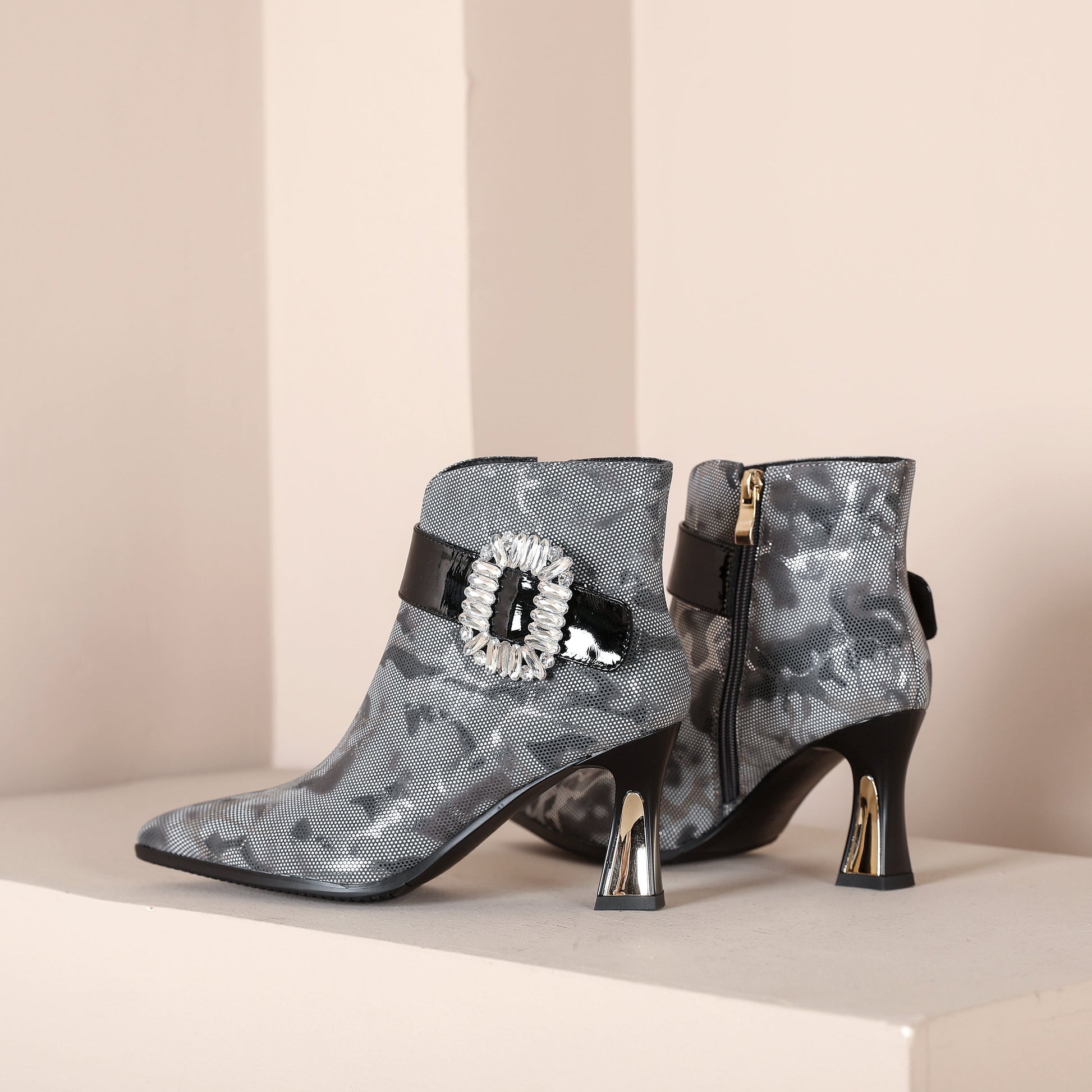 Nine Seven Handmade Women's Genuine Leather Assorted Color Rhinestones Square Buckle Printed Side Zipper Pointed Toe Mid Stiletto Heel Ankle Boots