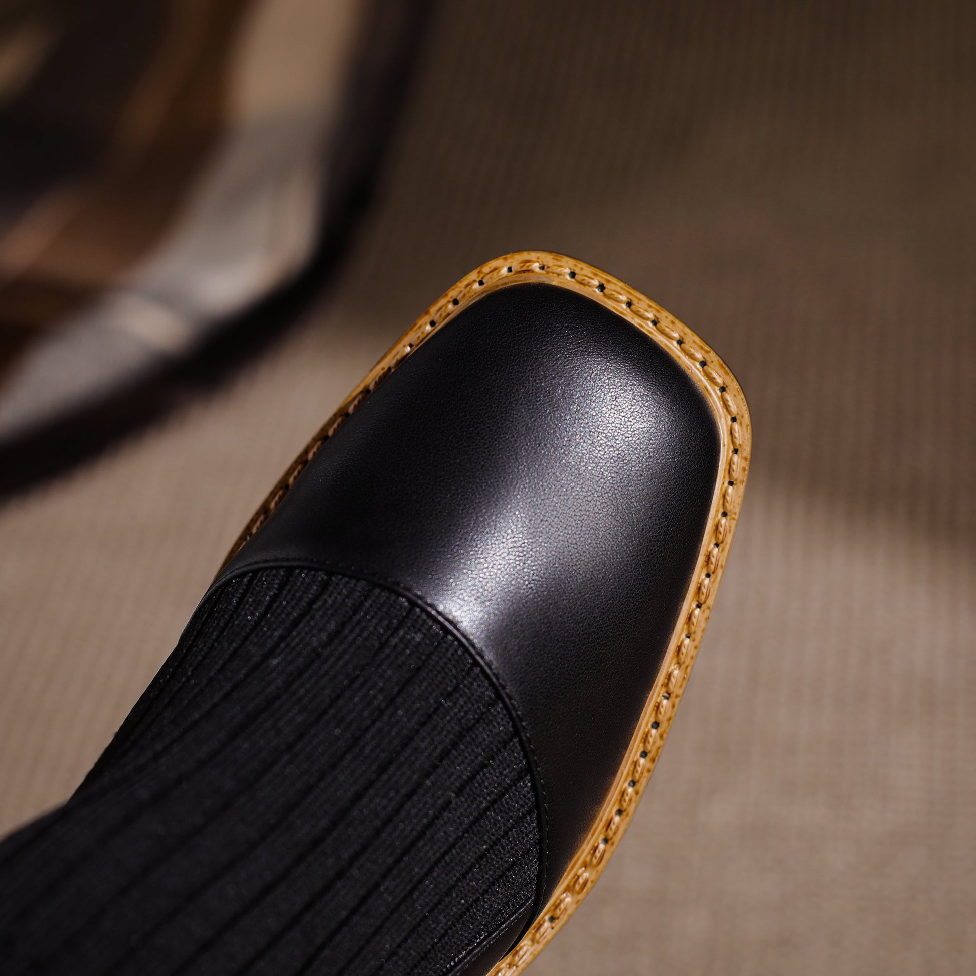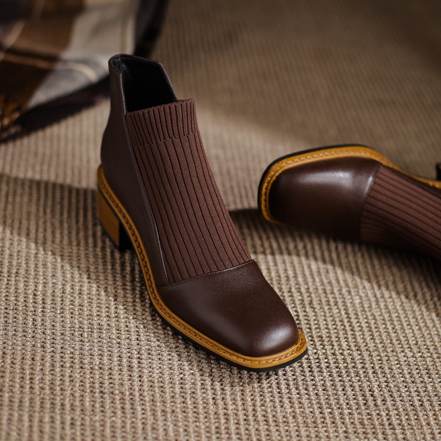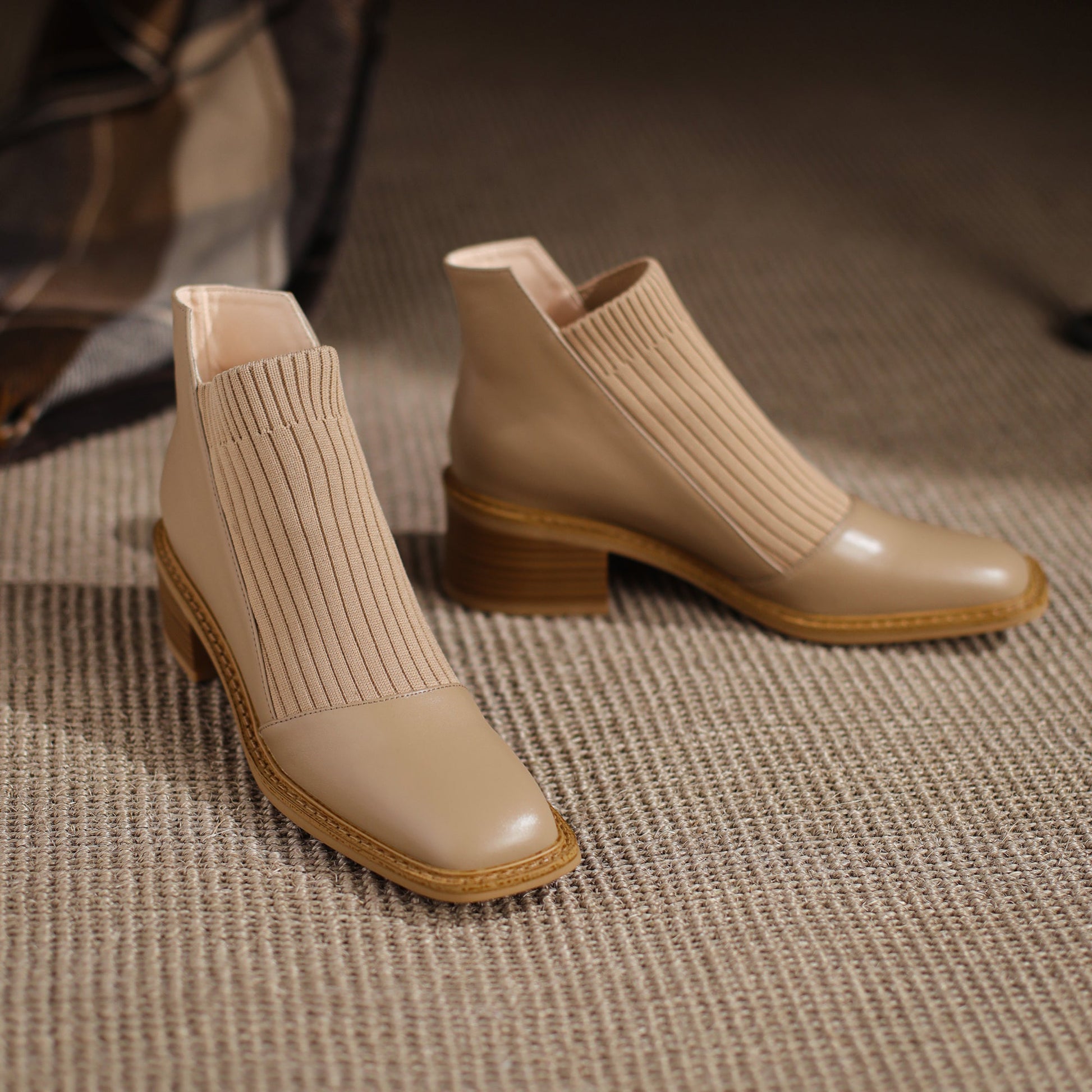 Nine Seven Handmade Women's Genuine Leather Casual Slip on Stretched Woolen Square Toe Low Block Heel Ankle Boots