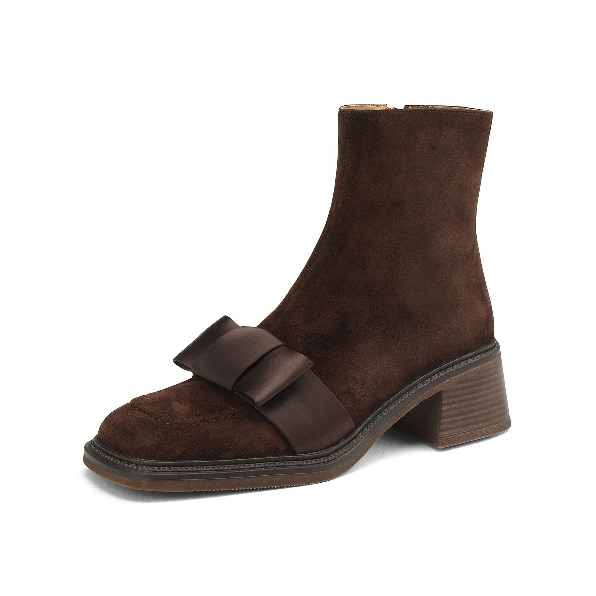 Nine Seven Handmade Women's Suede Leather Bow Décor Comfort Square Toe Side Zipper Mid Block Heel Ankle Boots Shoes