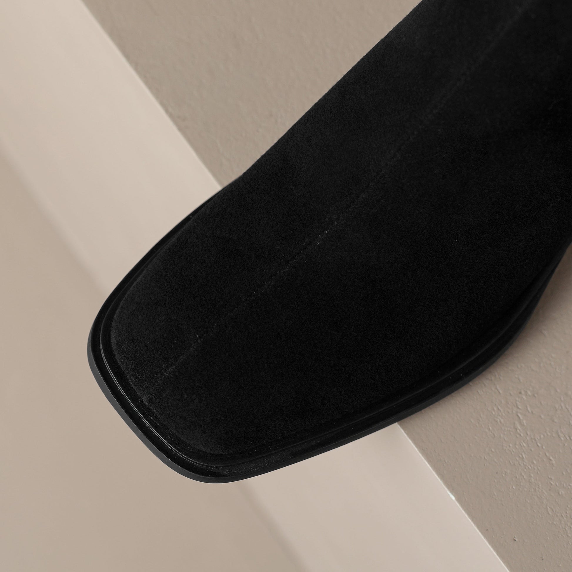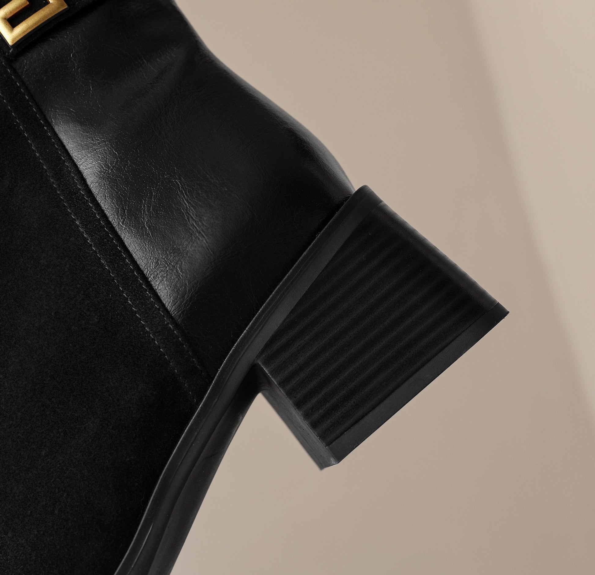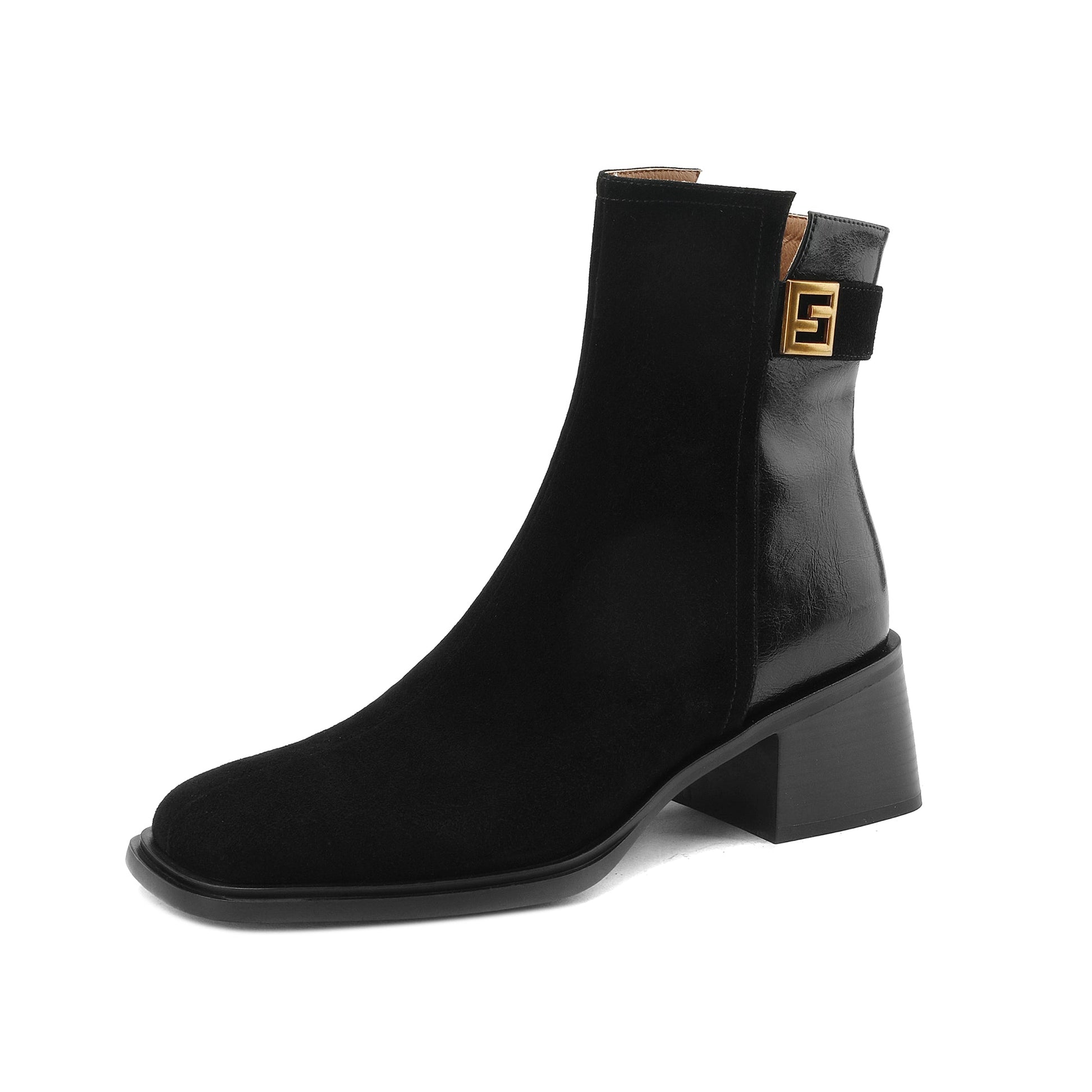 Genuine leather ankle boots designed with round toe, side zipper, buckle and low chunky heels to keep up with fashion trend.
