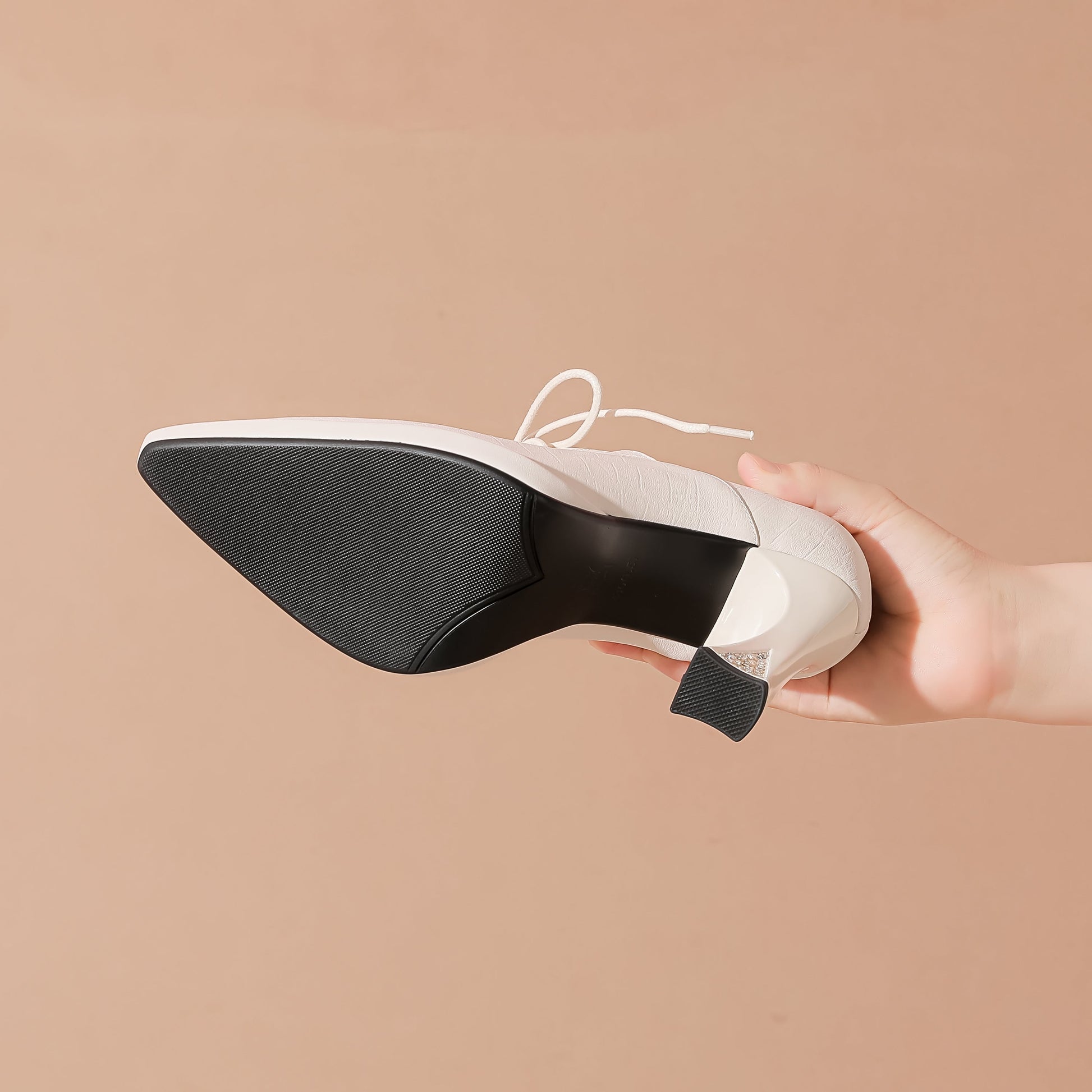 Genuine leather pumps shoes designed with pointed toe, selftie and high heels to keep up with fashion trend.
