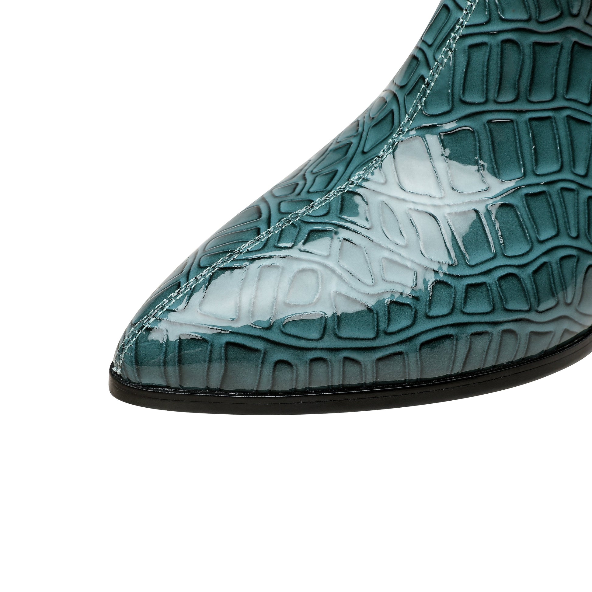 Nine Seven Handmade Women's Patent Leather Patchwork Color Snakeskin Pointed Toe Side Zipper Mid Block Heel Ankle Boots Shoes