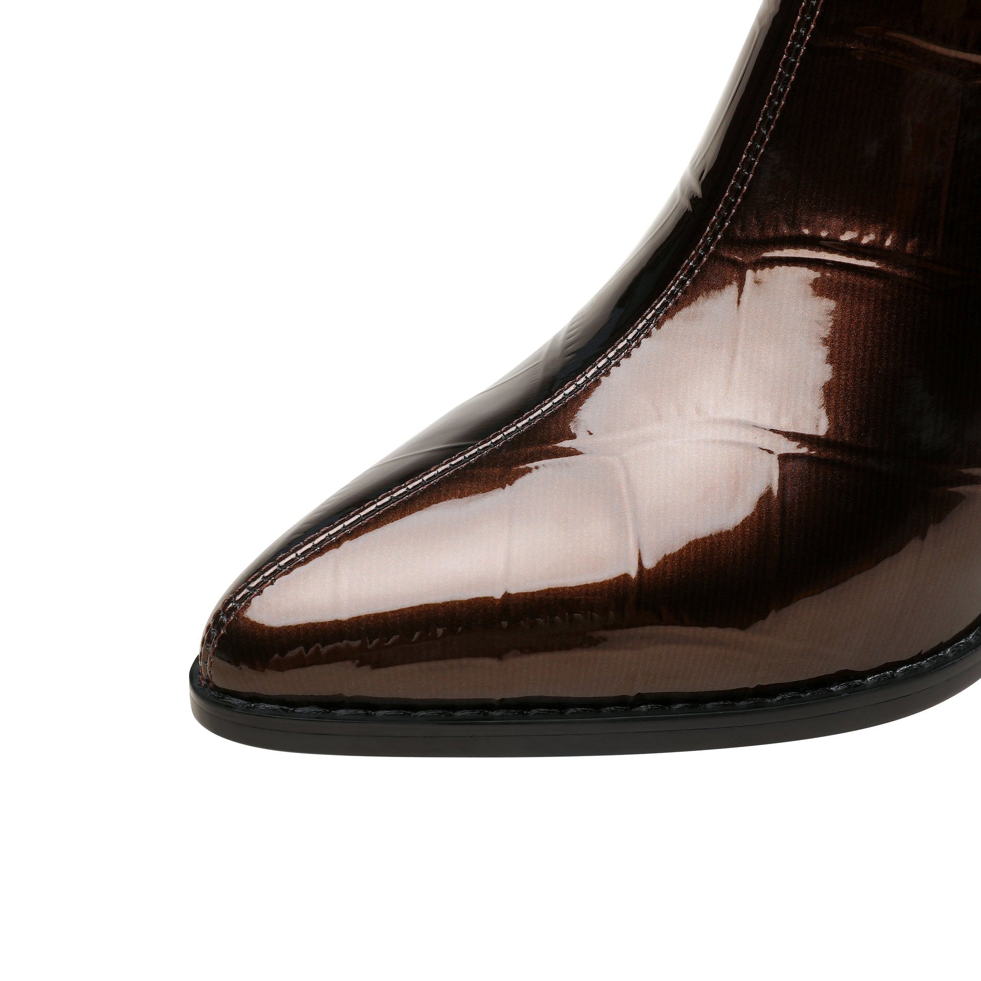 Pointed toe, mid block heel, side zipper with glittering leather are all the characteristics of women ankle boots, never outdated! The stylish ankle booties for women have been popular in recent years.