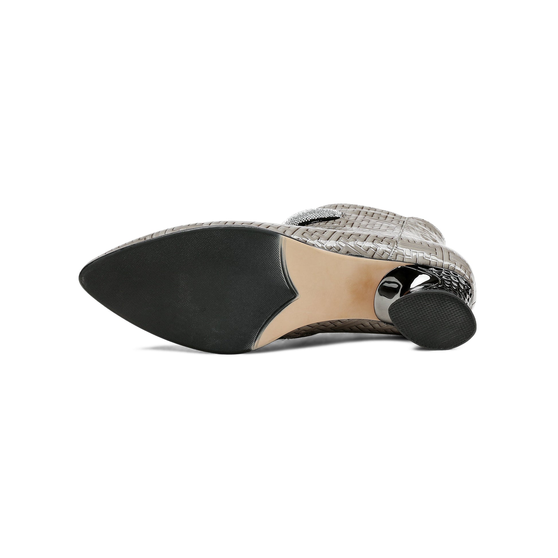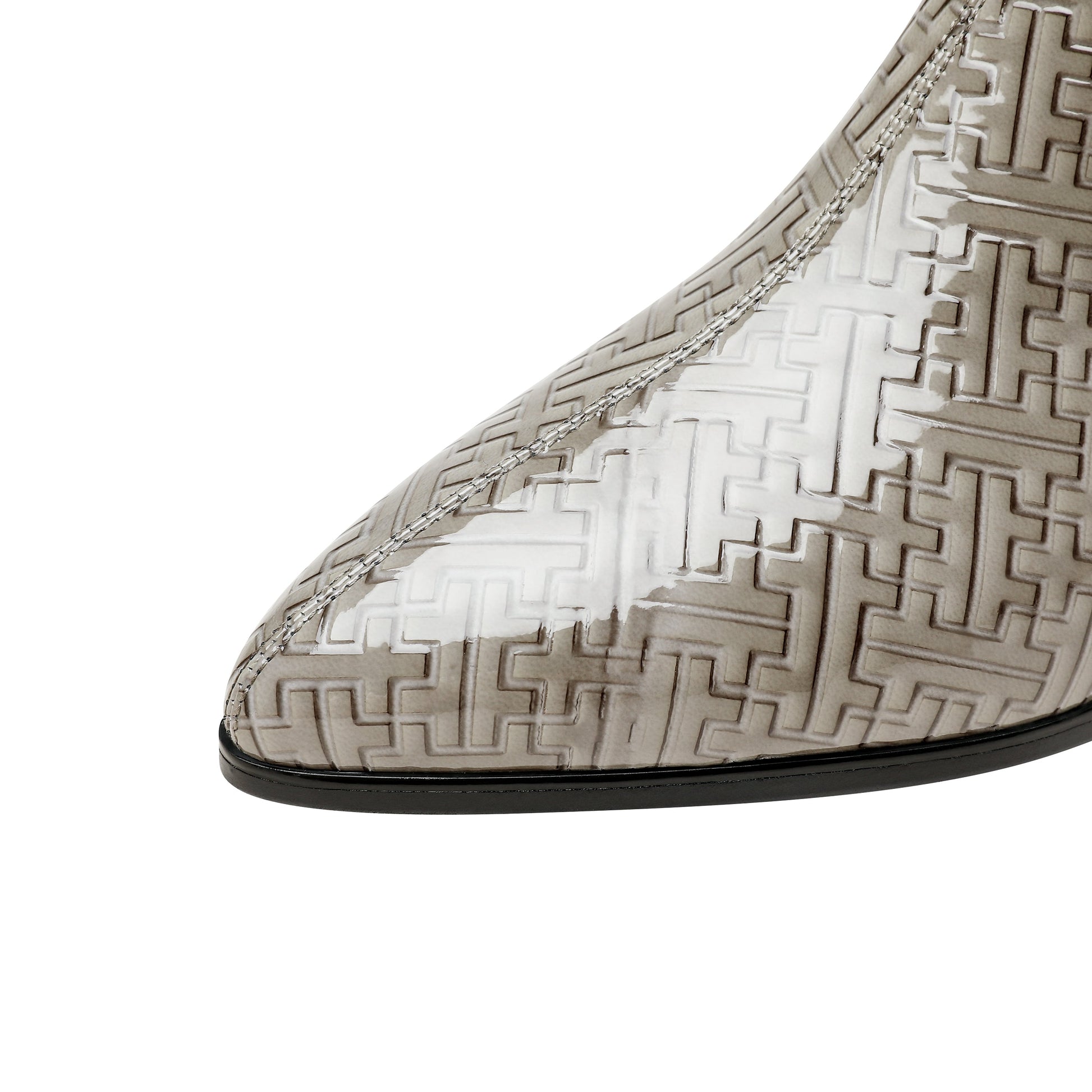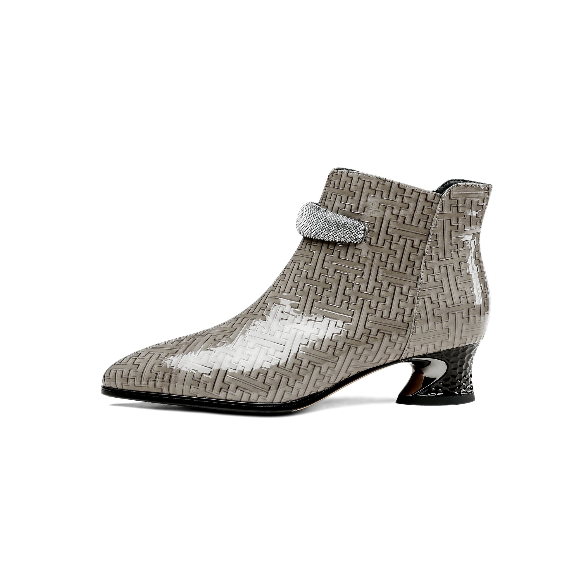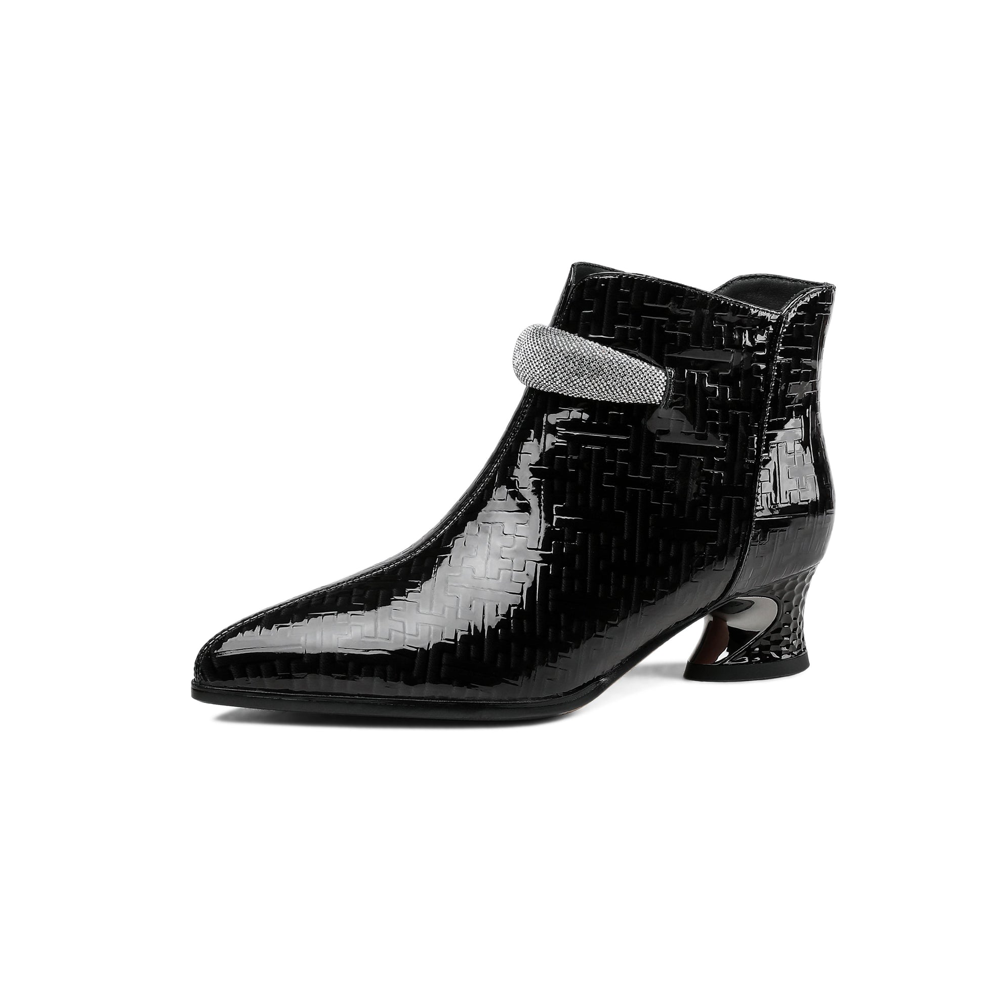 Glossy patent leather ankle boots designed with pointed toe, side zipper and low chunky heels can make you feel comfortable with every steps.