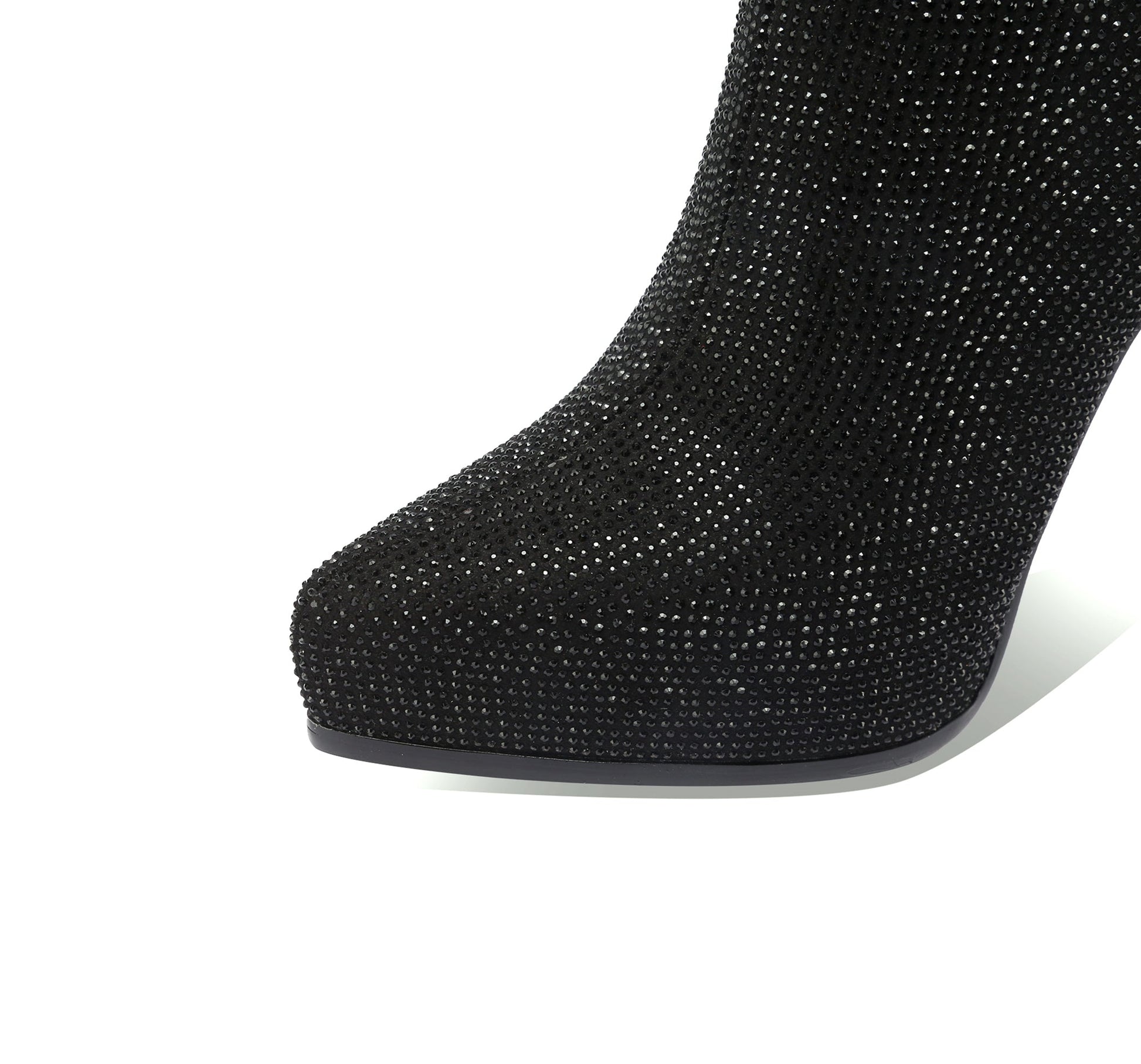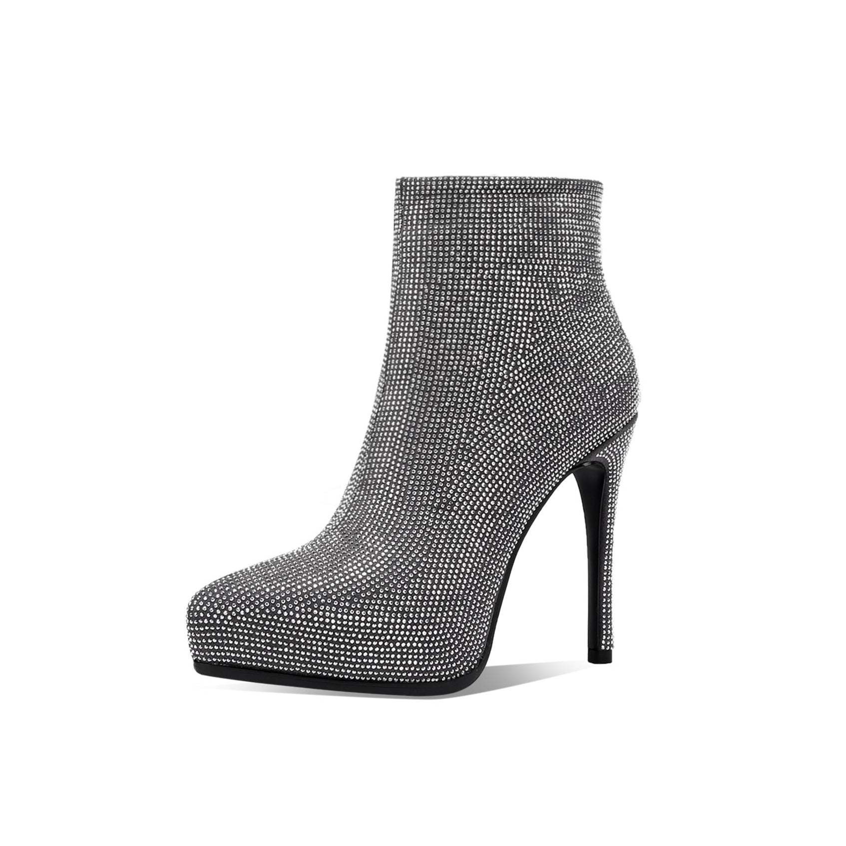 Nine Seven Handmade Women's Genuine Leather Glittering Rhinestones Platform Side Zipper Pointed Toe High Stiletto Heel Ankle Boots