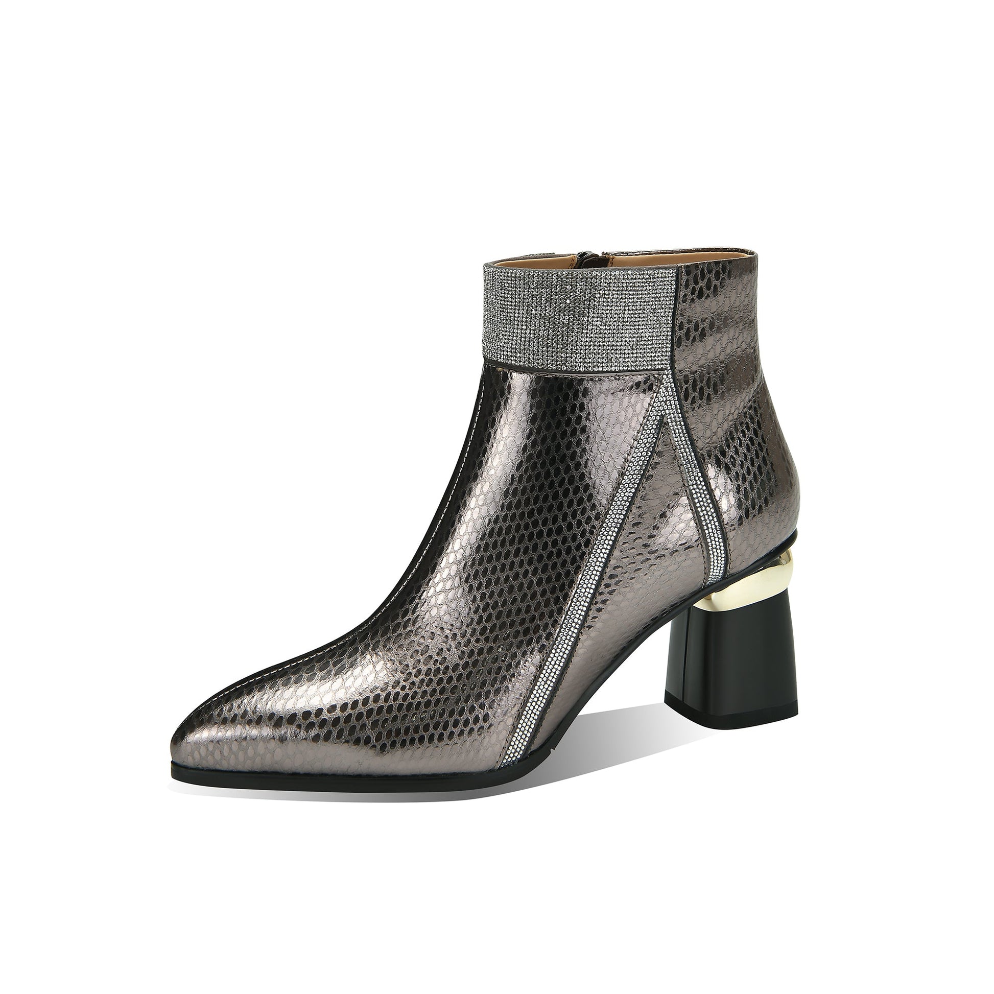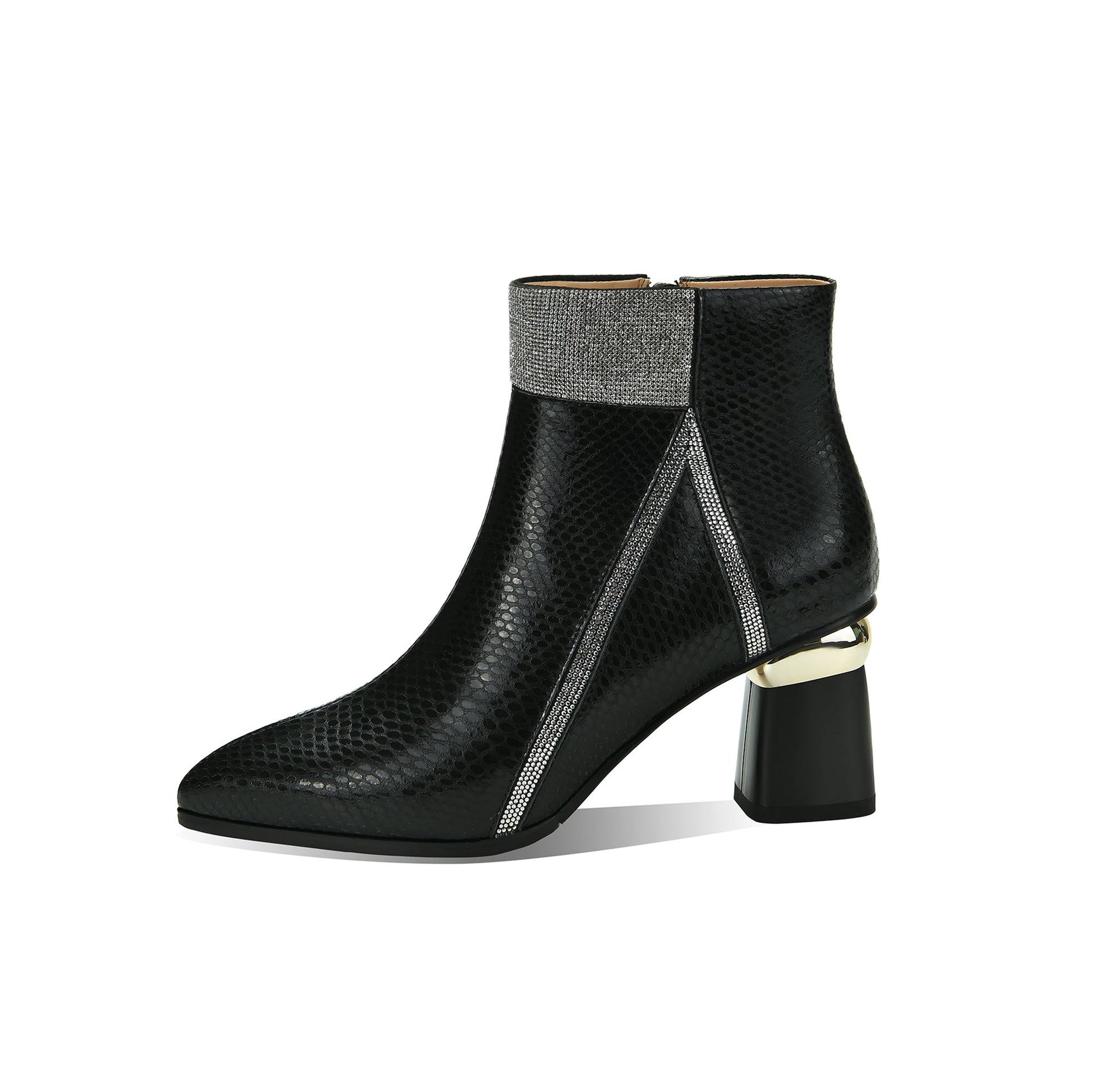 Nine Seven Handmade Women's Genuine Leather Printed Glossy Side Zipper Pointed Toe Mid Chunky Heel Ankle Boots