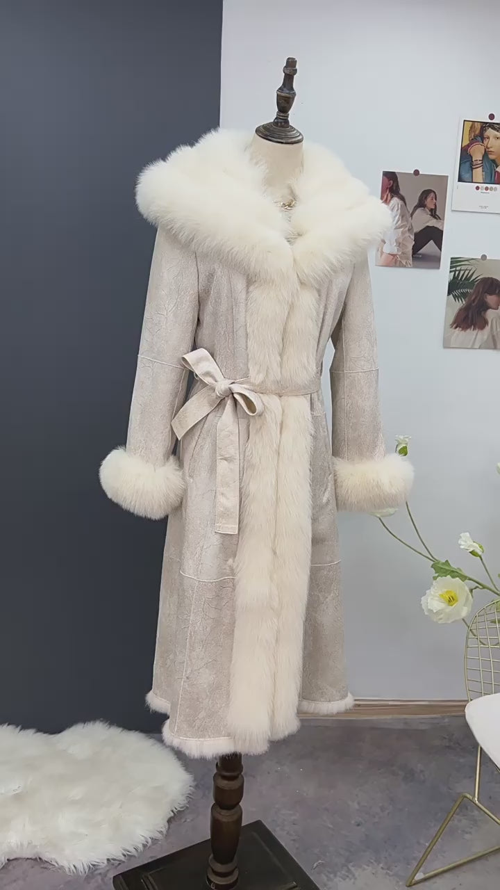 Fox fur in collar and cuff (non-removable), rabbit hair and suede nap for the whole coat