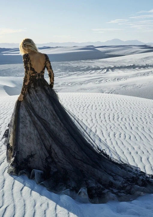 Nine Seven 3D Flowers Plug V-Neck Long Sleeves Scoop Back A-Line Black Wedding Dress Customization